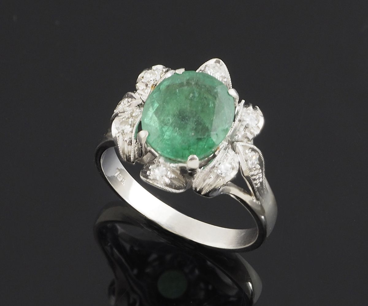 Anello in oro bianco con diamanti e pietra verde al centro (smeraldo?)Misura 14