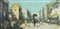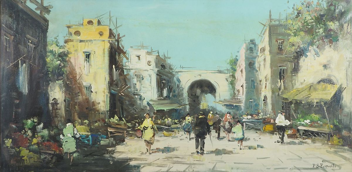 Pasquale Salvatore Esposito 1913-? "Giornata di mercato" cm. 50x100 - olio su tela Firmato b. a d. Al retro etichetta Istituto Nazionale d'Arte.