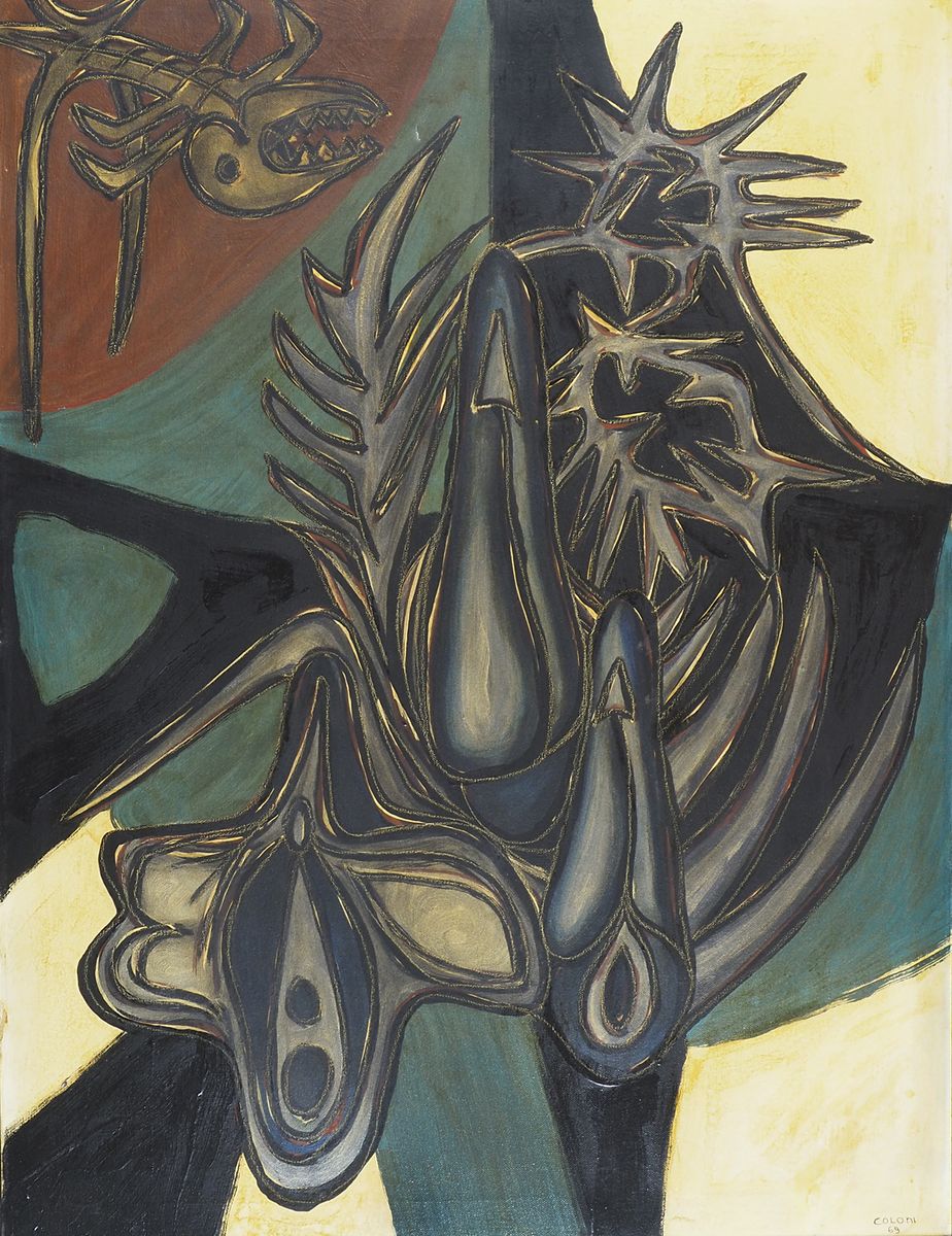Sabino Coloni Trieste 1931-1975 "Ecologia diversa" cm. 70x60 - olio su tela Firmato b. a d. e datato '69.