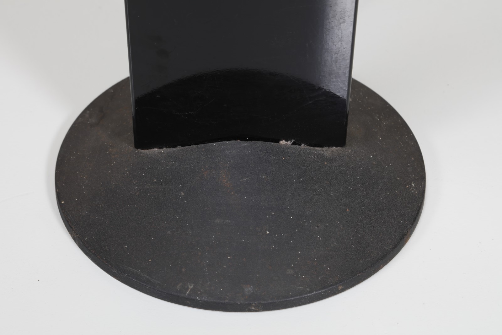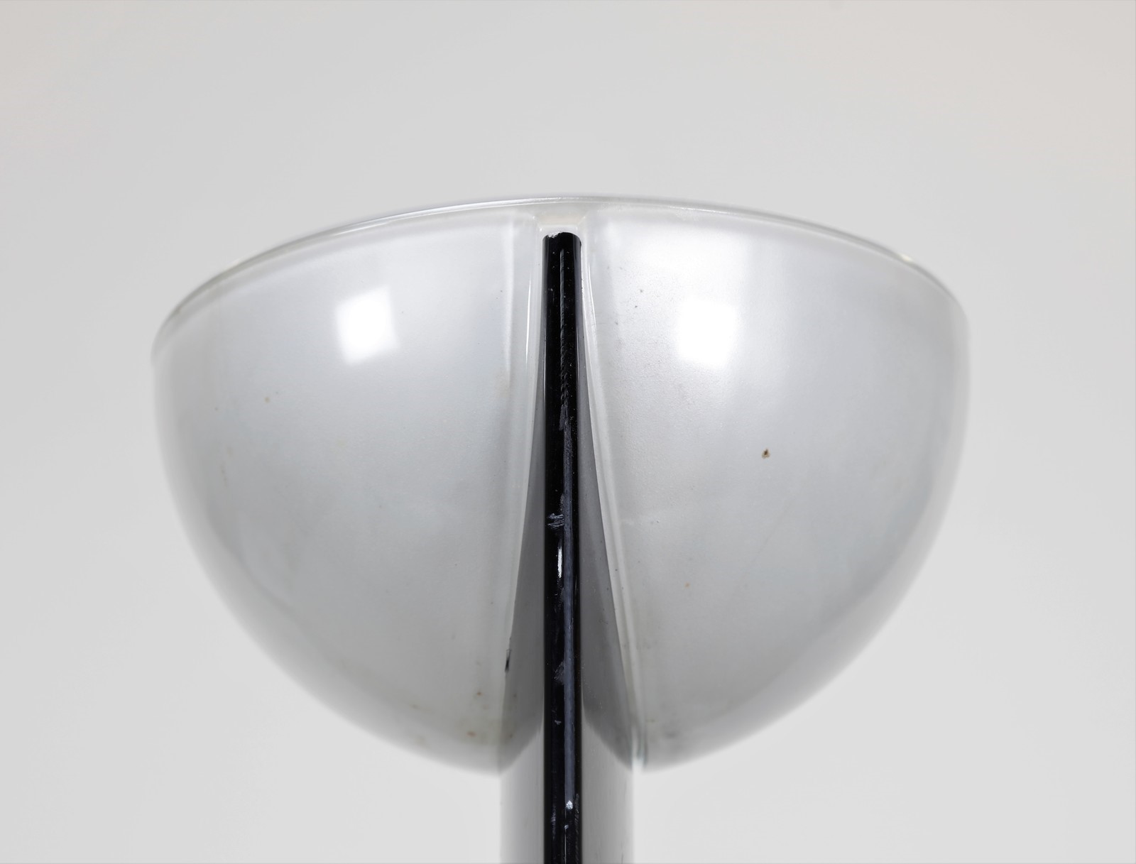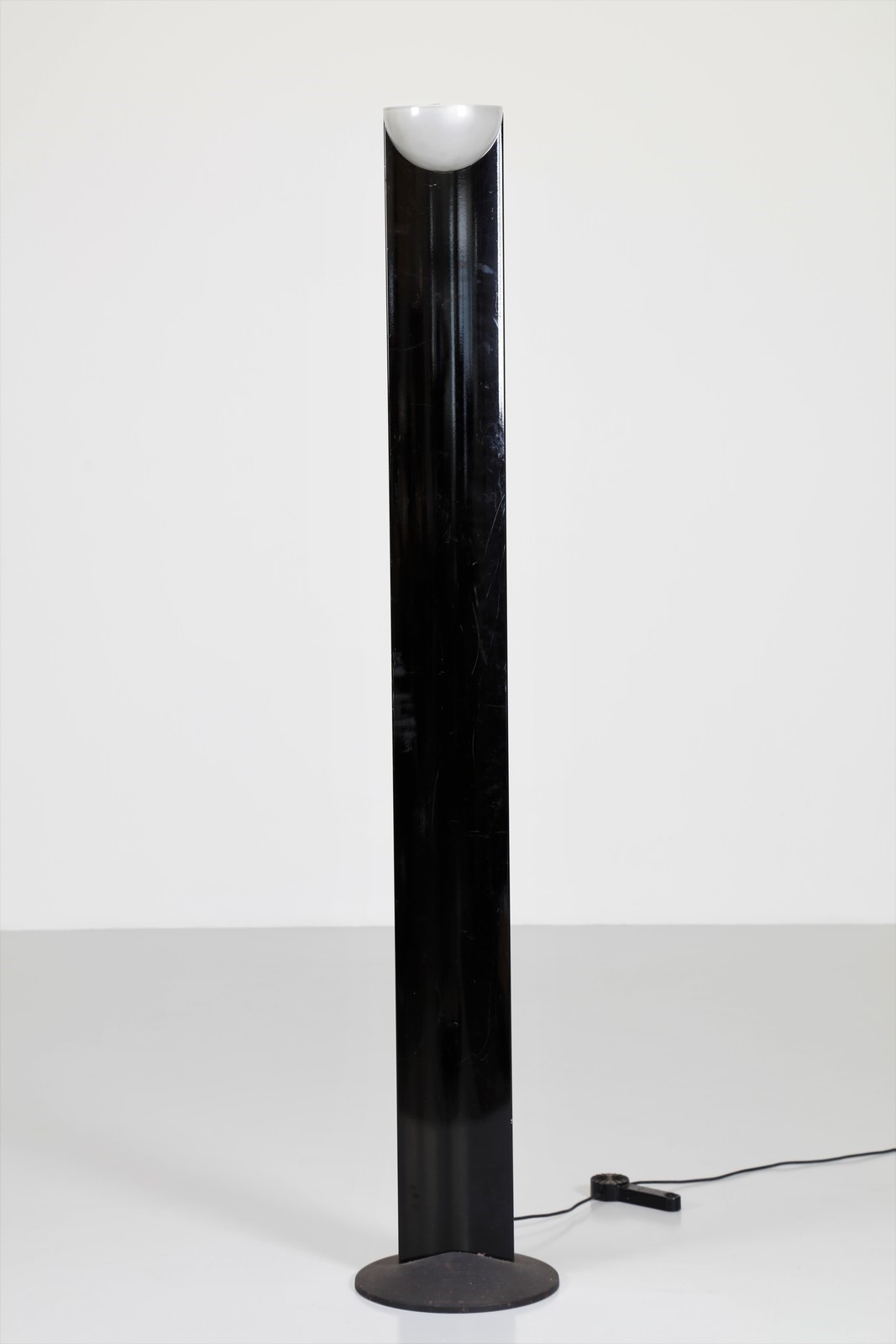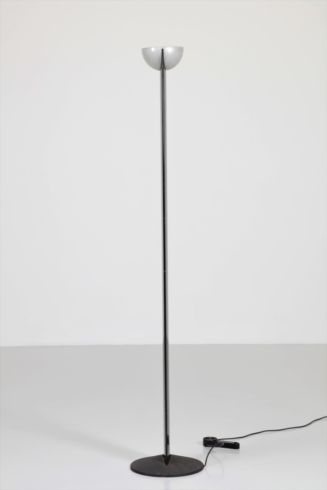 FRATTINI GIANFRANCO (1926 - 2004) Floor lamp mod. Adonis. Lacquered metal, opal glass and cast iron.. Cm 36,00 x 190,00 x 38,00. Stem in black glossy painted steel. Semi-sphere opal glass lampshade and cast iron base, produced for Luci, Milan. 70s / 80s.