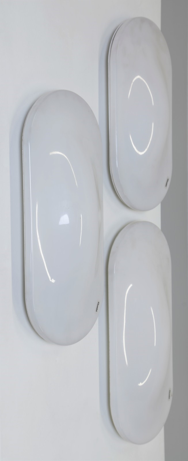 I GUZZINI Three wall lamps. Lacquered metal and plexiglass. Cm 24,00 x 54,00 x 11,00. 70s. Small applique size: H 45 cm x L 25 cm x D 11 cm