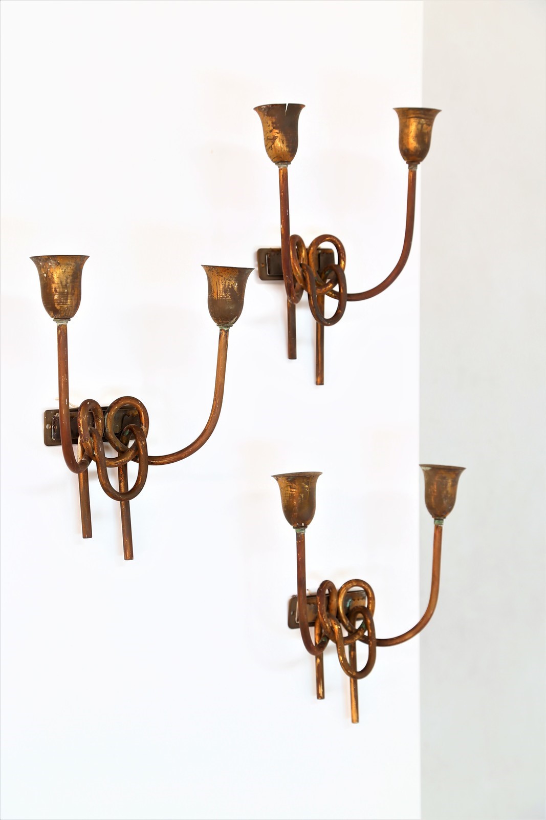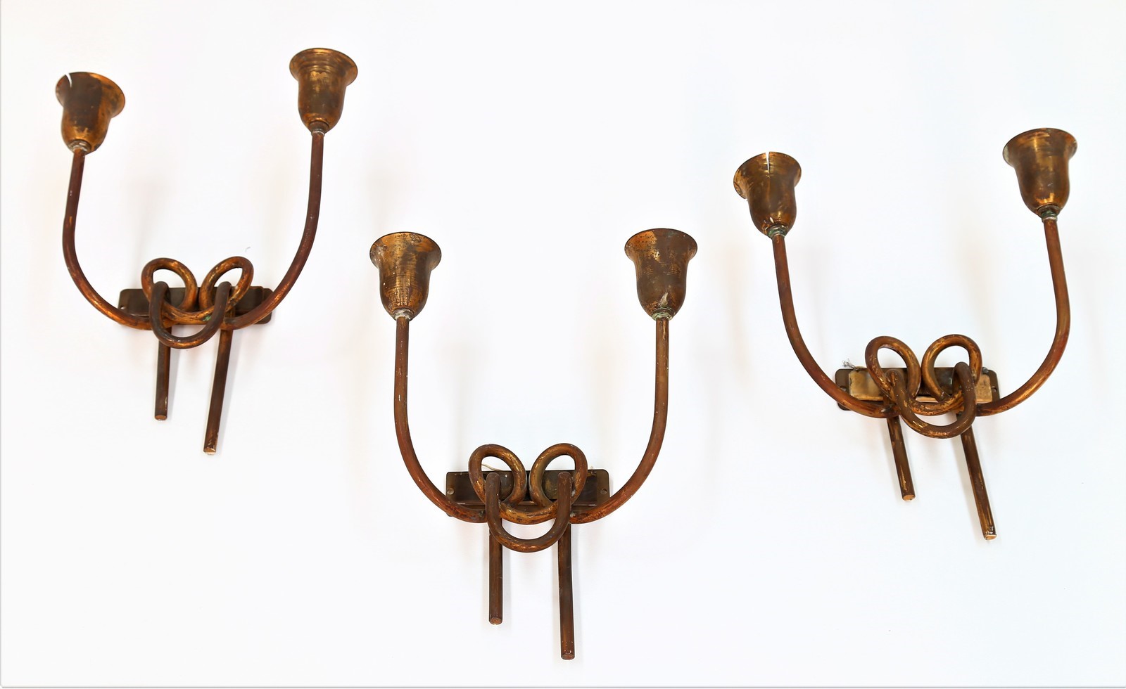 LUMI MILANO Tre appliques. Ottone. Cm 20,00 x 25,00 x 8,50. Anni 40/50.