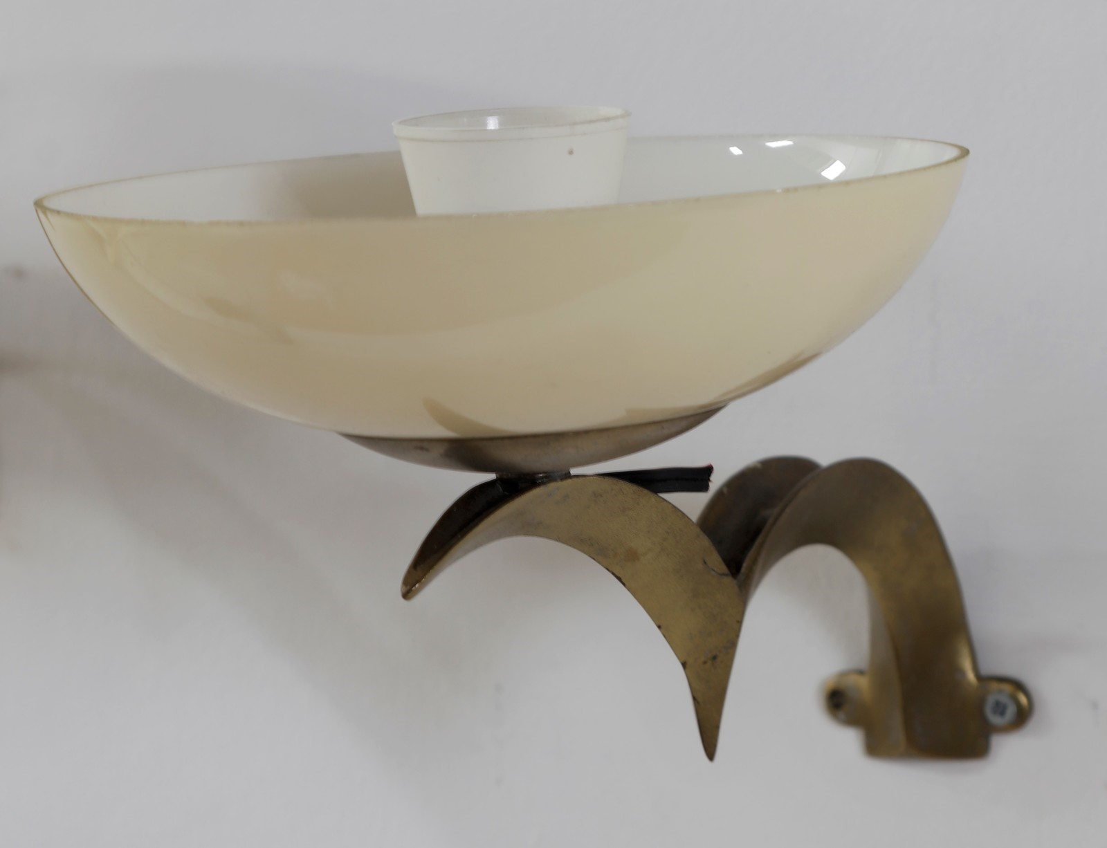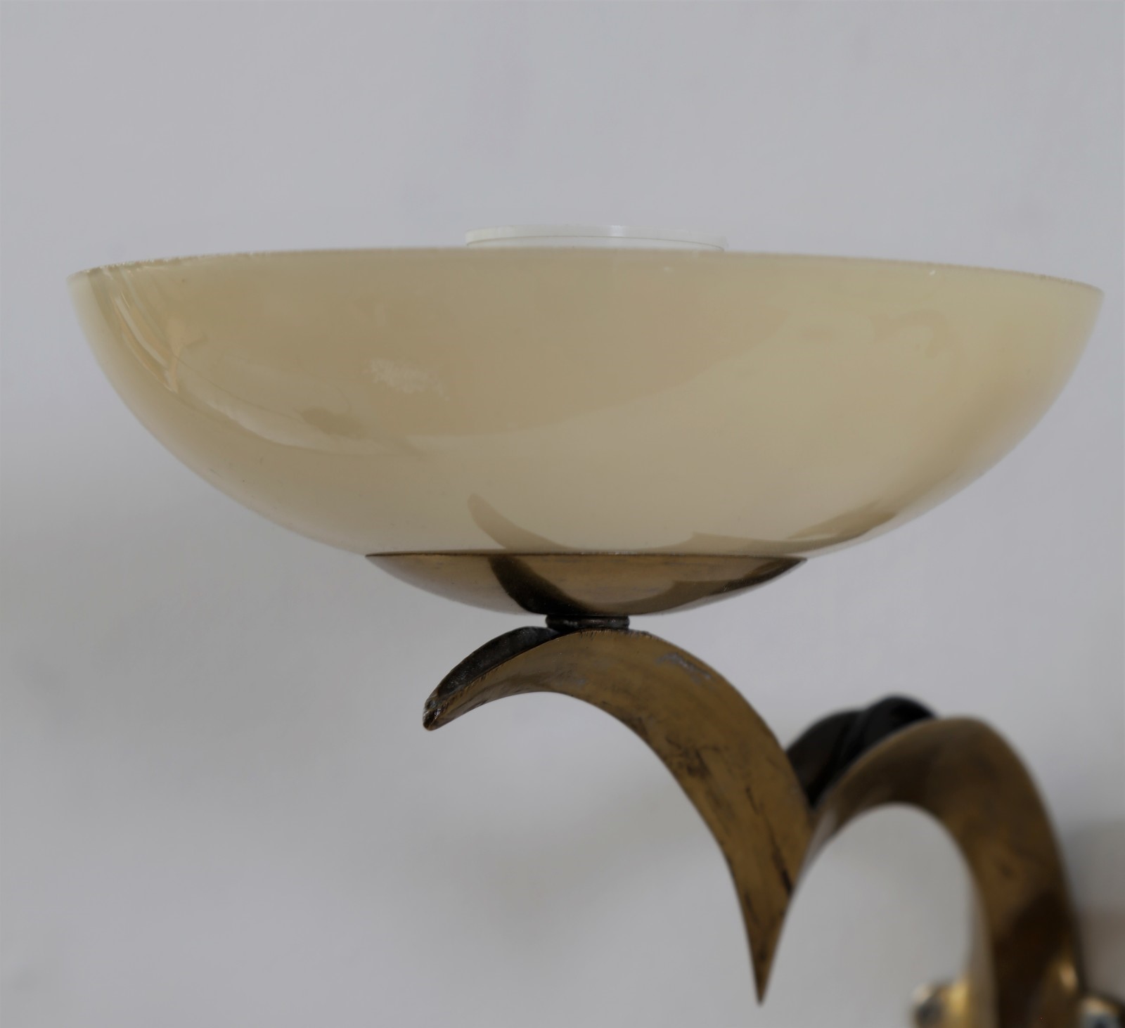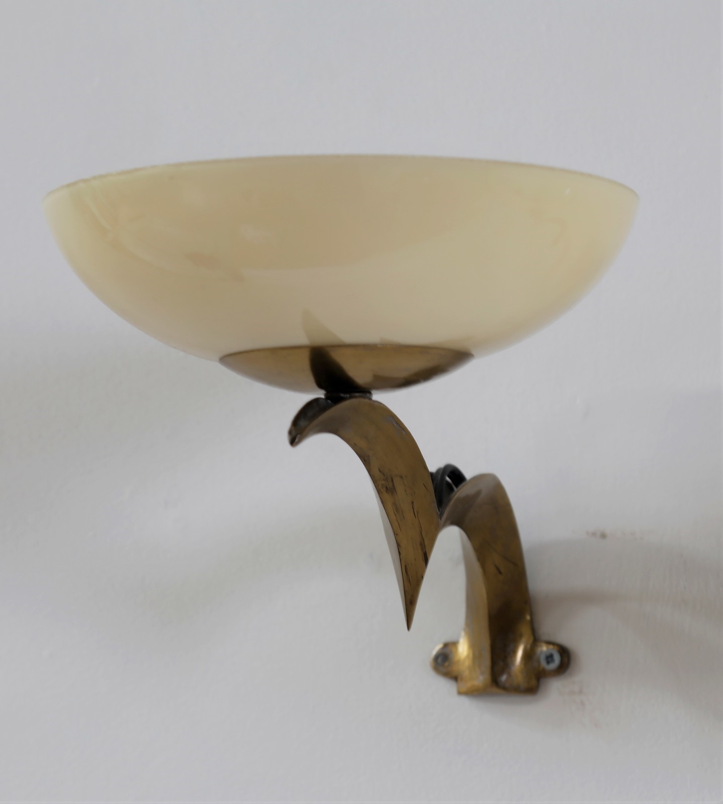 PECHE DAGOBERT (1887 - 1923) Coppia appliques. Ottone e vetro. Cm 17,00 x 15,00 x 25,00. Struttura in ottone e diffusore in vetro opalino, anni 30.