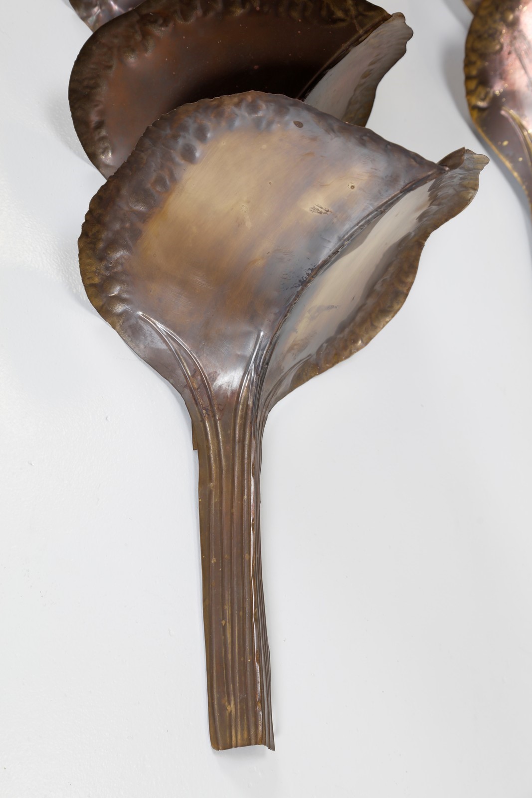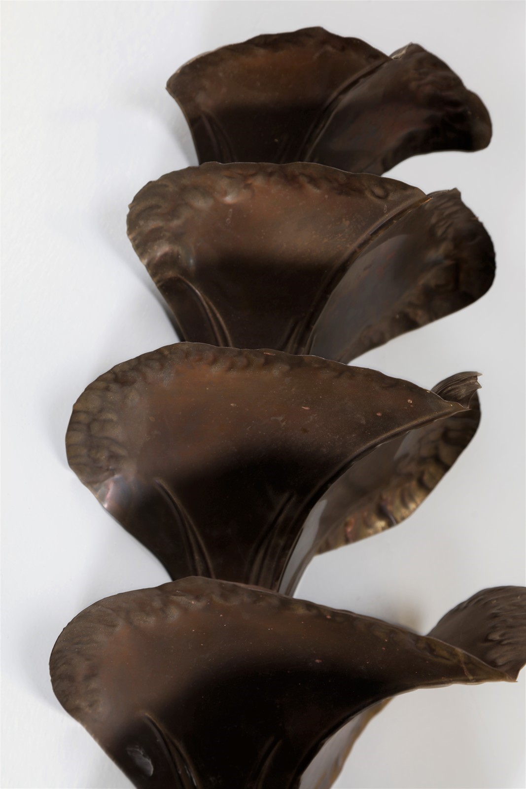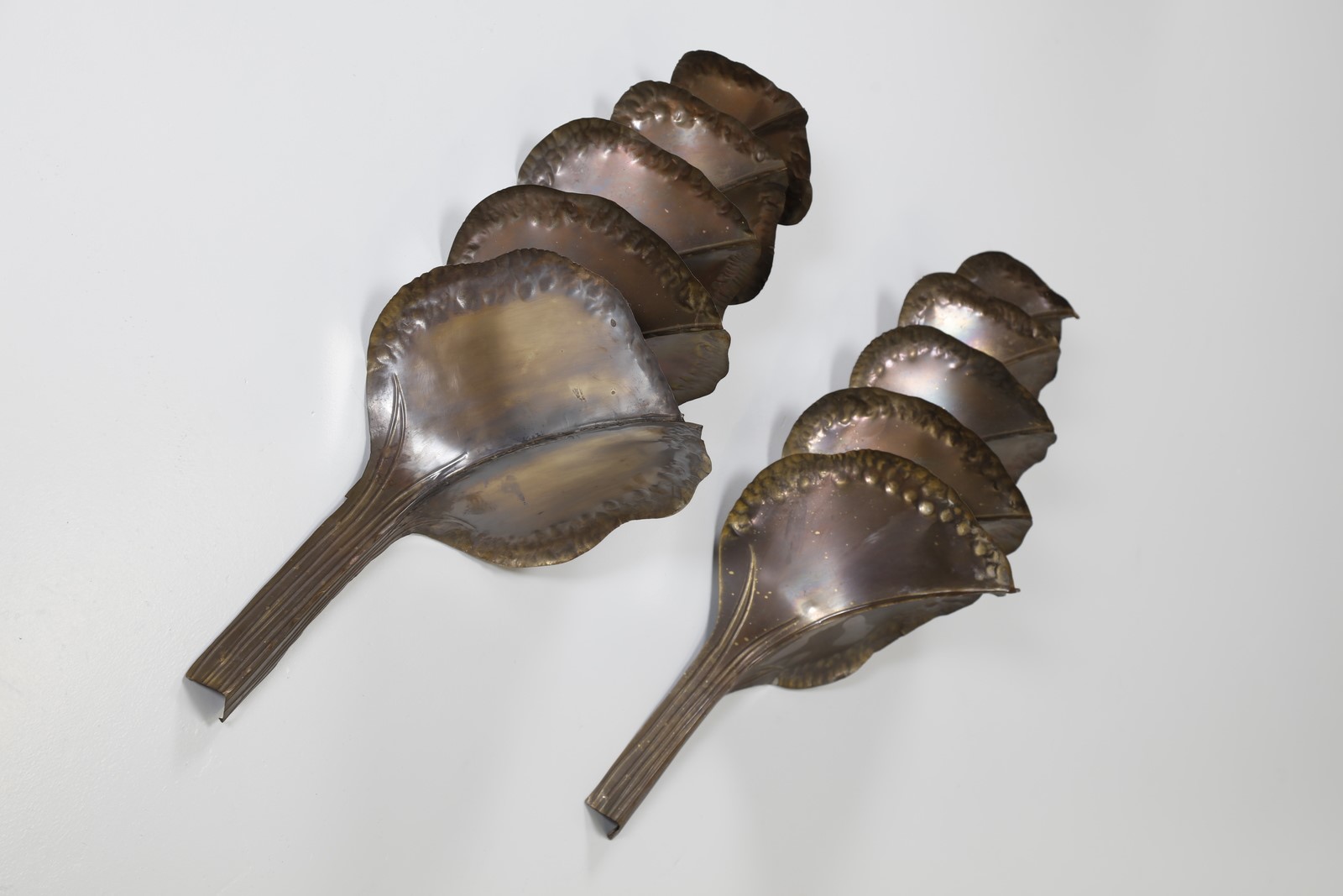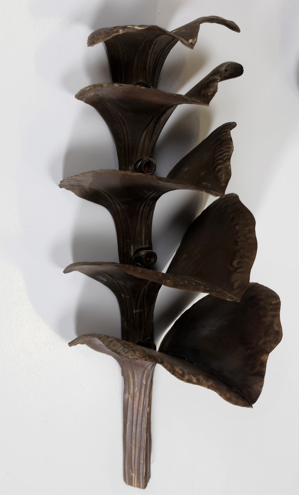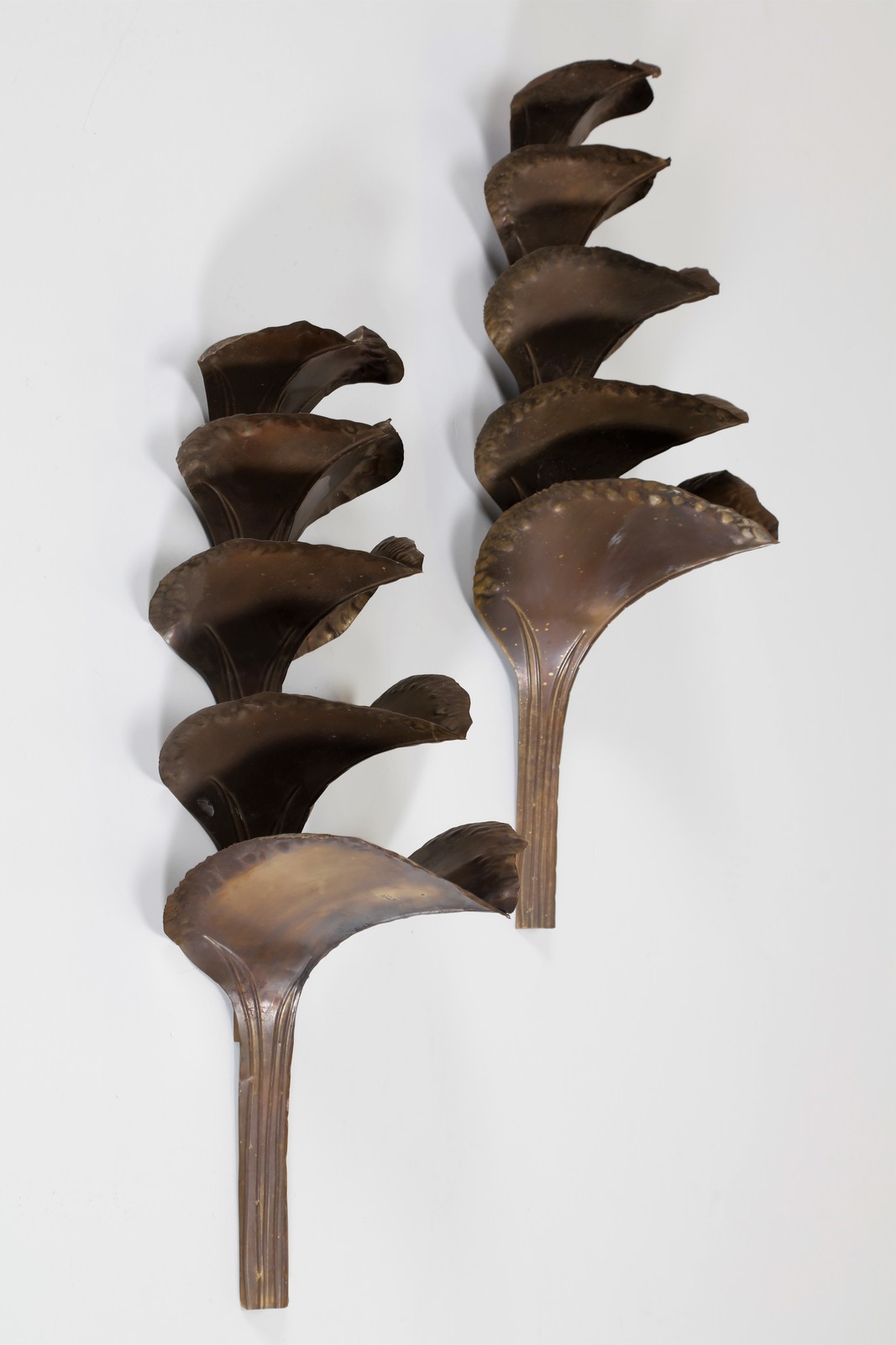 BOTTEGA GADDA Coppia di appliques. Ottone. Cm 30,00 x 73,00 x 26,00. Struttura a foglie in ottone battuto, anni 60.
