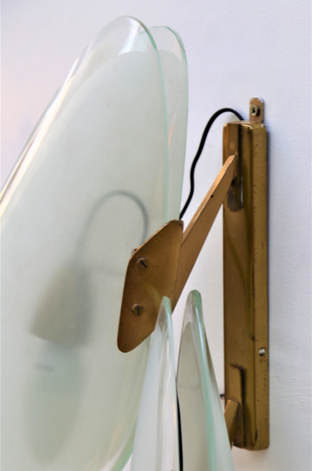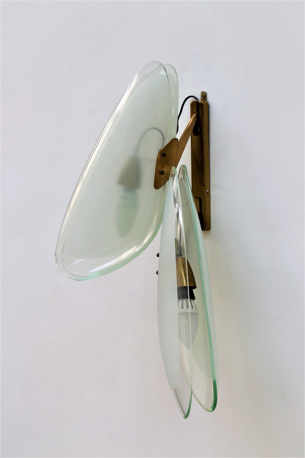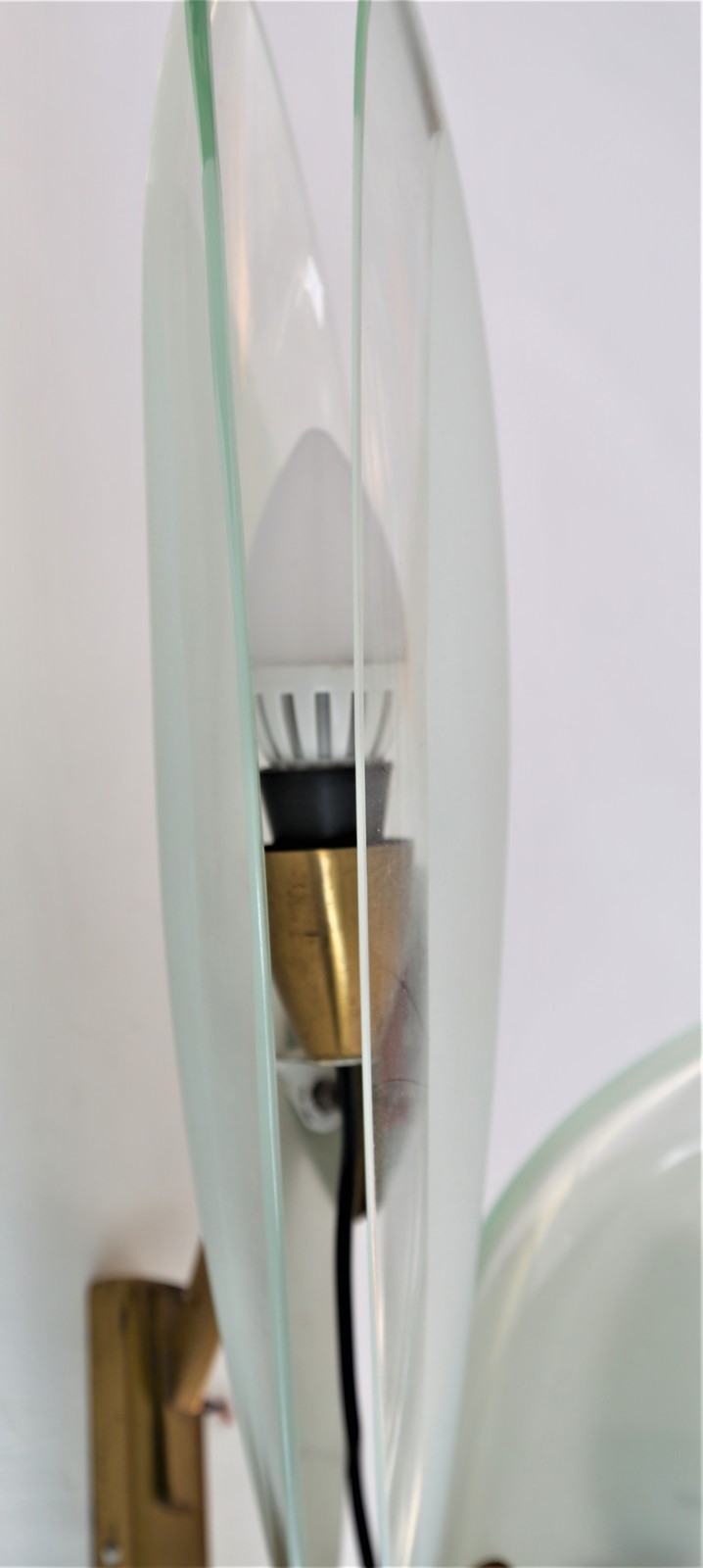 FONTANA ARTE Applique singola. Ottone e cristallo. Cm 40,00 x 52,00 x 13,00. Struttra in ottone con diffusori in cristallo satinato, raro modello doppio del 1552.