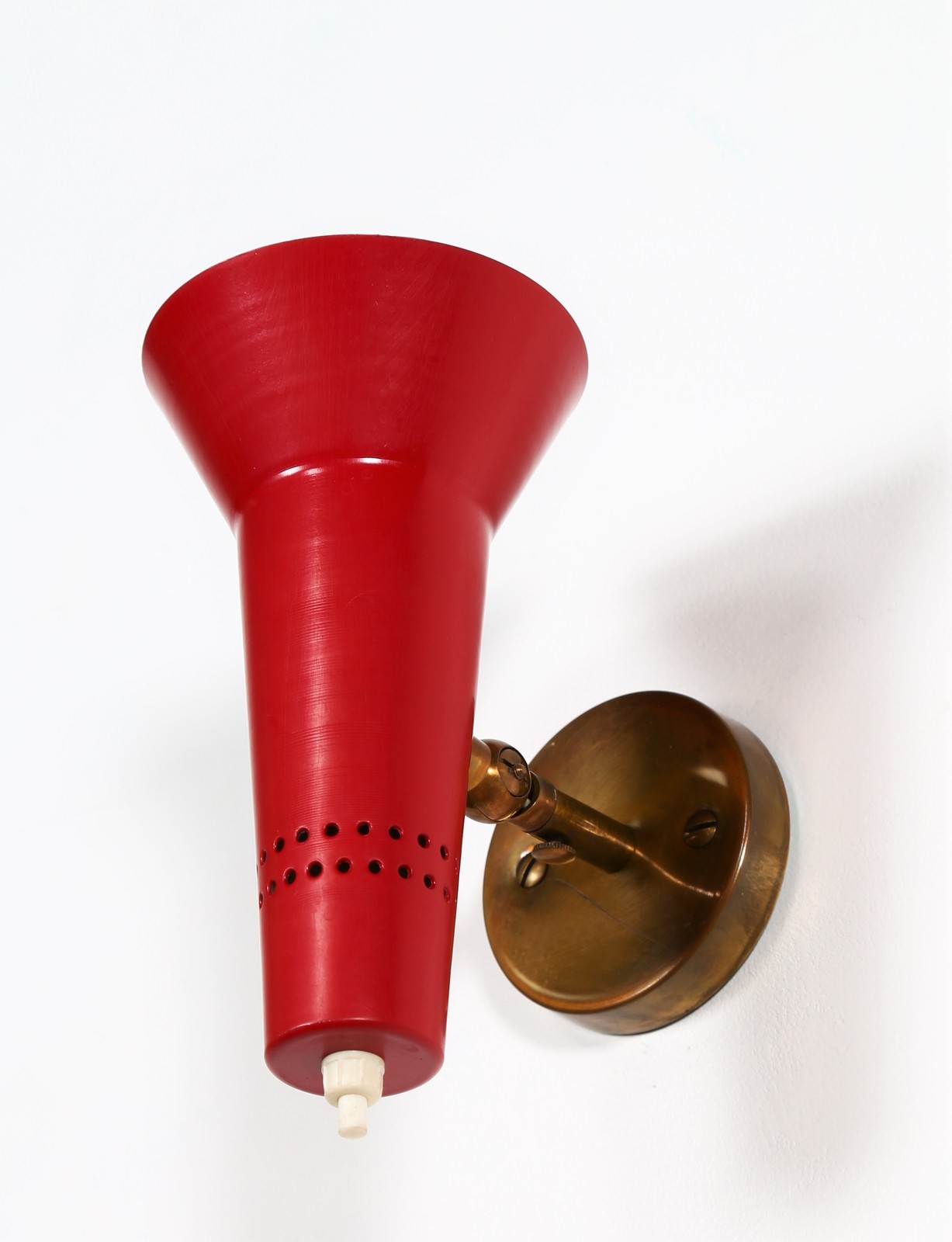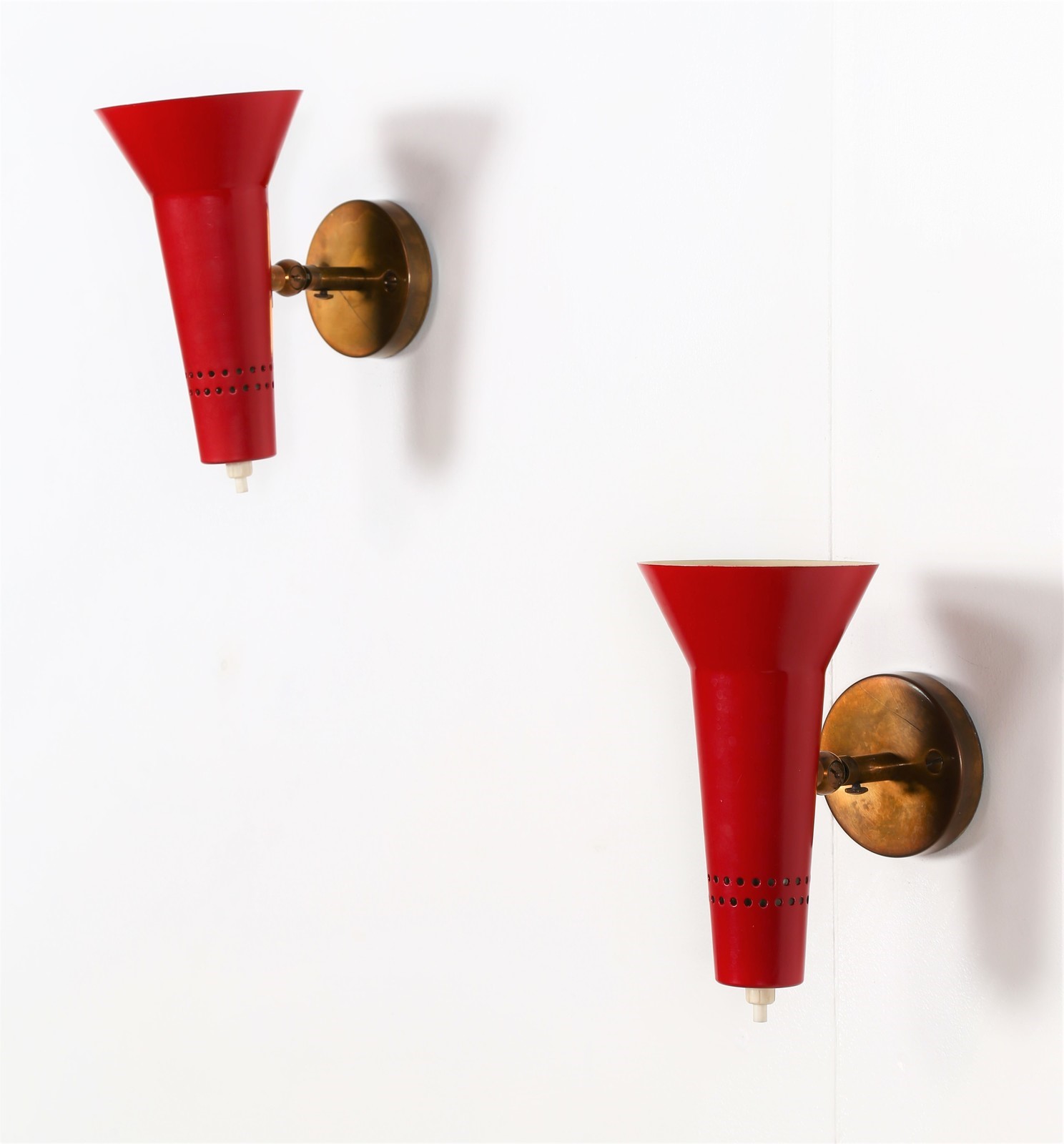 SARFATTI GINO (1912 - 1985) Pair of adjustable wall lamps. Aluminium and brass.. Cm 10,00 x 20,00 x 17,00. Adjustable reflector in coloured lacquered aluminium, arm, pivot and base in polished brass. 1955.