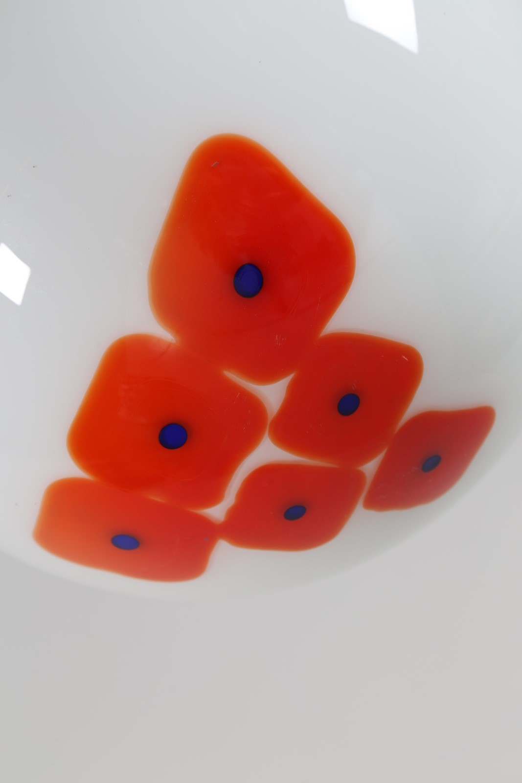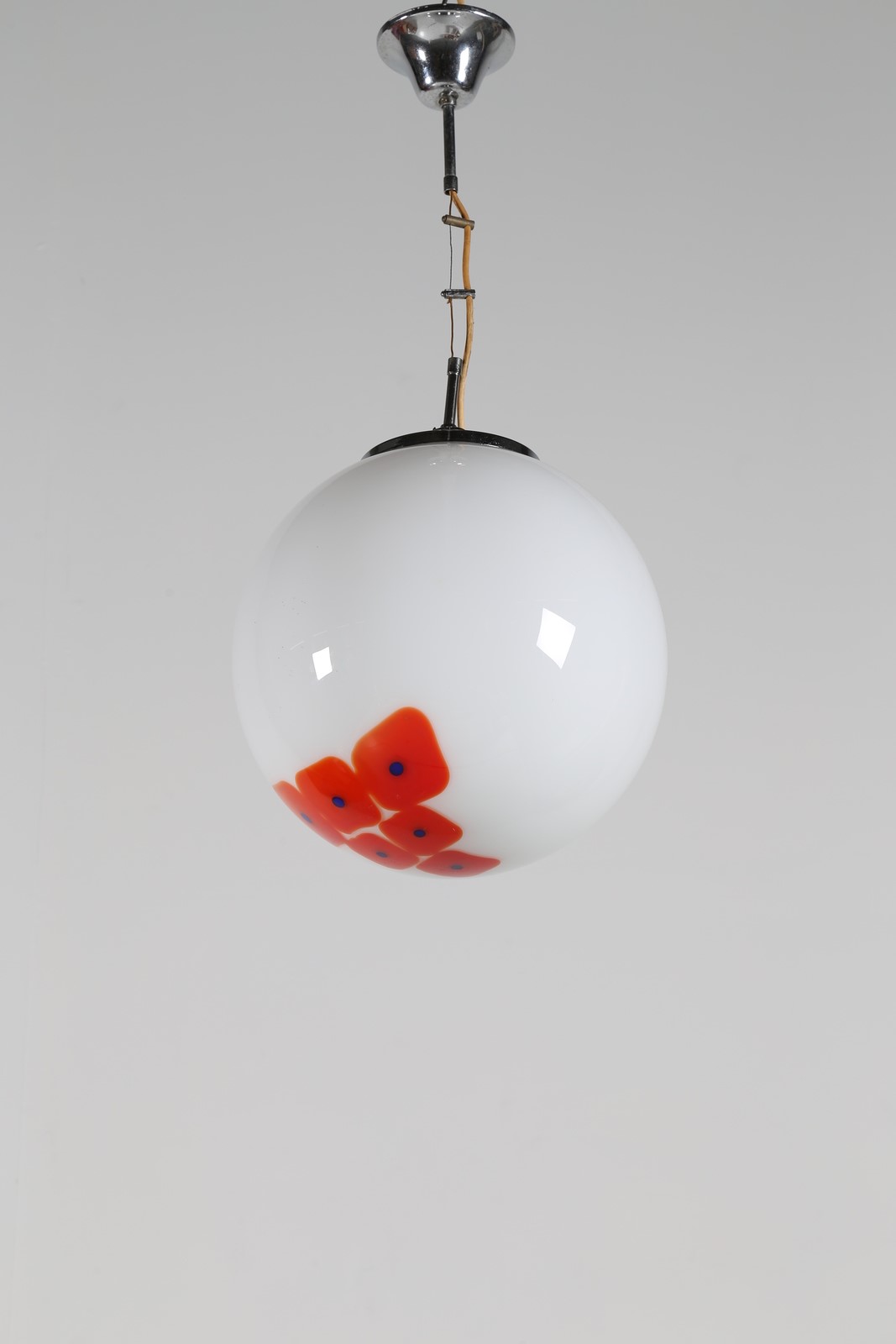 ITALIAN MANUFACTURE Ceiling lamp. Chromed metal and glass. Cm 35,00 x 80,00 x 35,00. Lattimo glass lampshade with decoration, 70s.