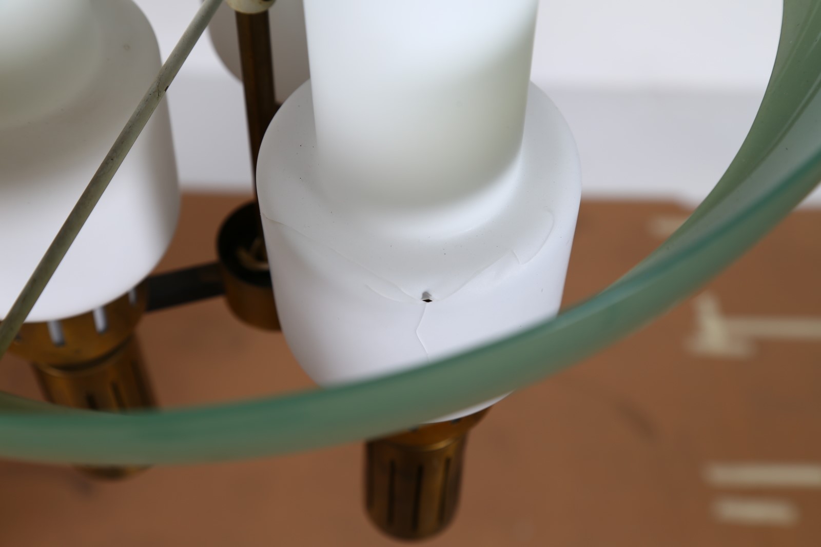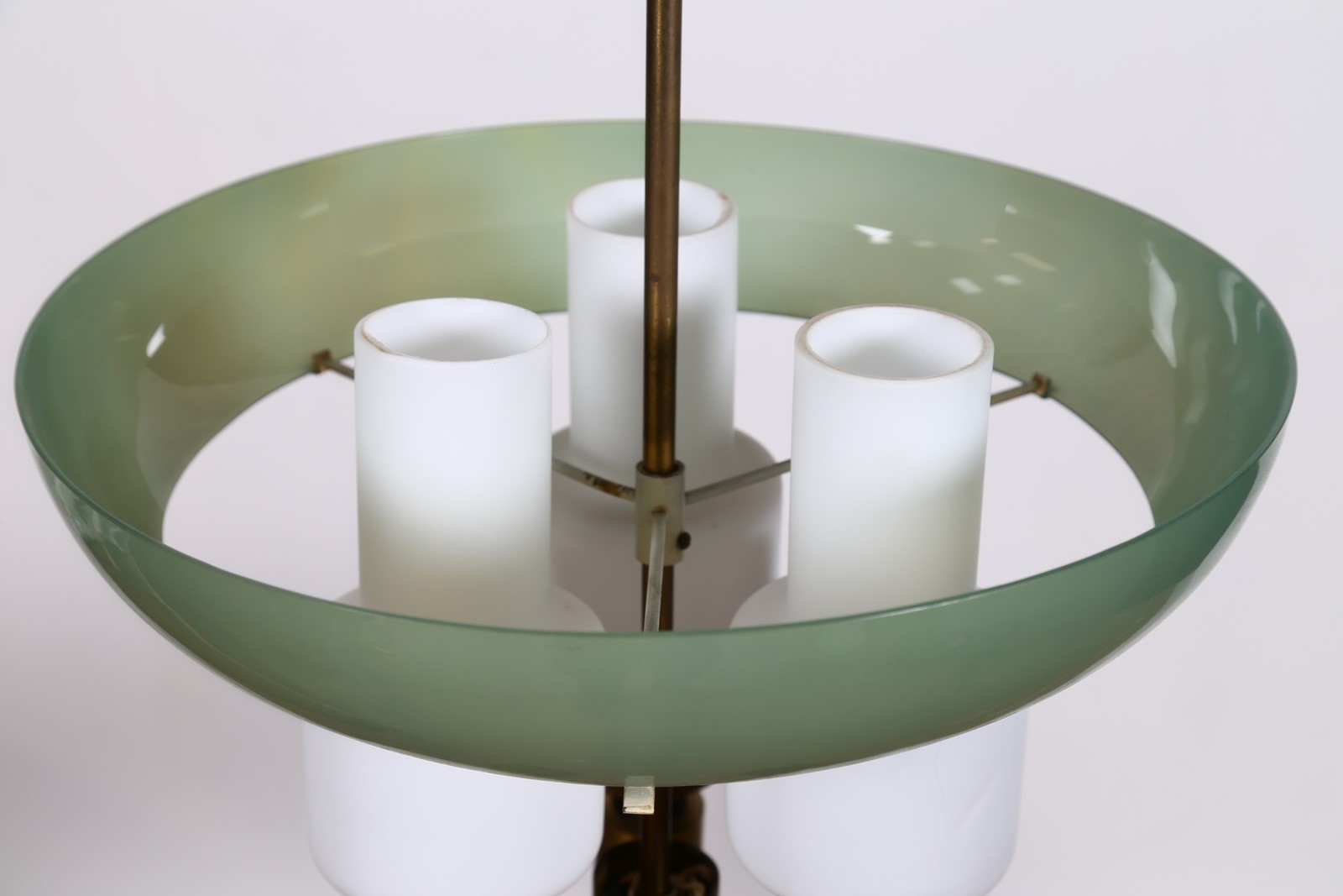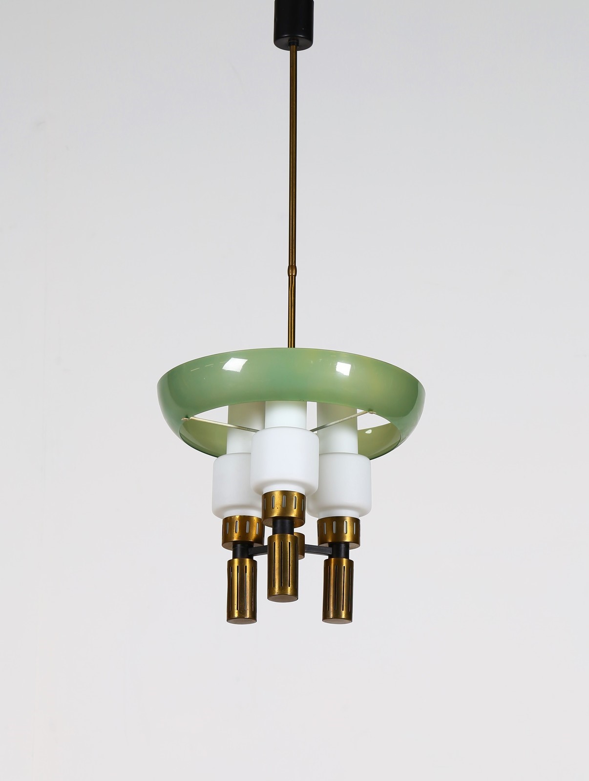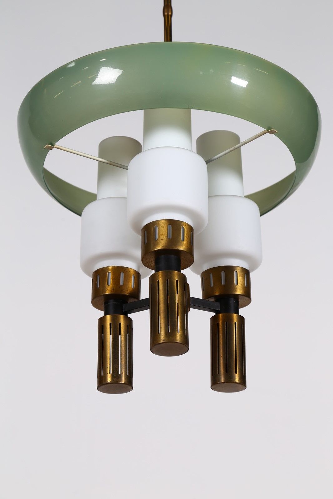 MANIFATTURA ITALIANA Lampada da soffitto. Ottone, perspex e plastica. Cm 36,00 x 90,00 x 36,00. Anni 50. Segnalazione: Vetro di un diffusore rotto