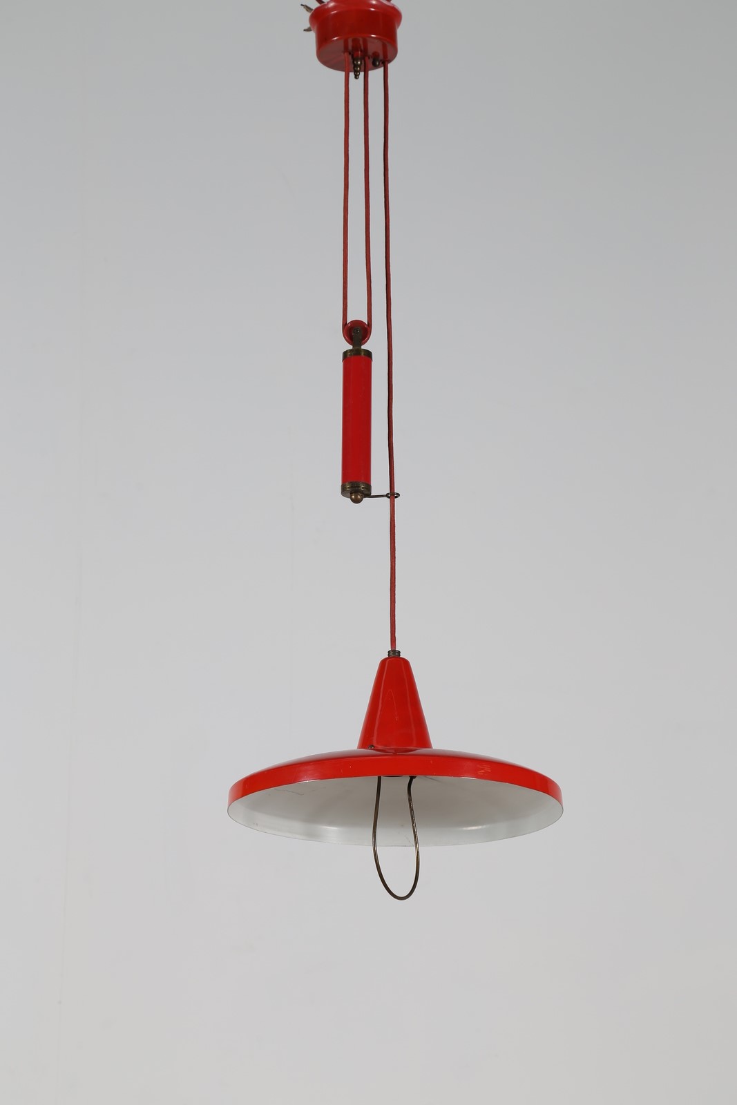 MANIFATTURA ITALIANA Lampadario saliscendi. Metallo laccato, ottone. Cm 40,00 x 100,00 x 40,00. Lampada a sospensione con struttura scorrevole in metallo laccato rosso, anni 50.
