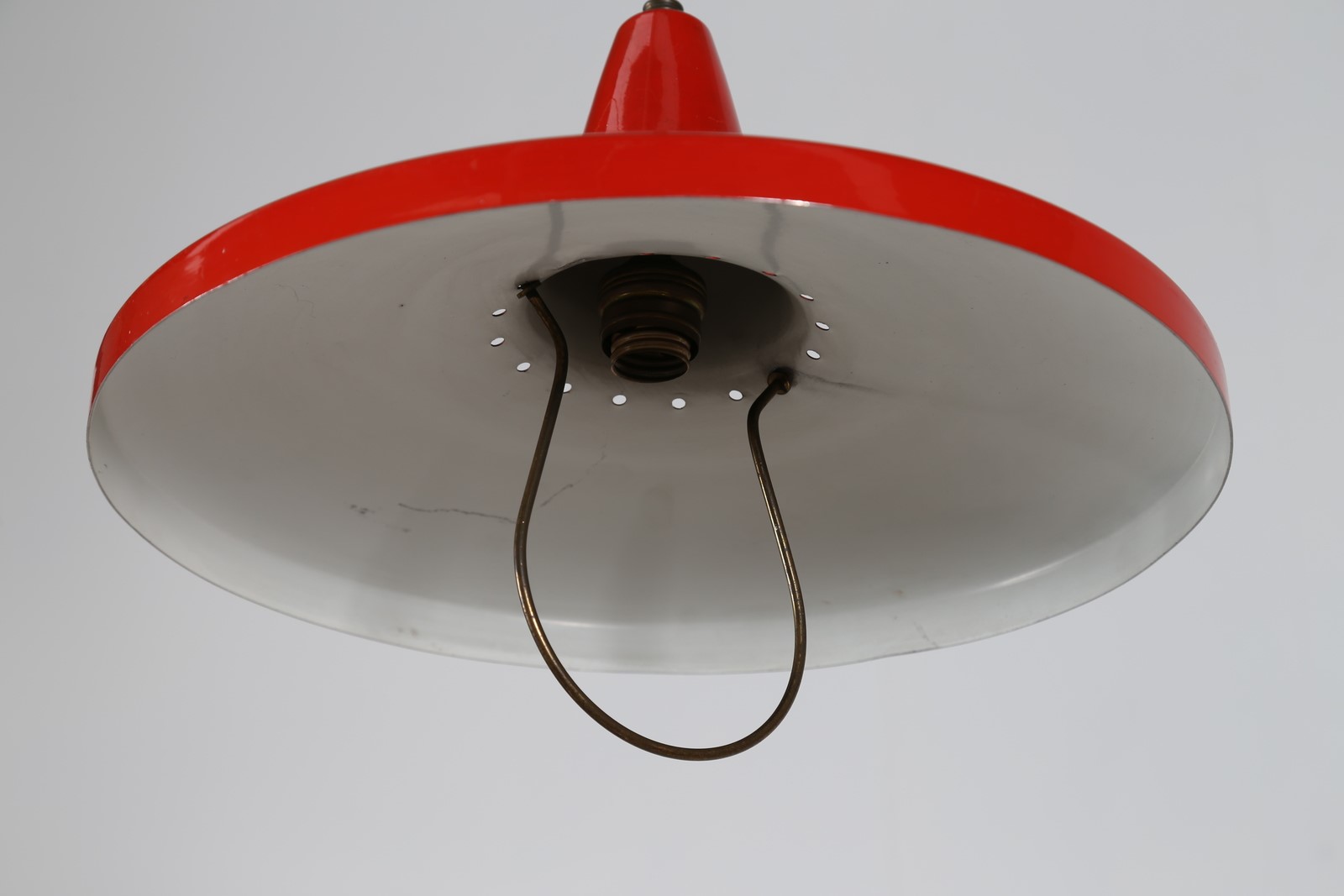 ITALIAN MANUFACTURE Adjustable ceiling lamp. Lacquered metal, brass. Cm 40,00 x 100,00 x 40,00. Suspension lamp with sliding structure in red lacquered metal, 50s.