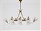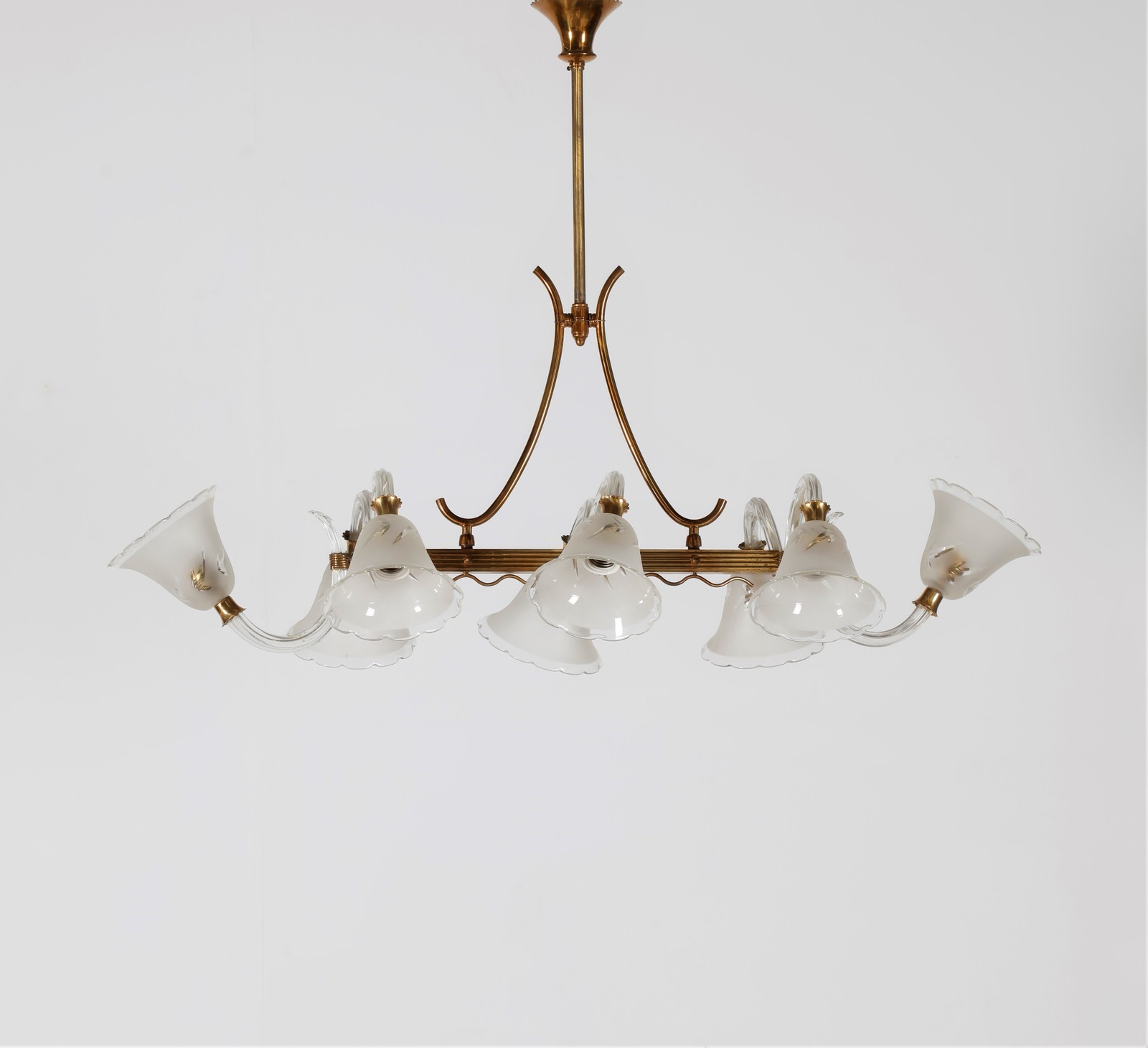 MANIFATTURA ITALIANA Lampadario. Ottone e vetro. Cm 105,00 x 72,00 x 55,00. Struttura in ottone, presenta otto diffusori in vetro satinato, anni 40.