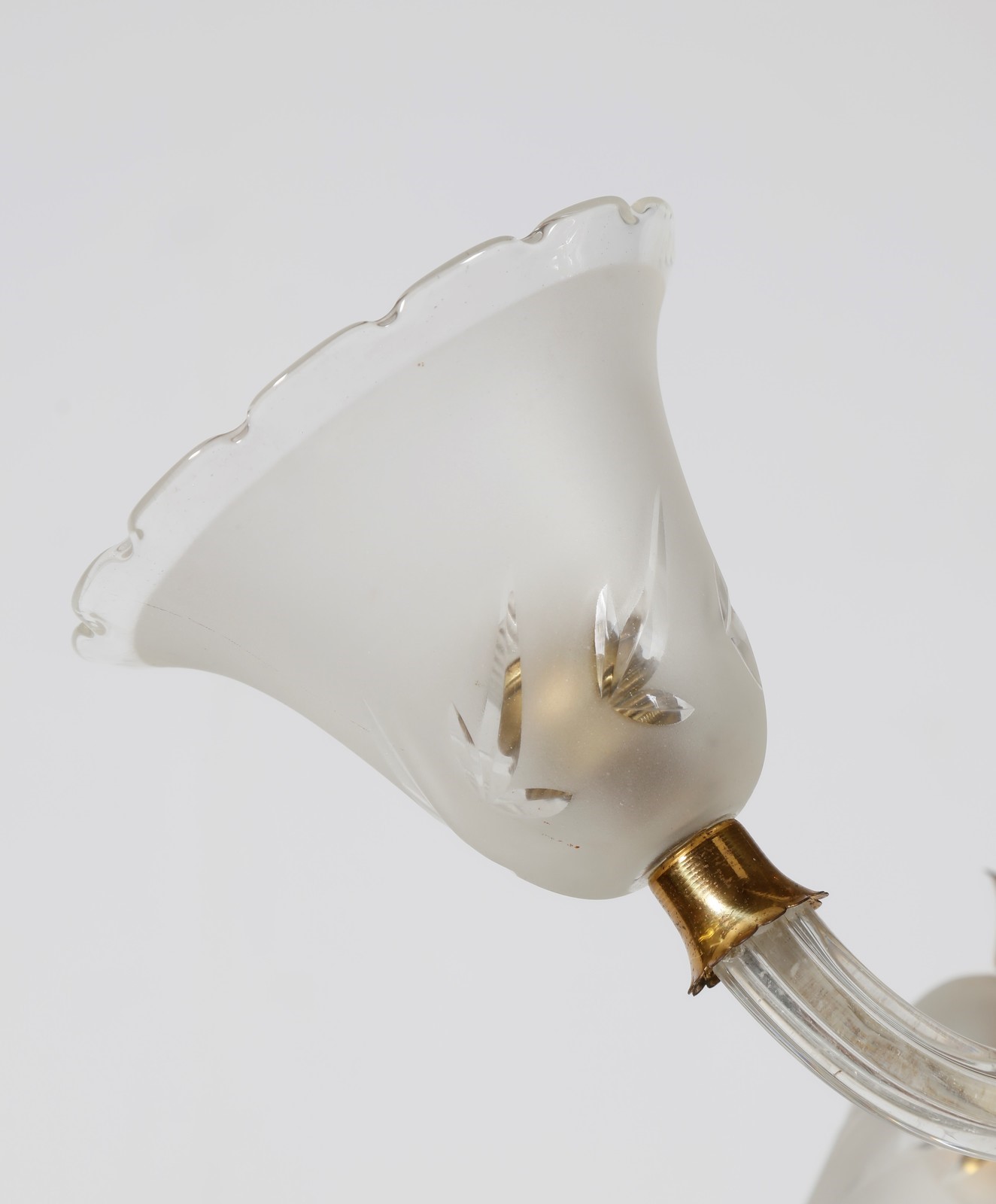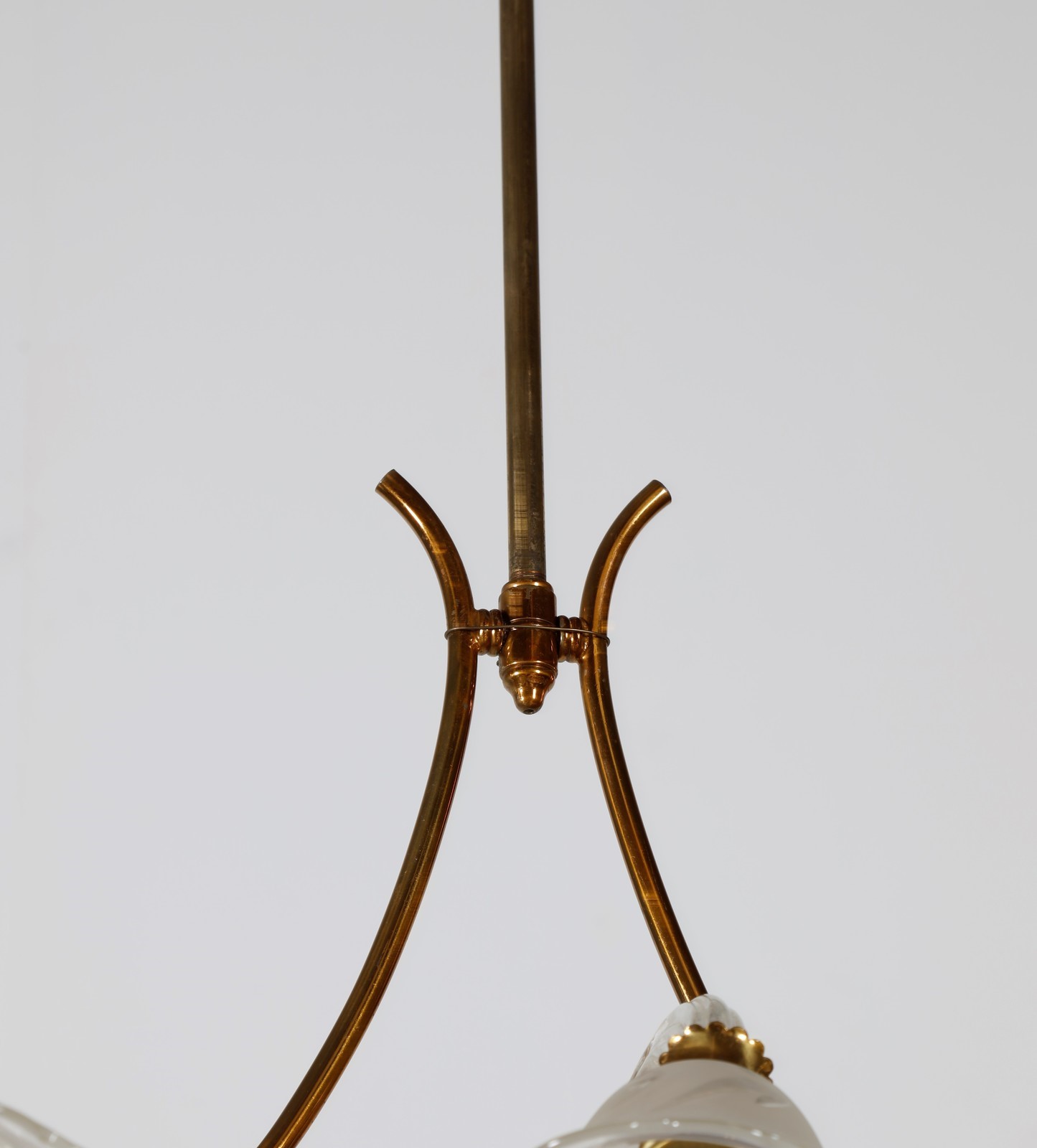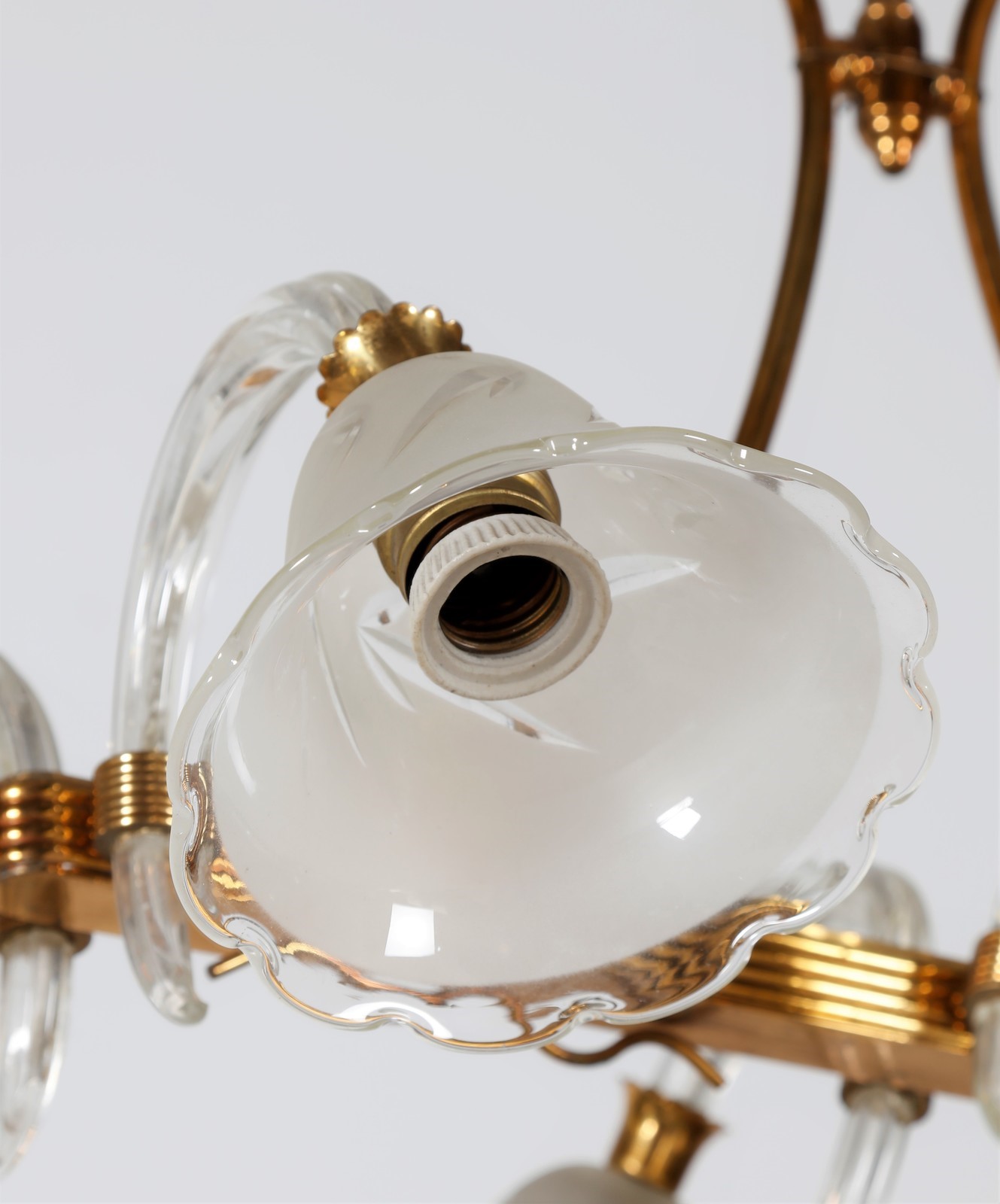 ITALIAN MANUFACTURE Chandelier. Brass and glass. Cm 105,00 x 72,00 x 55,00. Brass structure, has eight satin glass diffusers, 40s.