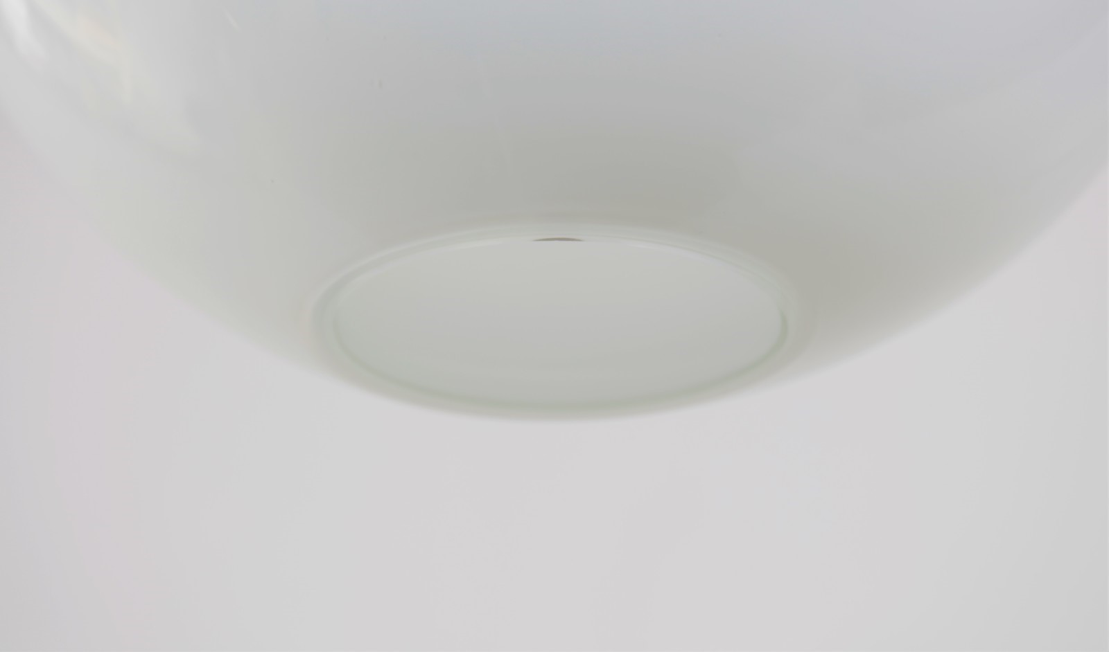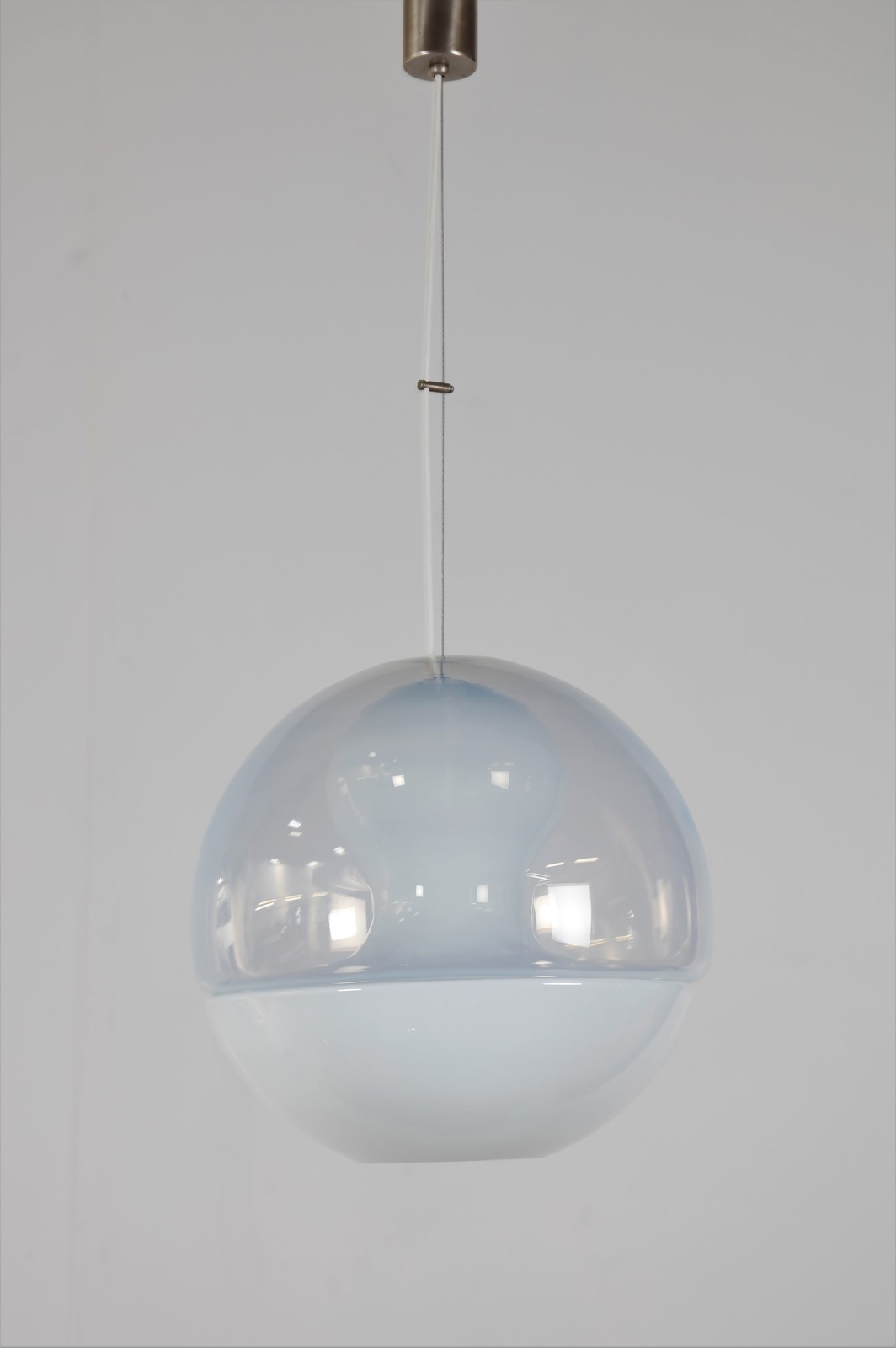 MAZZEGA Chandelier. Lacquered metal, glass. Cm 40,00 x 95,00 x 40,00. Ceiling frame in chromed metal, glass and opal glass shade, 70s.