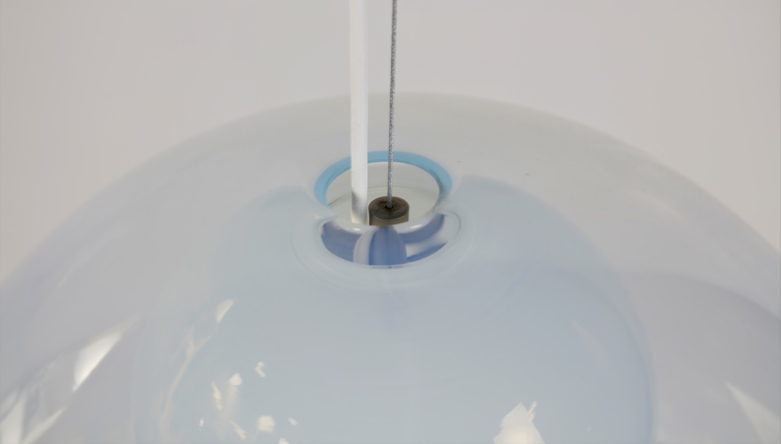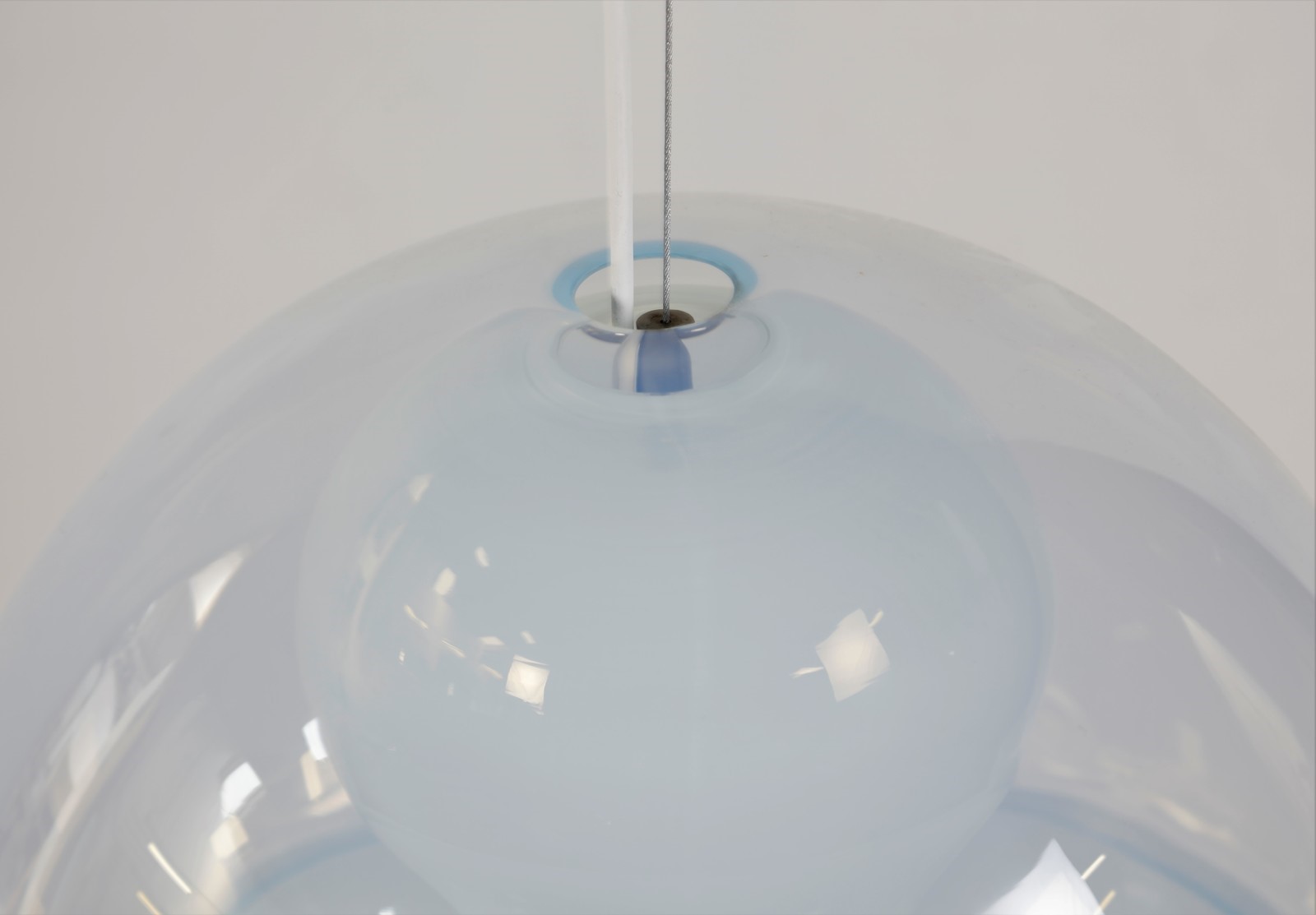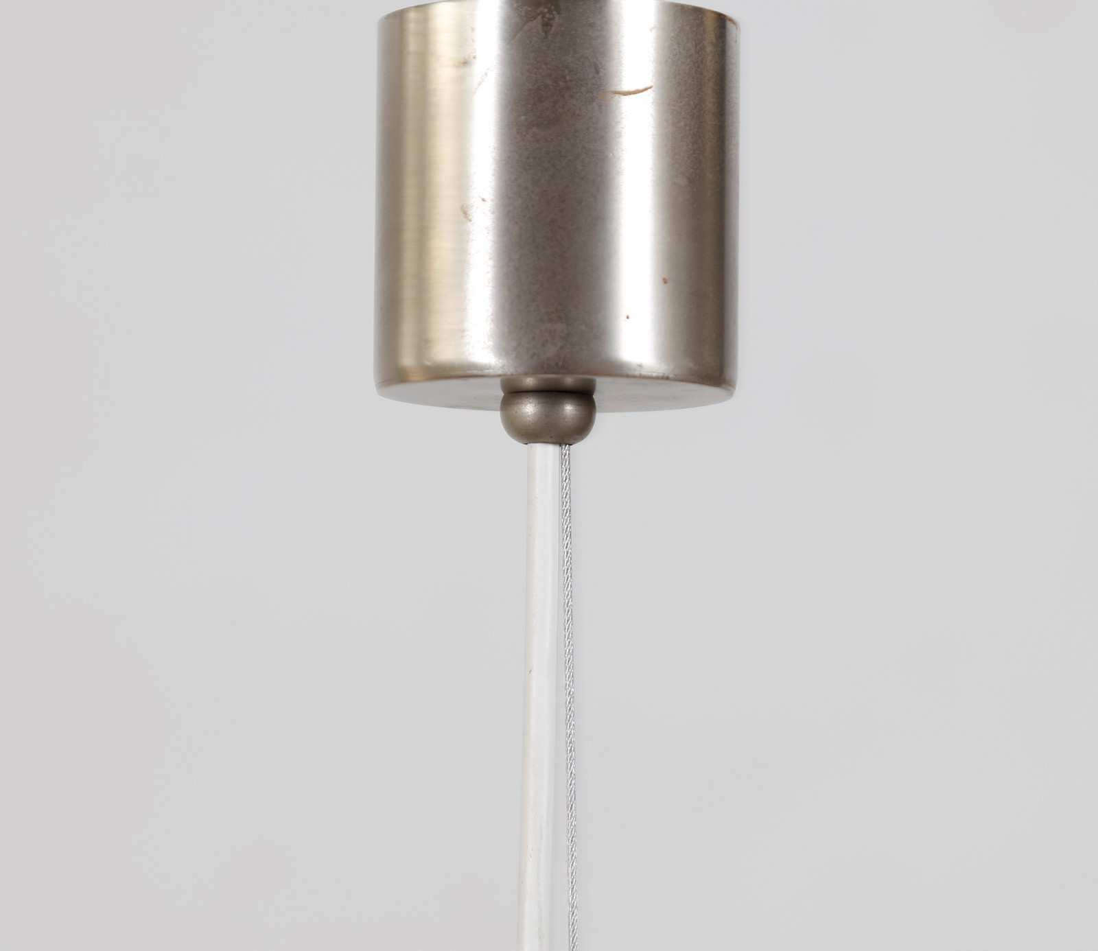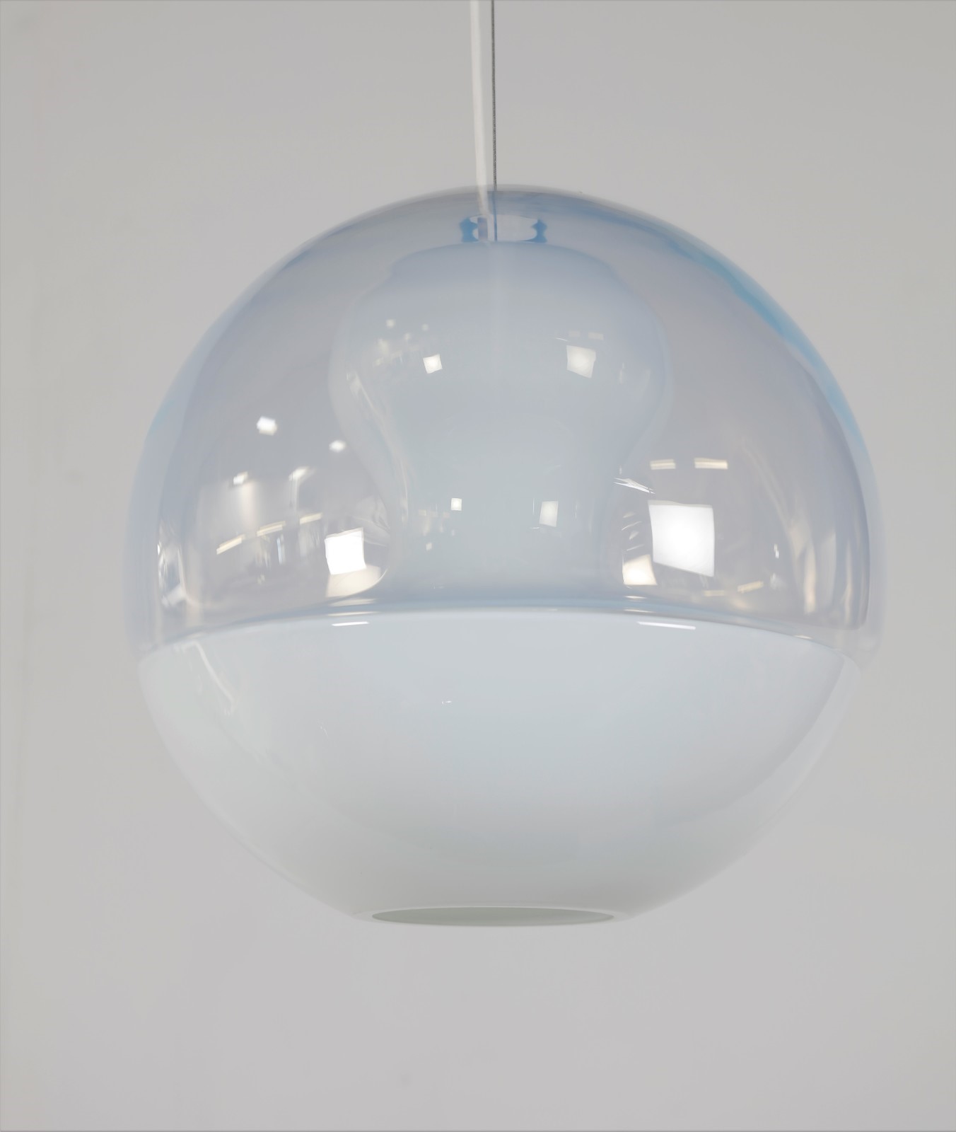 MAZZEGA Lampadario . Metallo laccato, vetro. Cm 40,00 x 95,00 x 40,00. Struttura a soffitto in metallo cromato, paralume in vetro e vetro opalino, anni 70.