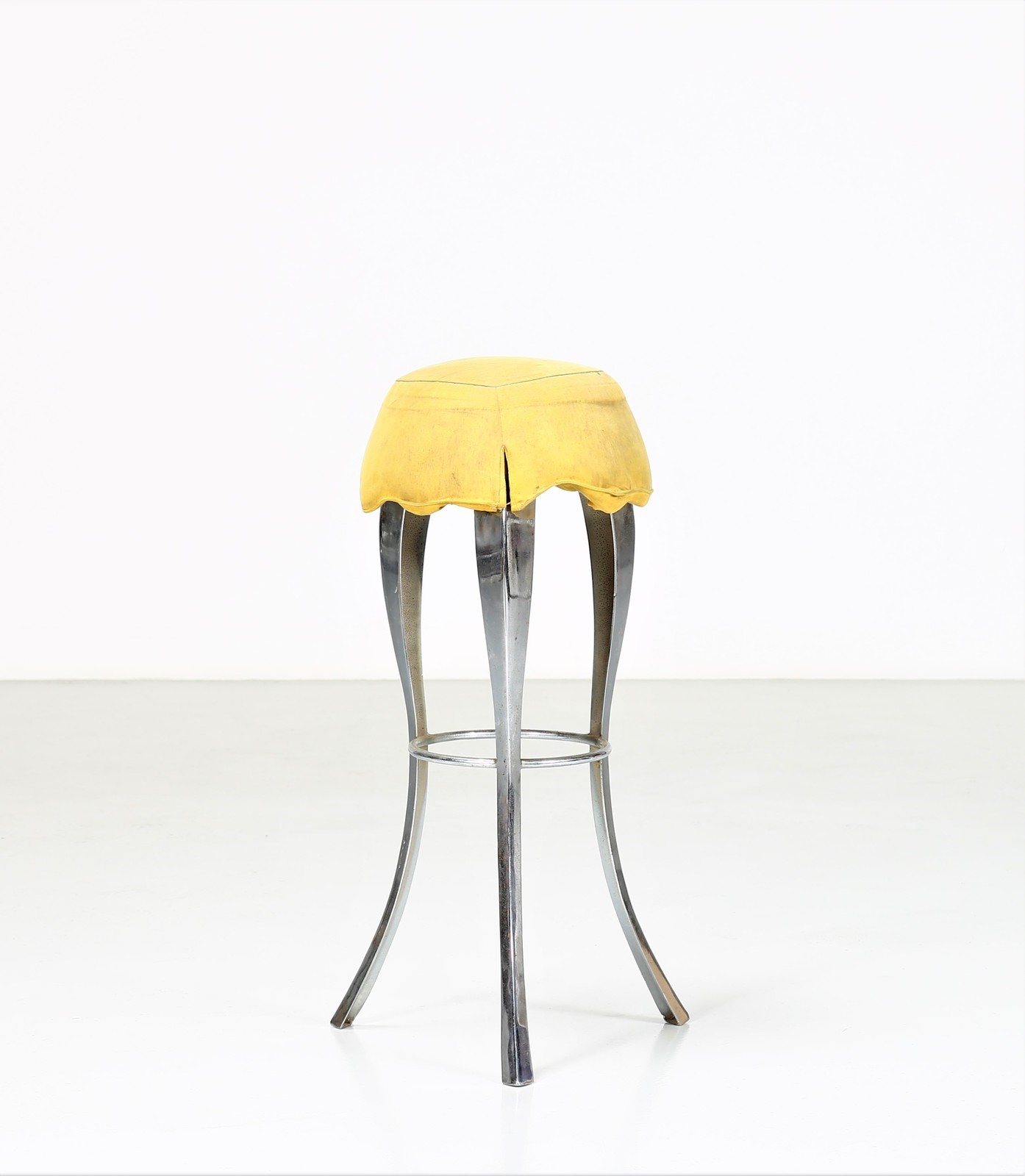 ITALIAN MANUFACTURE Stool. Metal, fabric. Cm 40,00 x 85,00 x 40,00. Chromed metal structure, upholstery and fabric covering. 70's.