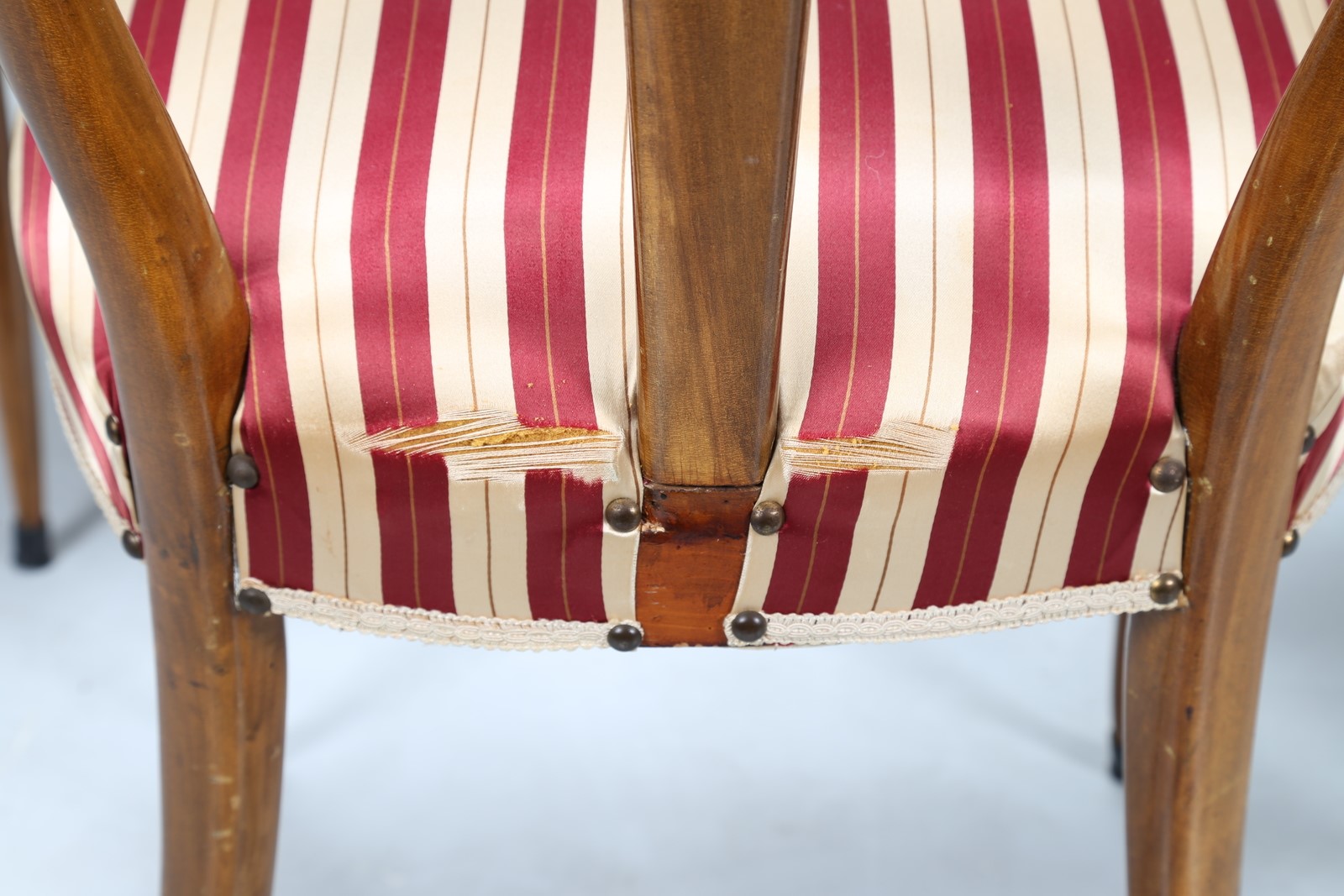 MANIFATTURA ITALIANA Sei sedie. Legno di noce e tessuto. Cm 48,00 x 96,50 x 54,00. Struttura in legno di noce, imbottitura e rivestimento in tessuto, anni 40.