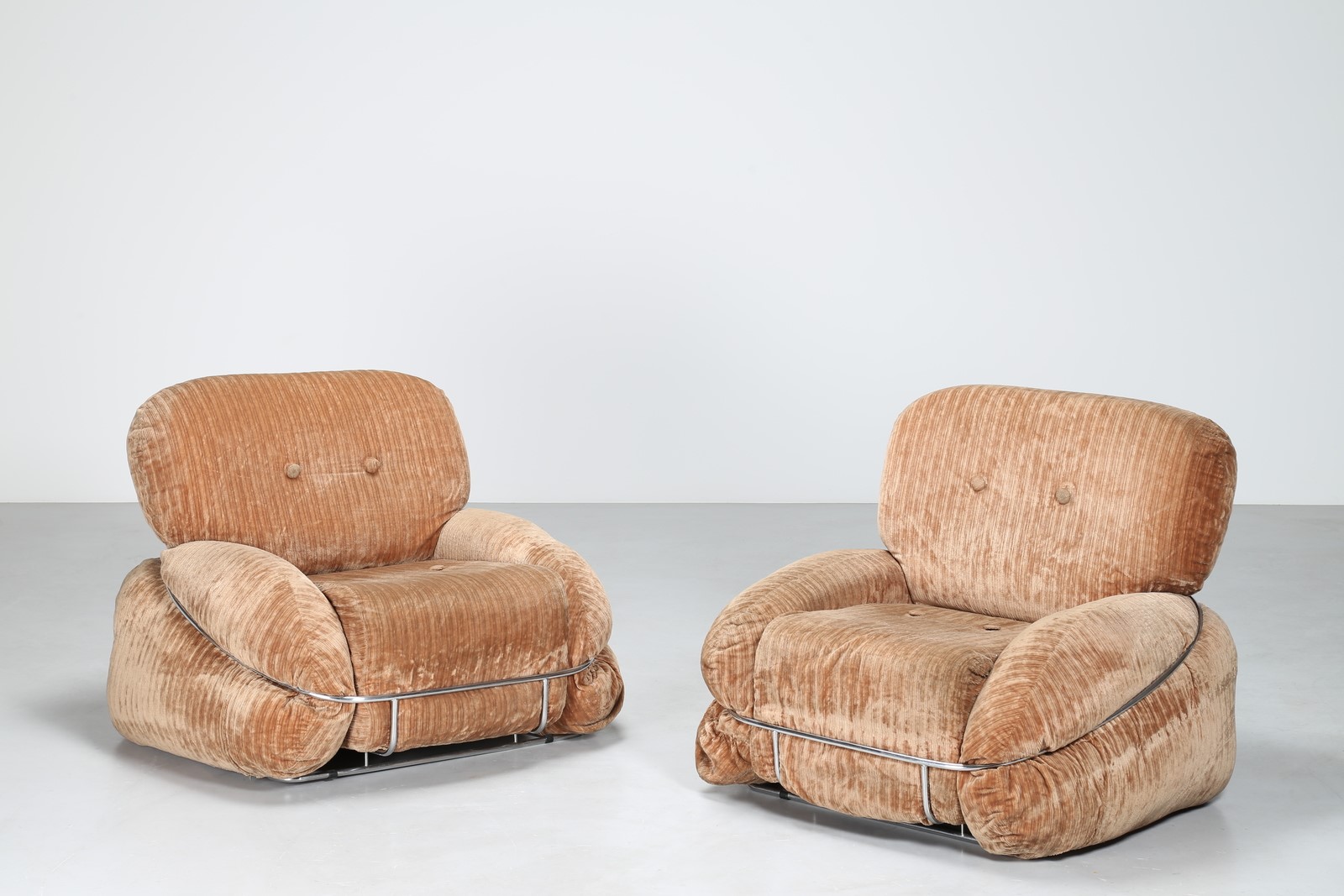 MANIFATTURA ITALIANA Coppia di poltrone. Metallo cromato e tessuto. Cm 100,00 x 81,00 x 95,00. Struttura in metallo cromato, imbottitura e rivestimento in velluto; anni 70.