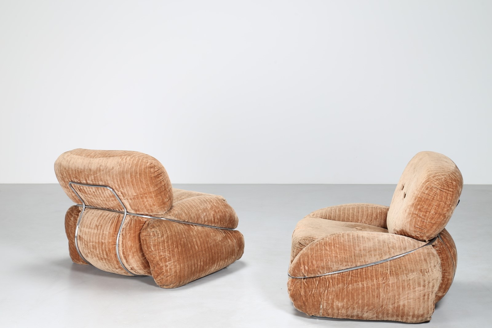 ITALIAN MANUFACTURE Pair of armchairs. Chromed metal and fabric. Cm 100,00 x 81,00 x 95,00. Chromed metal structure, velvet padding and upholstery; 70's.