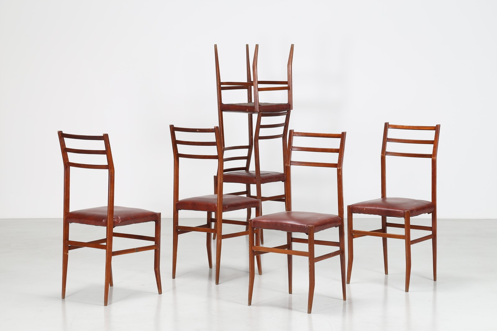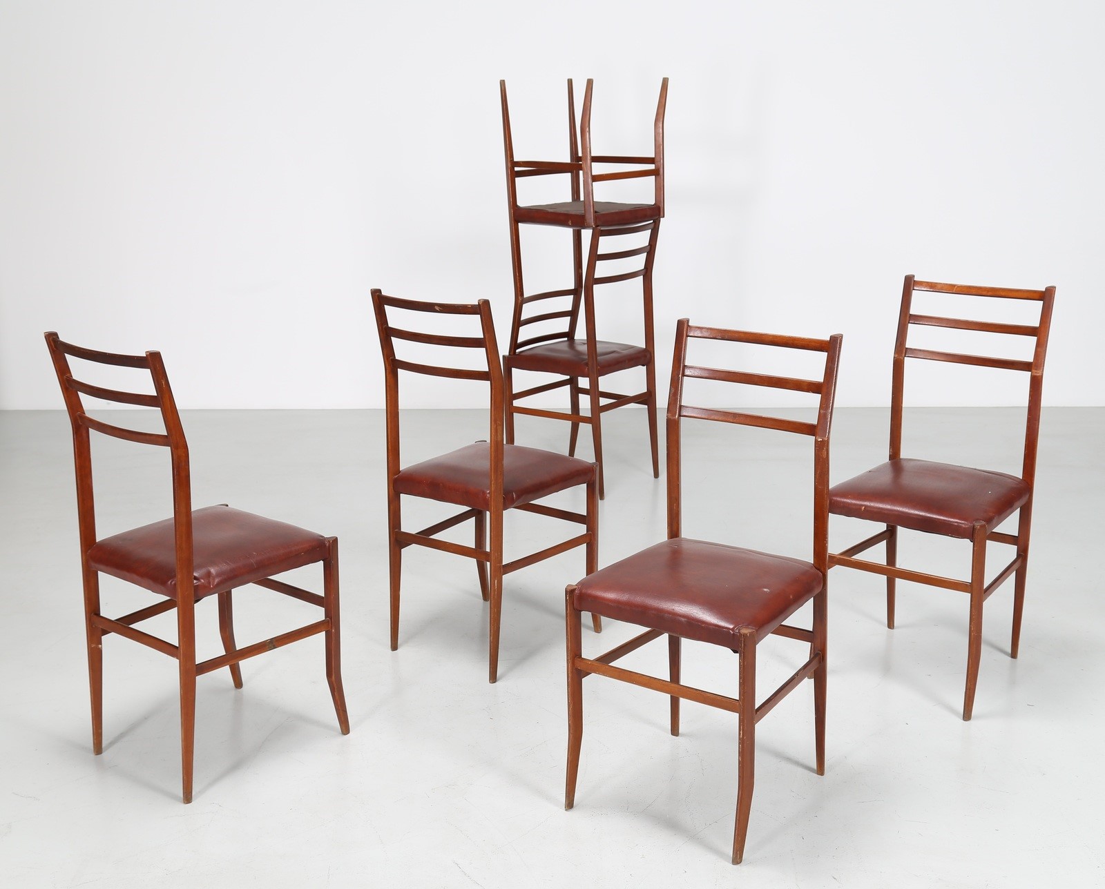MANIFATTURA ITALIANA Sei sedie. Legno di faggio e Skai. Cm 40,00 x 93,00 x 42,00. Struttura in legno di faggio, imbottitura e rivestimento in skai. Anni 60.
