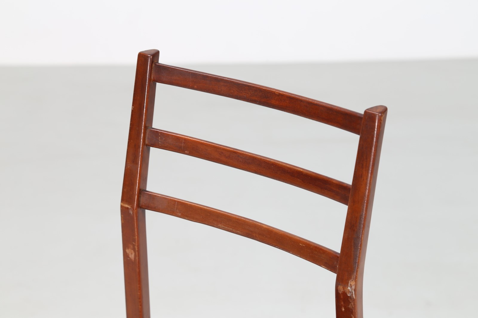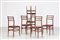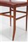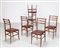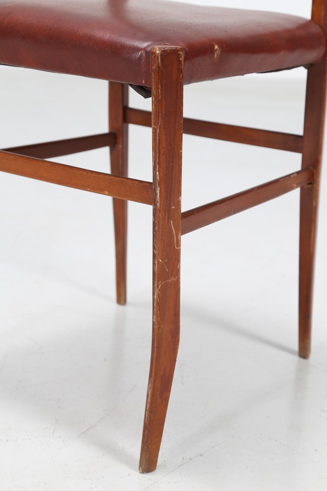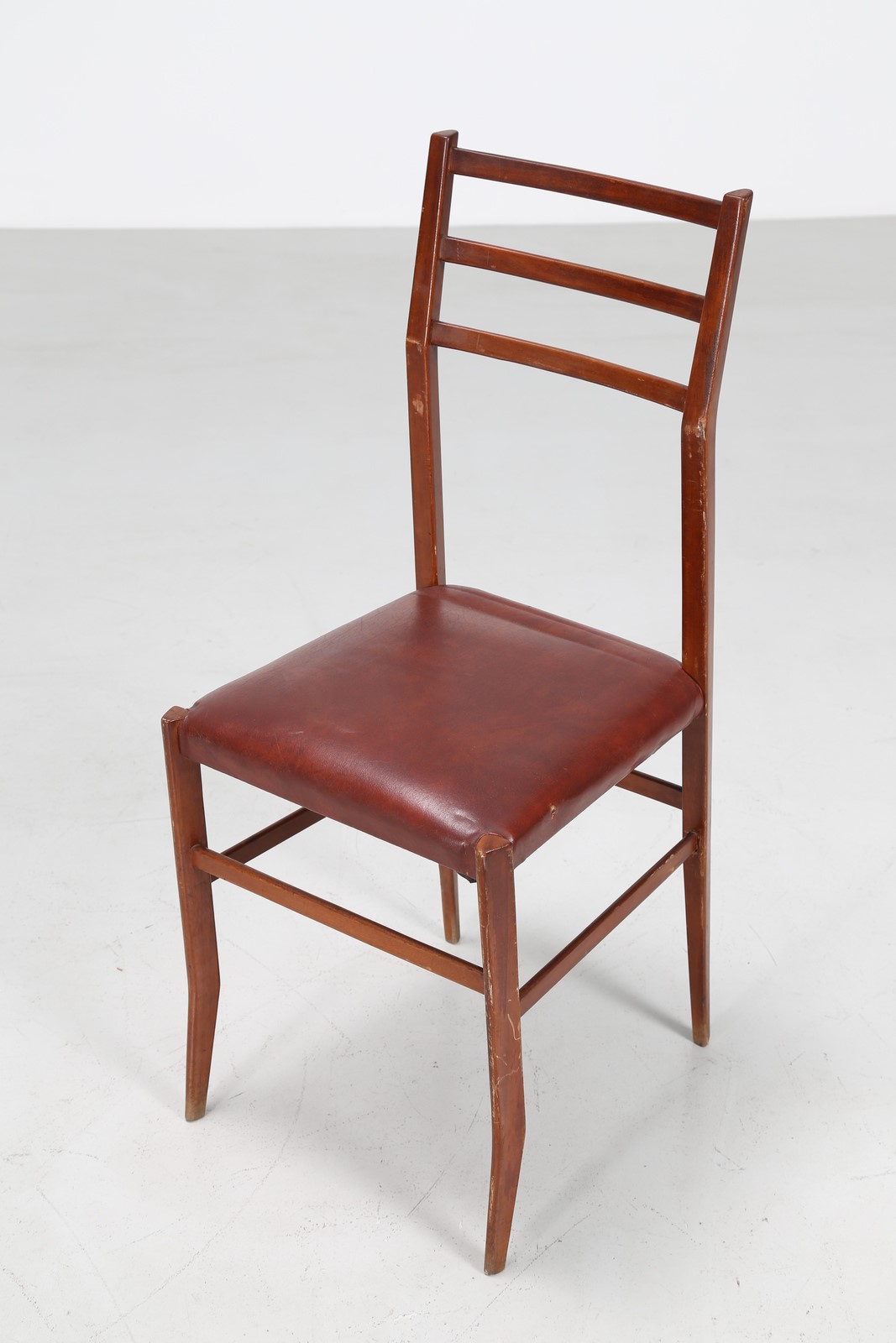 ITALIAN MANUFACTURE Six chairs. Beech and Skai. Cm 40,00 x 93,00 x 42,00. Beech wood structure, padding and skai covering. 60's.