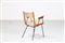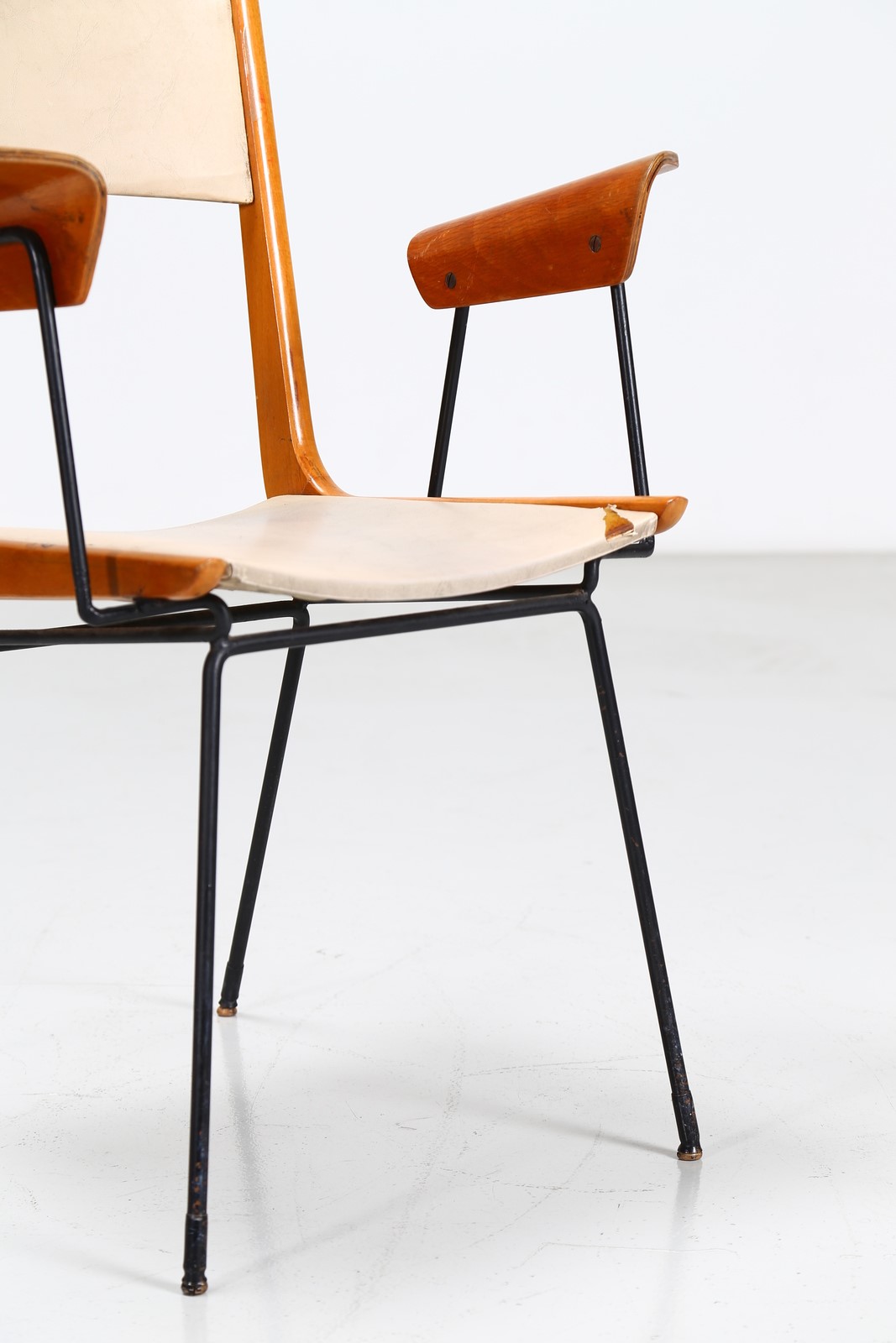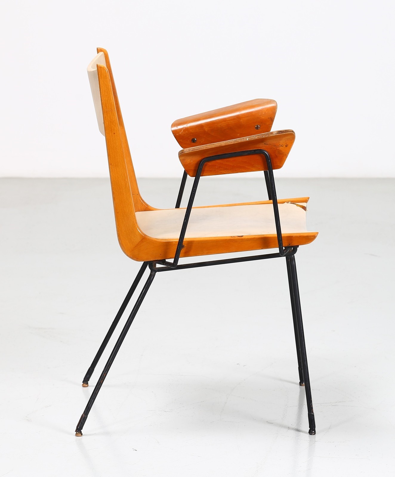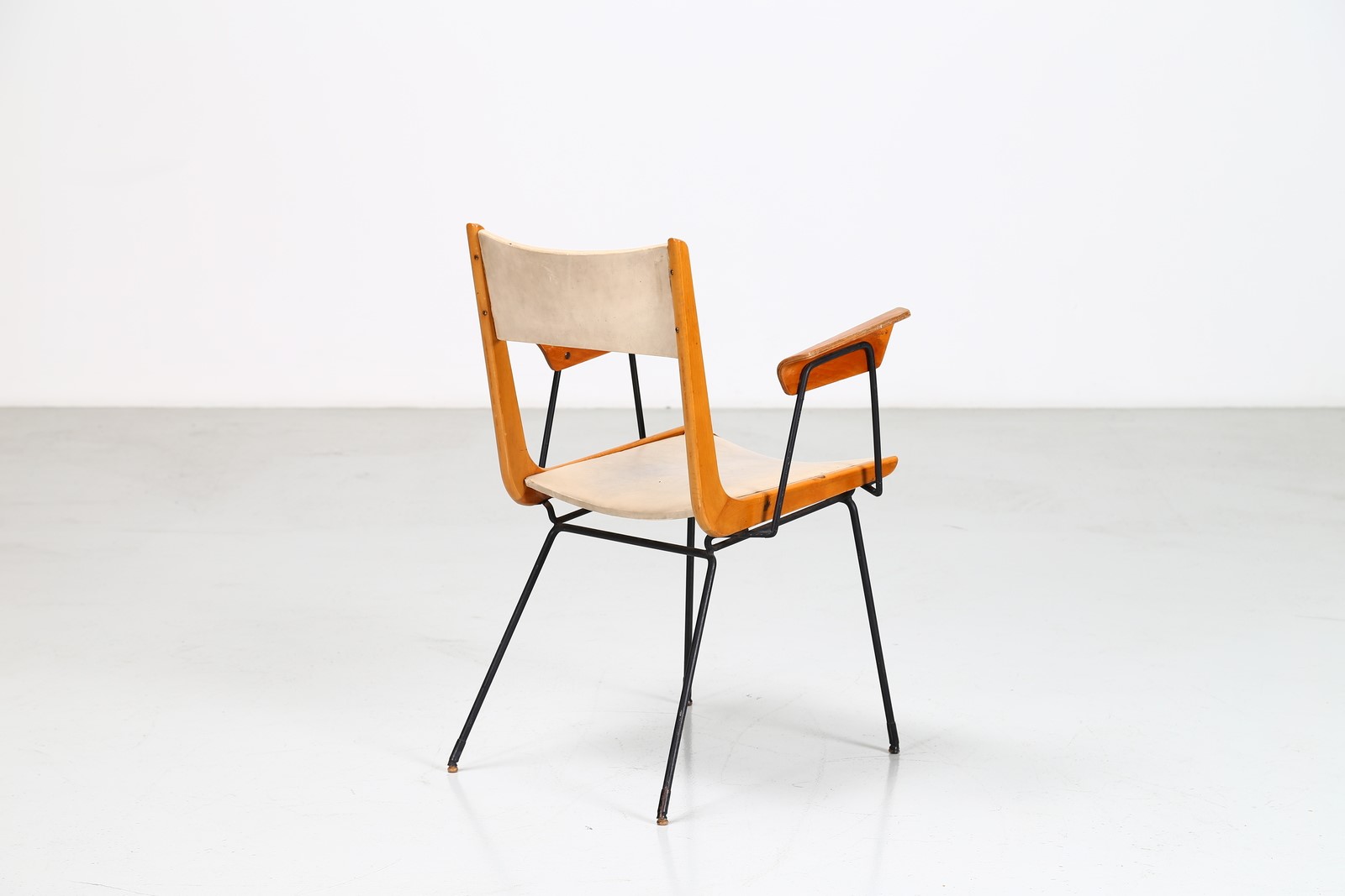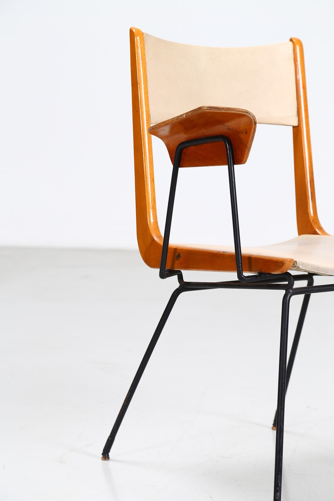 ITALIAN MANUFACTURE Chair. Iron, wood and fabric. Cm 60,00 x 81,50 x 63,00. Structure in iron rod, seat and back in wood and fabric. 50s.