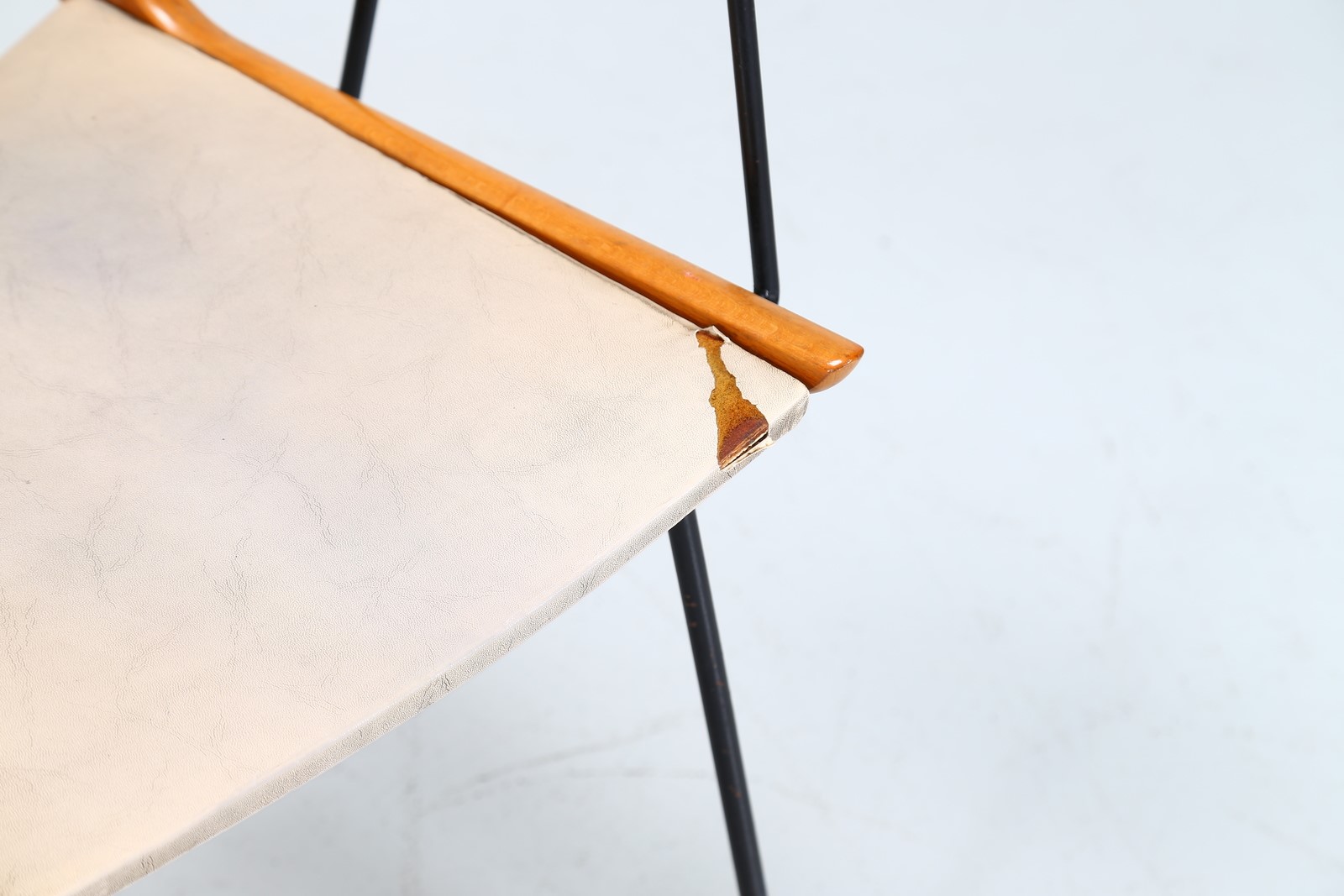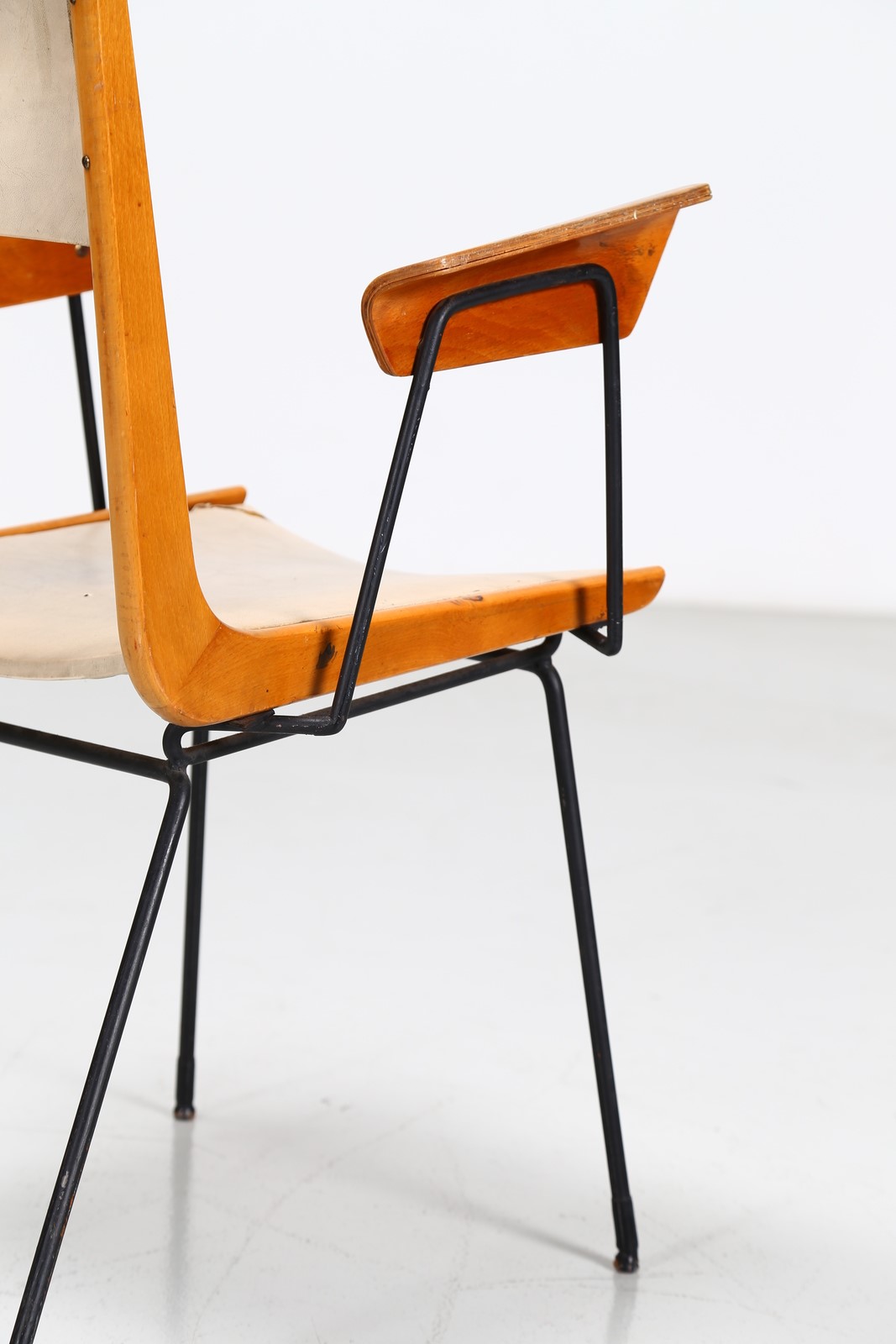 MANIFATTURA ITALIANA Sedia. Ferro, legno e tessuto. Cm 60,00 x 81,50 x 63,00. Struttura in tondino di ferro, seduta e schienale in legno e tessuto. anni 50.