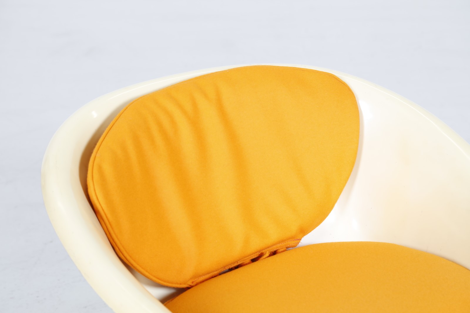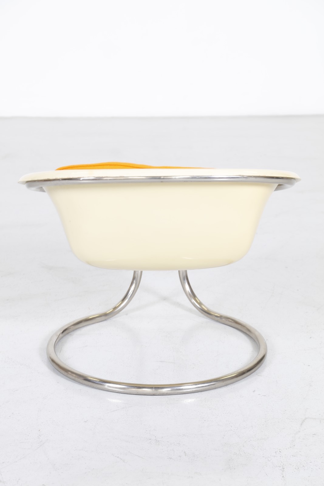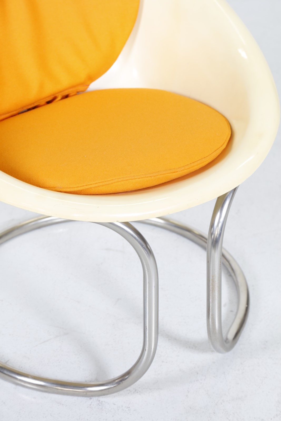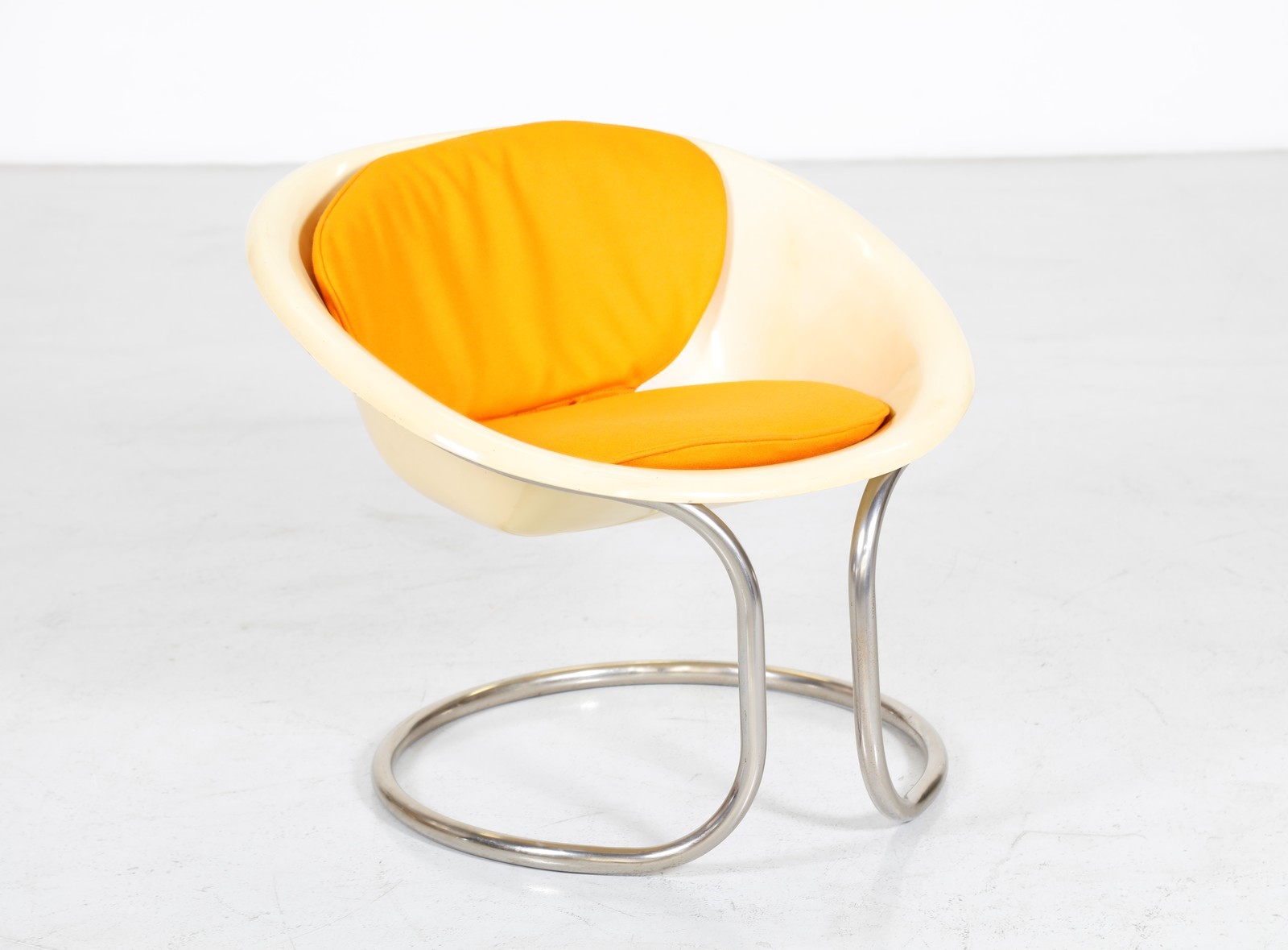 MANIFATTURA FRANCESE Poltroncina. Vetroresina e metallo. Cm 73,00 x 63,00 x 73,00. Base in metallo cromato, scocca in vetroresina con imbottitura e rivestimento in tessuto. Anni 70.