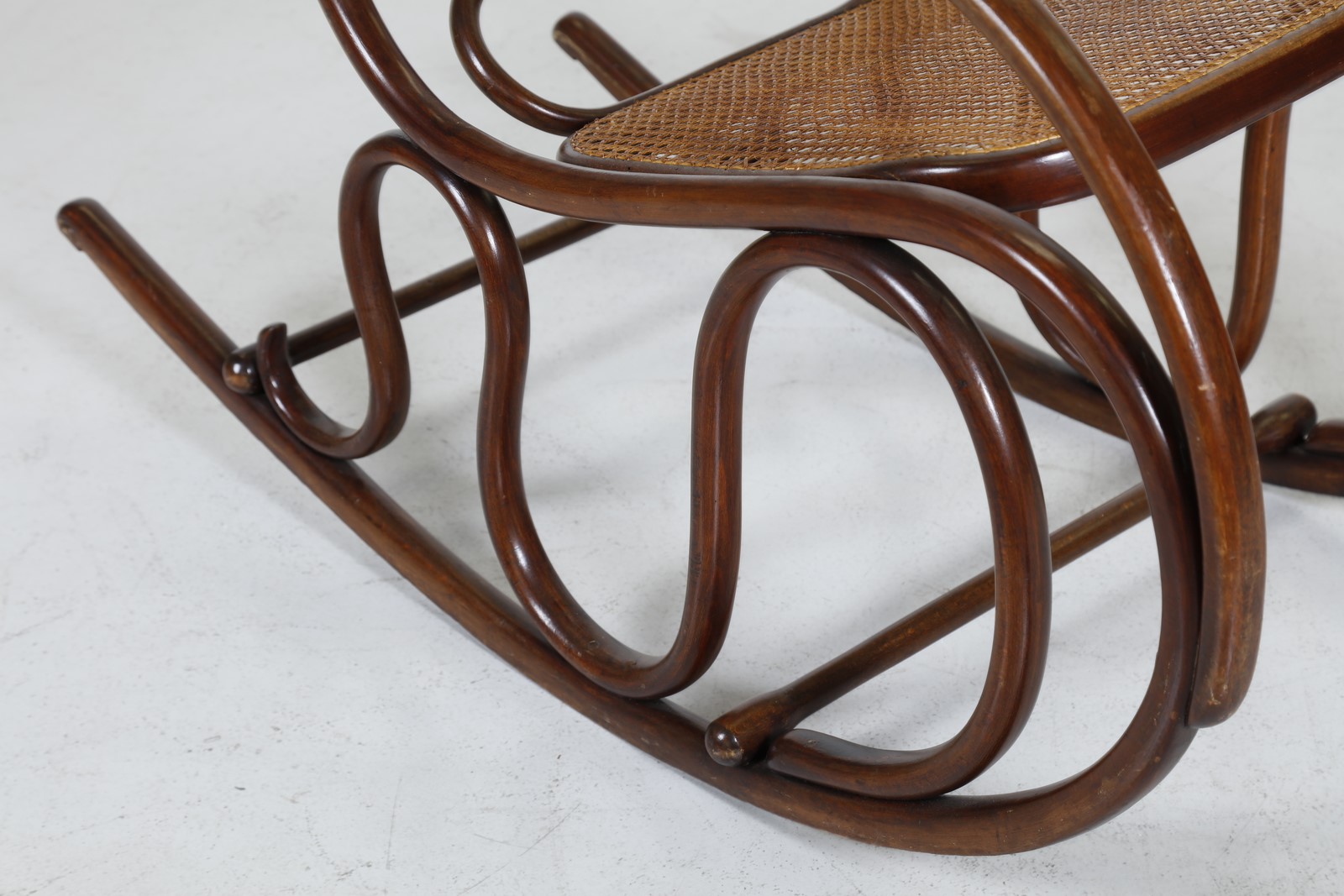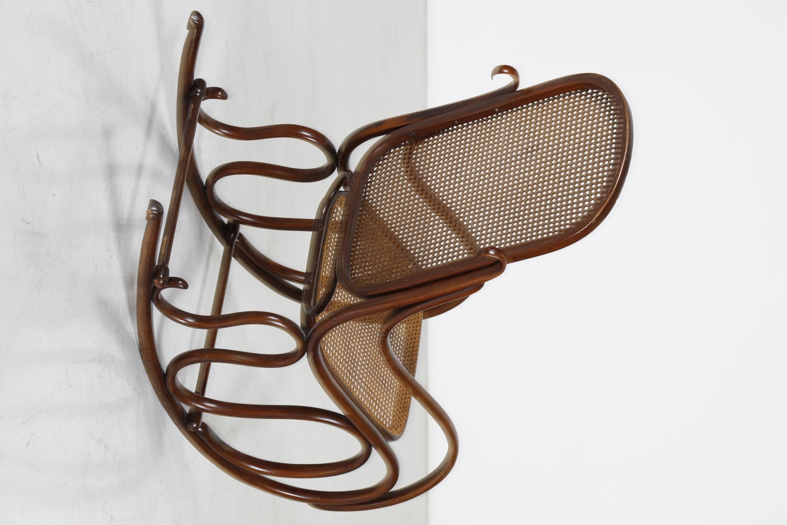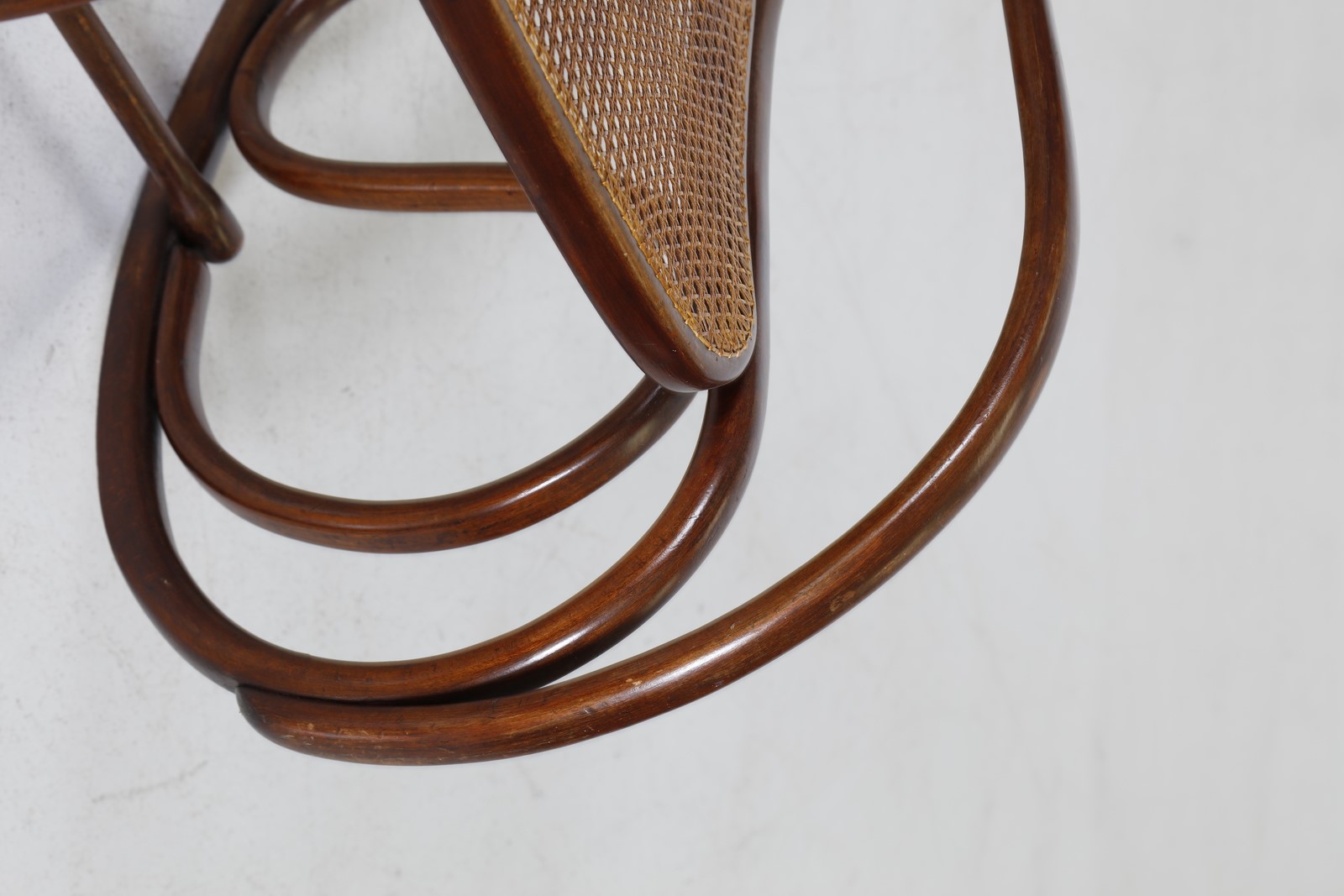 THONET, VIENNA Rocking chair. Wood and Vienna straw. Cm 60,00 x 110,00 x 120,00. Wooden frame and Vienna straw back. Publications: Domus, n. 432, November 1965, page 31