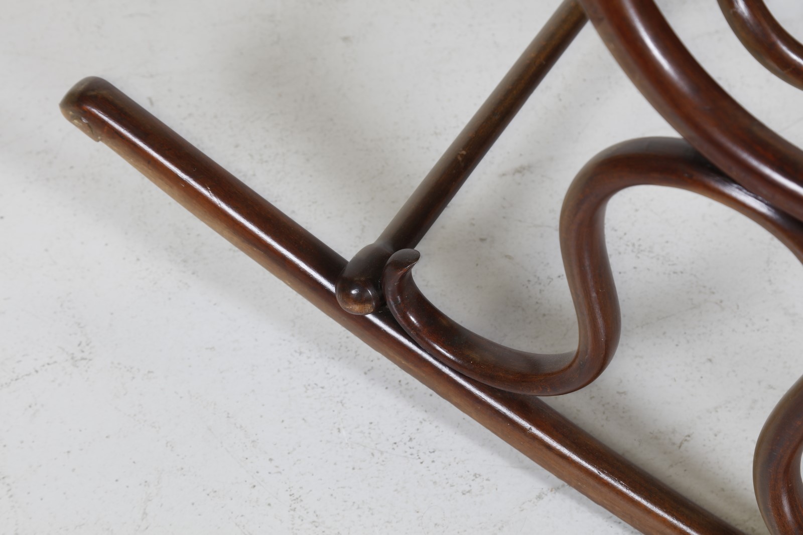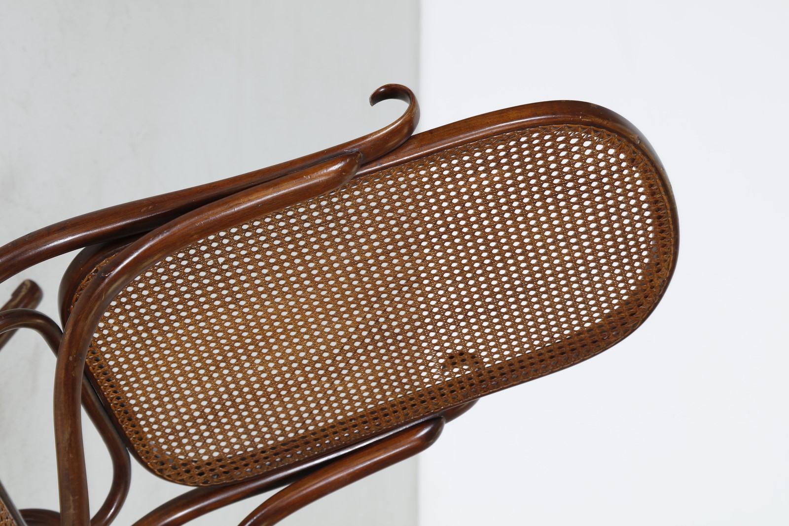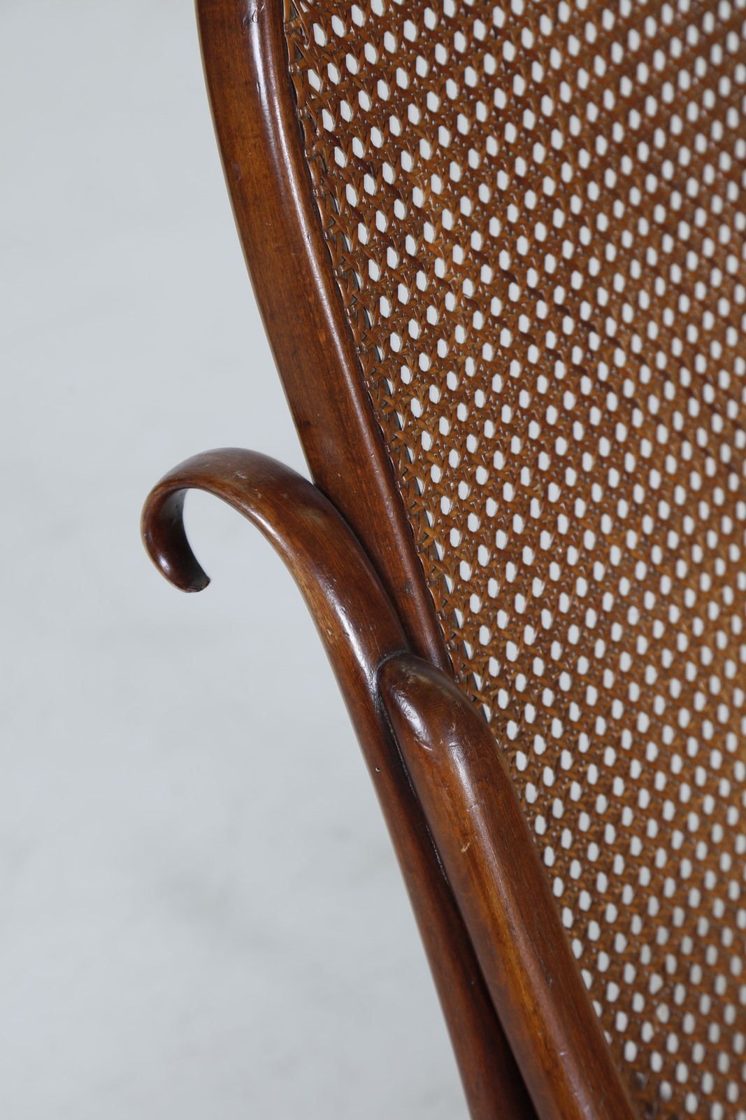 THONET, VIENNA Rocking chair. Wood and Vienna straw. Cm 60,00 x 110,00 x 120,00. Wooden frame and Vienna straw back. Publications: Domus, n. 432, November 1965, page 31