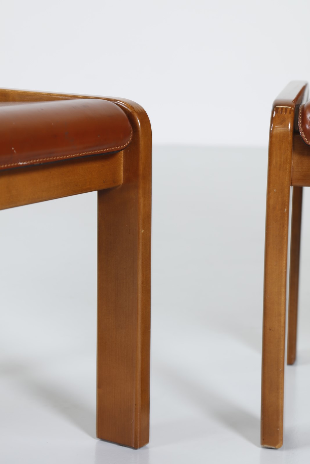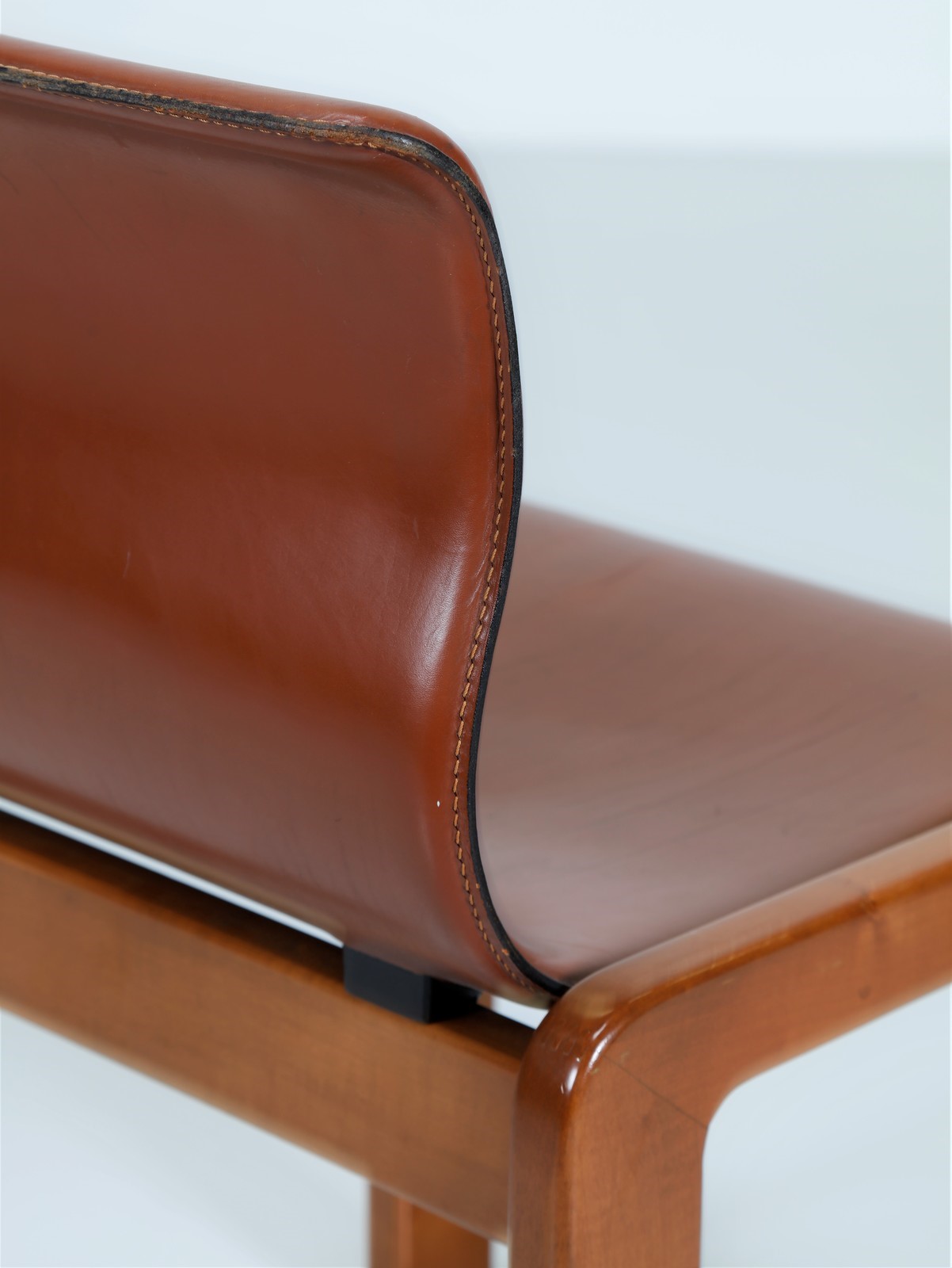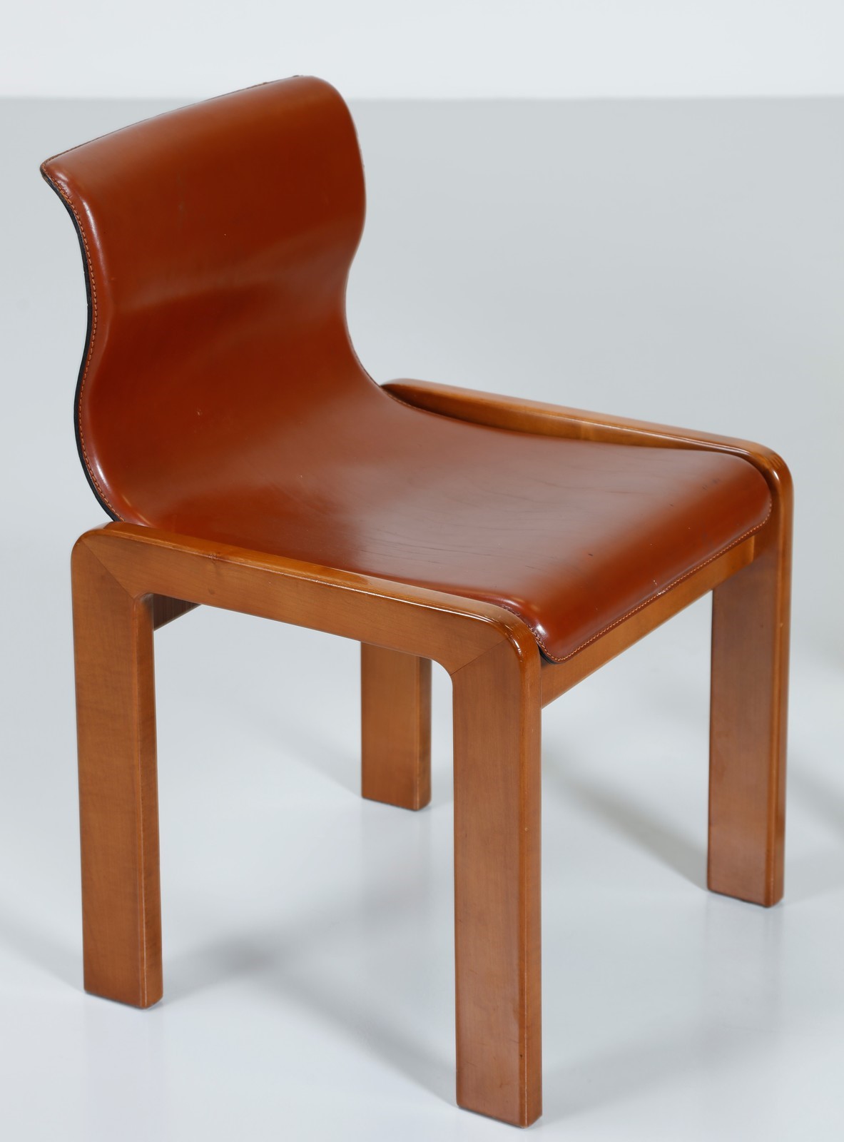 ITALIAN MANUFACTURE Five chairs. Wood and leather. Cm 48,50 x 74,00 x 48,00. Wooden structure, padding and leather covering, 70s.