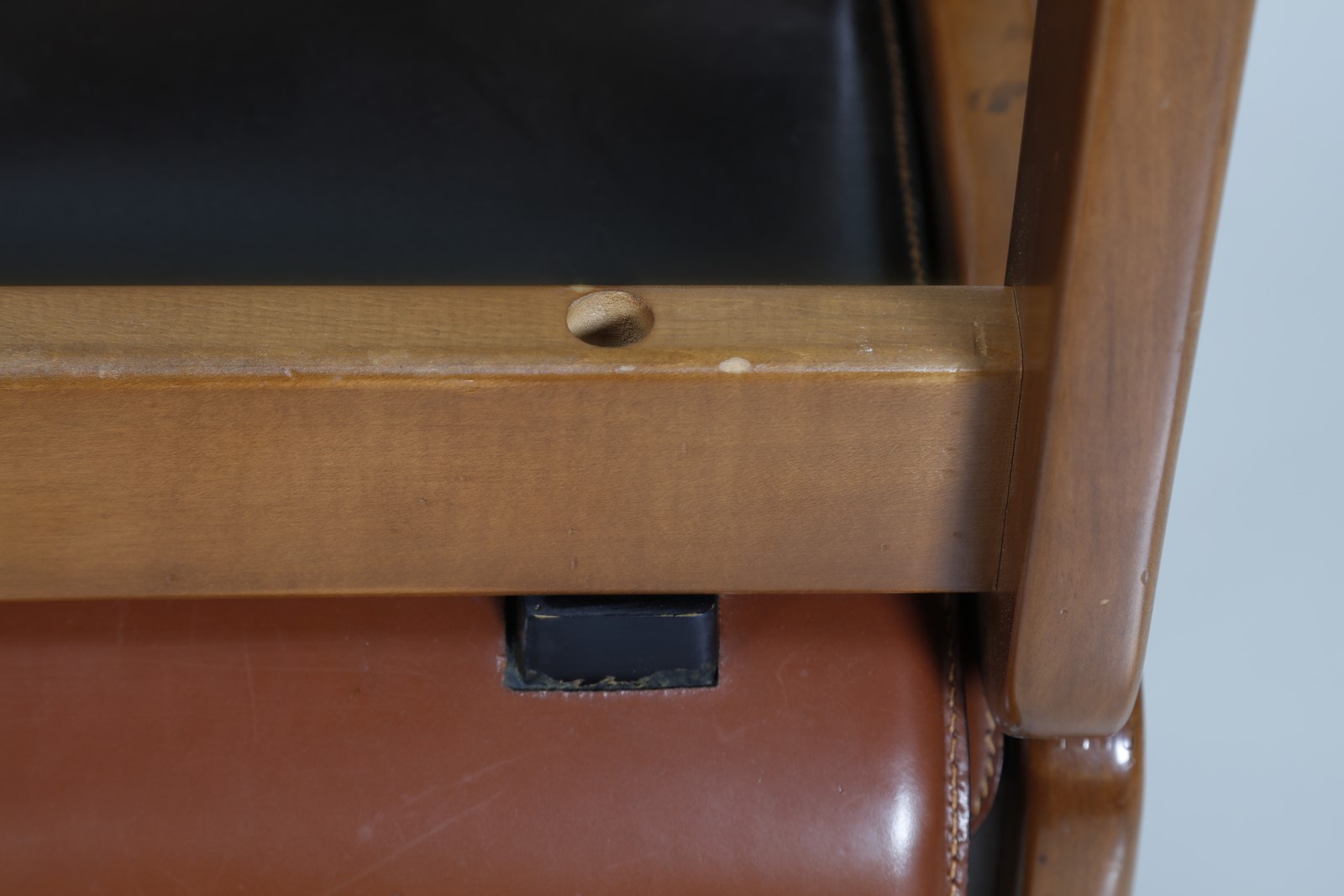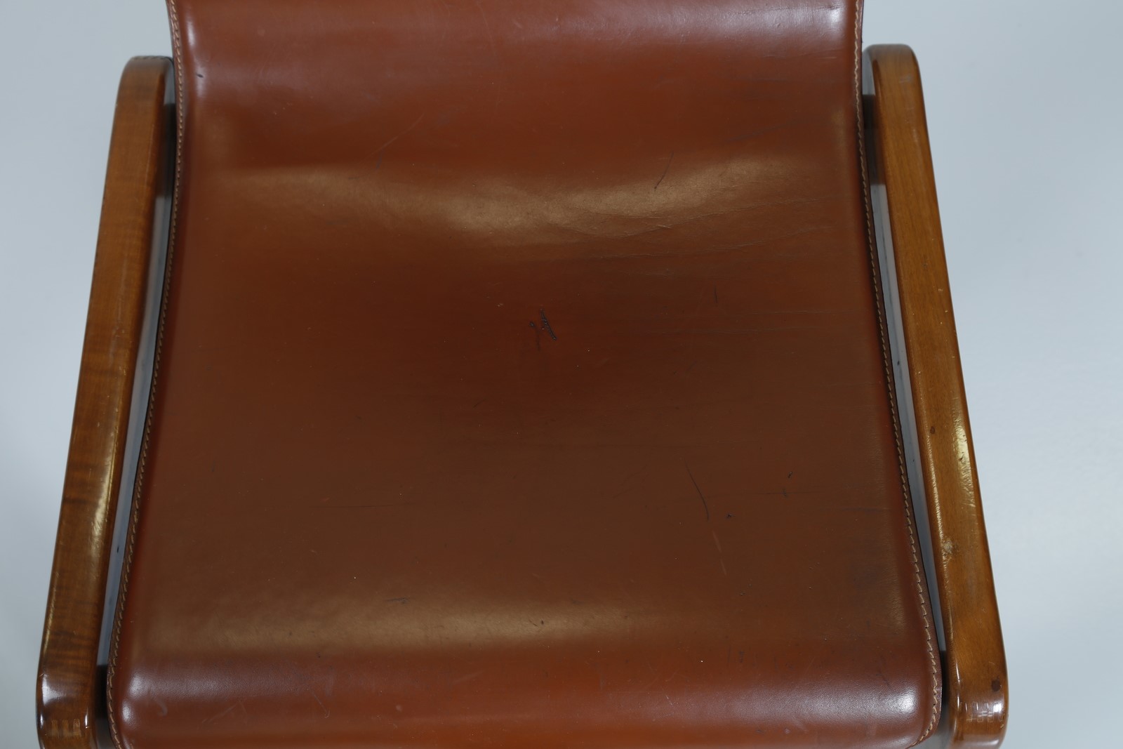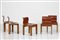 MANIFATTURA ITALIANA Cinque poltroncine. Legno e cuoio. Cm 48,50 x 74,00 x 48,00. Struttura in legno, imbottitura e rivestimento in cuoio, anni 70.