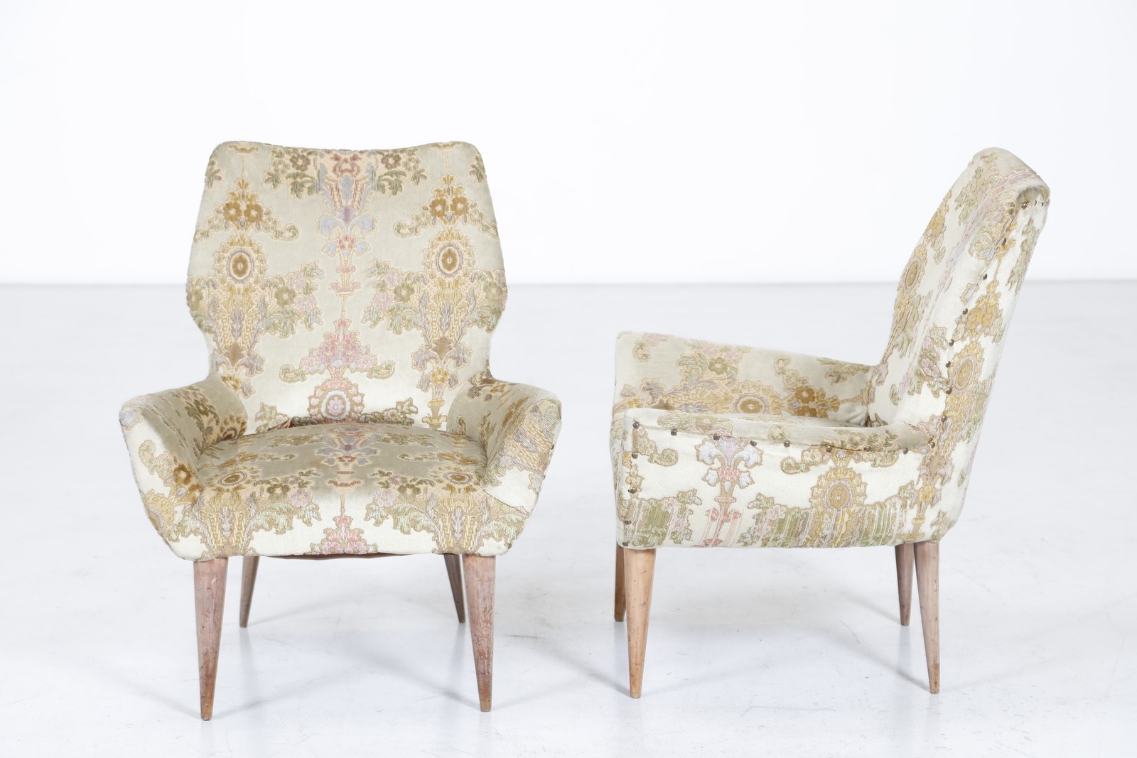 ITALIAN MANUFACTURE Pair of armchairs. Wood and fabric. Cm 63,00 x 77,00 x 64,00. Wooden structure, fabric upholstery and padding.
