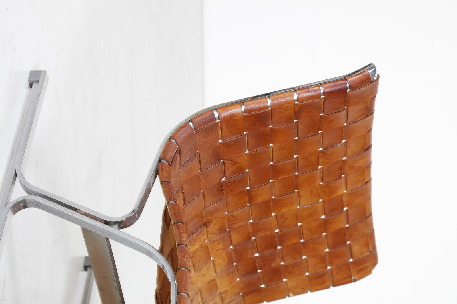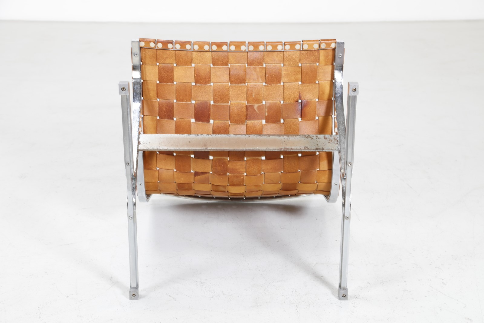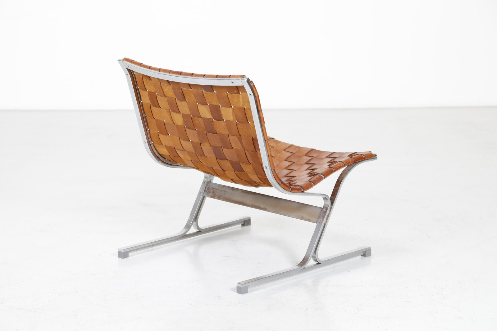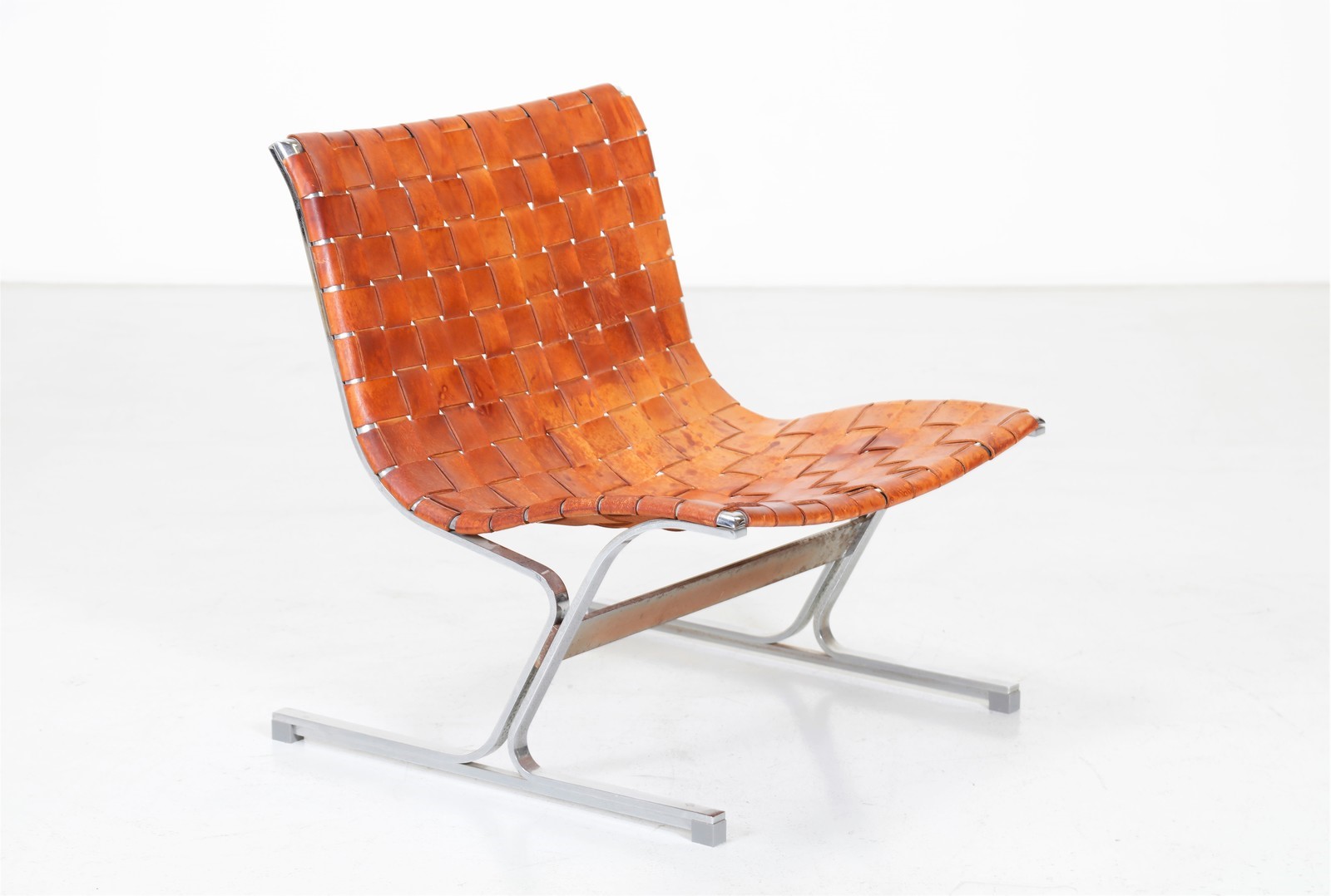 LITTEL ROSS (1929 - 2000) Lounge chair. Chrome metal and leather. Cm 66,00 x 74,00 x 68,00. Chromed metal structure with woven leather back and seat. Model PLR1, For ICF De Padova, 60s.