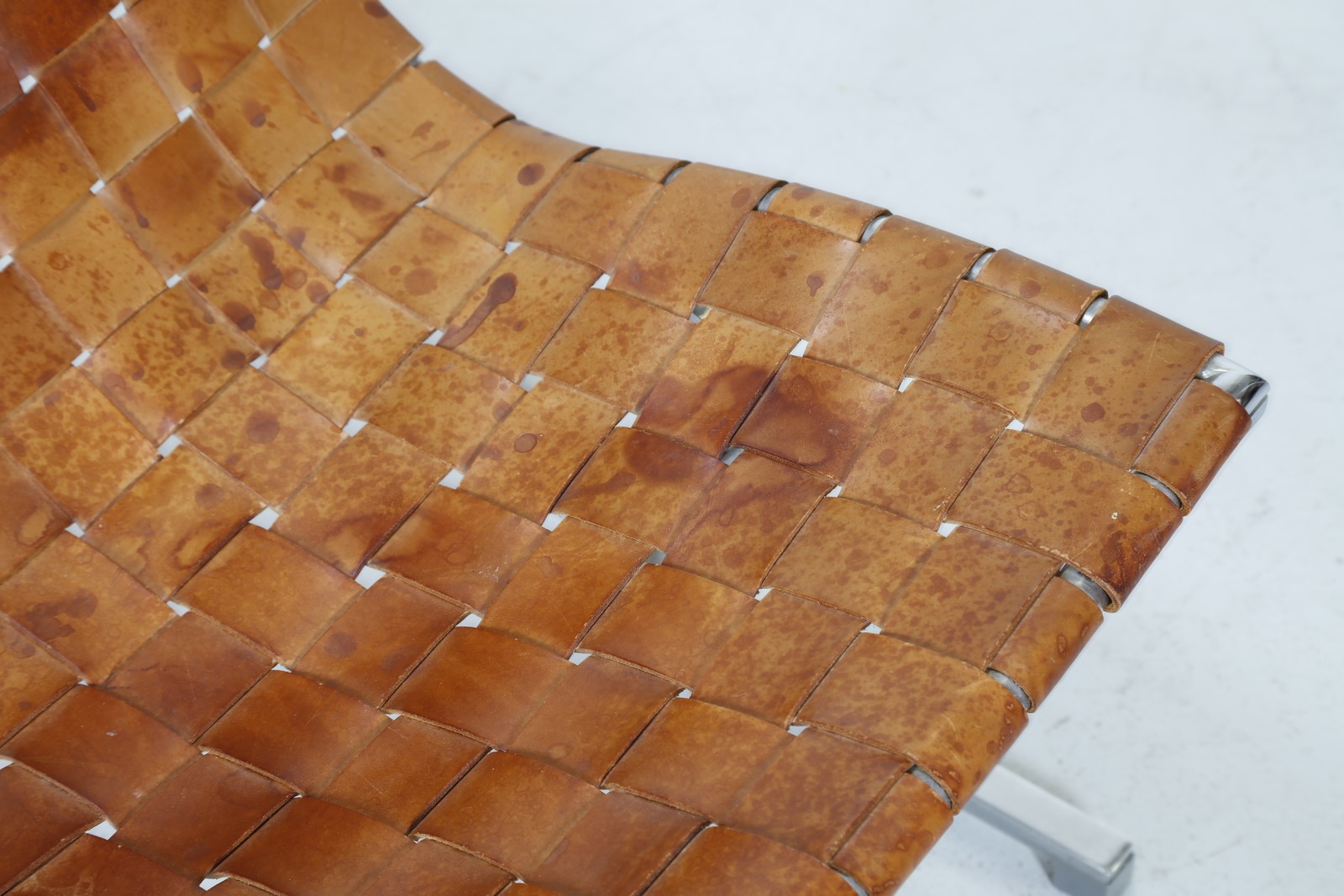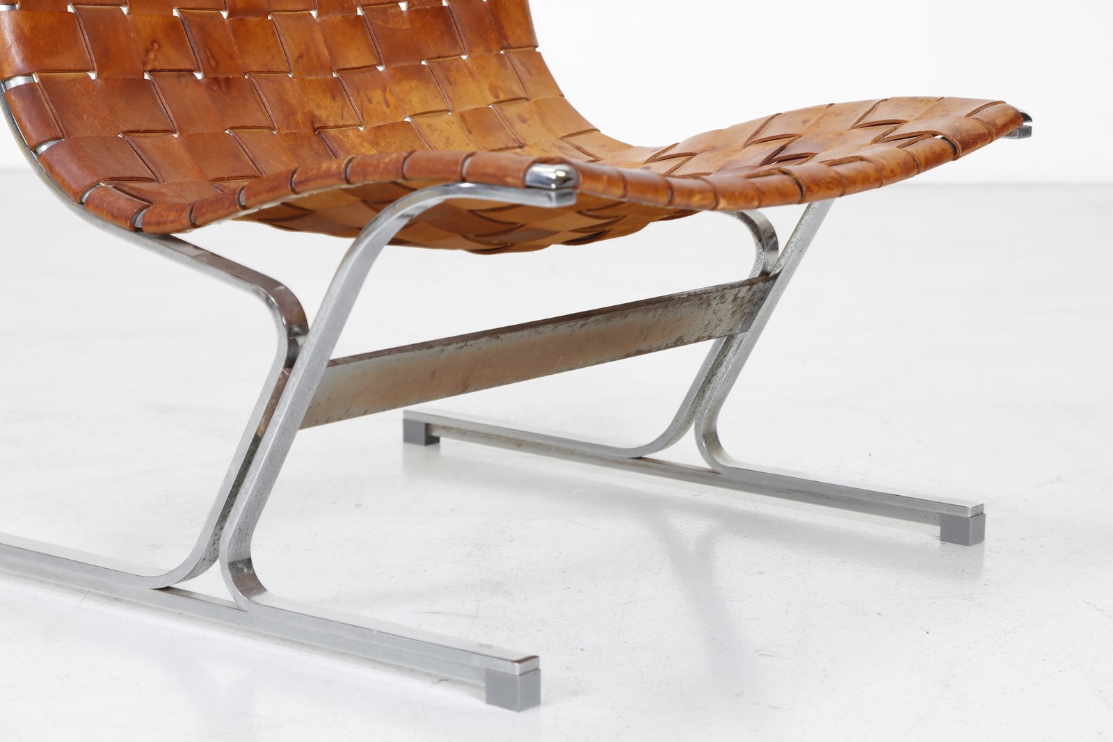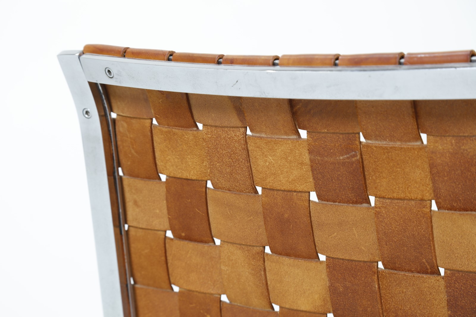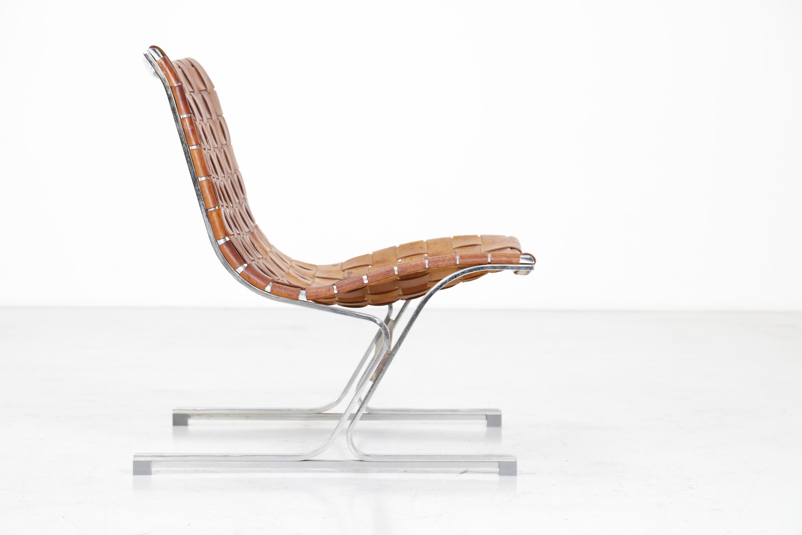 LITTEL ROSS (1929 - 2000) Lounge chair. Chrome metal and leather. Cm 66,00 x 74,00 x 68,00. Chromed metal structure with woven leather back and seat. Model PLR1, For ICF De Padova, 60s.