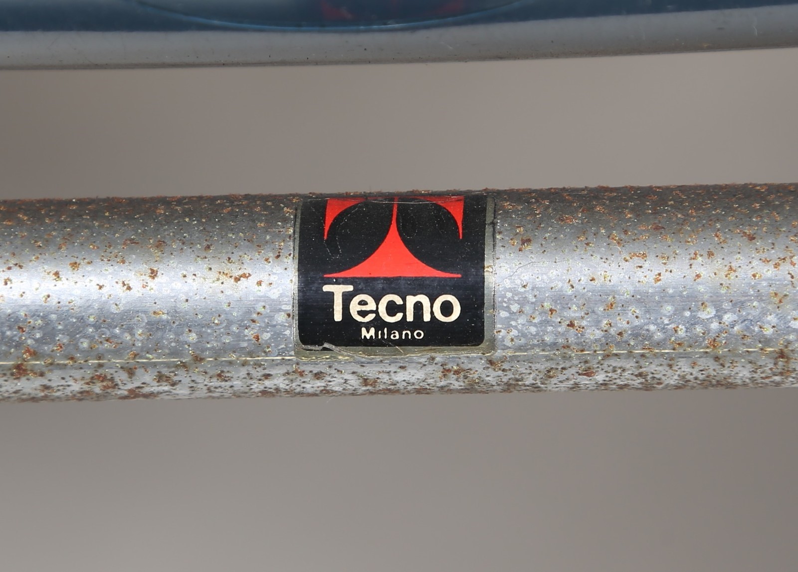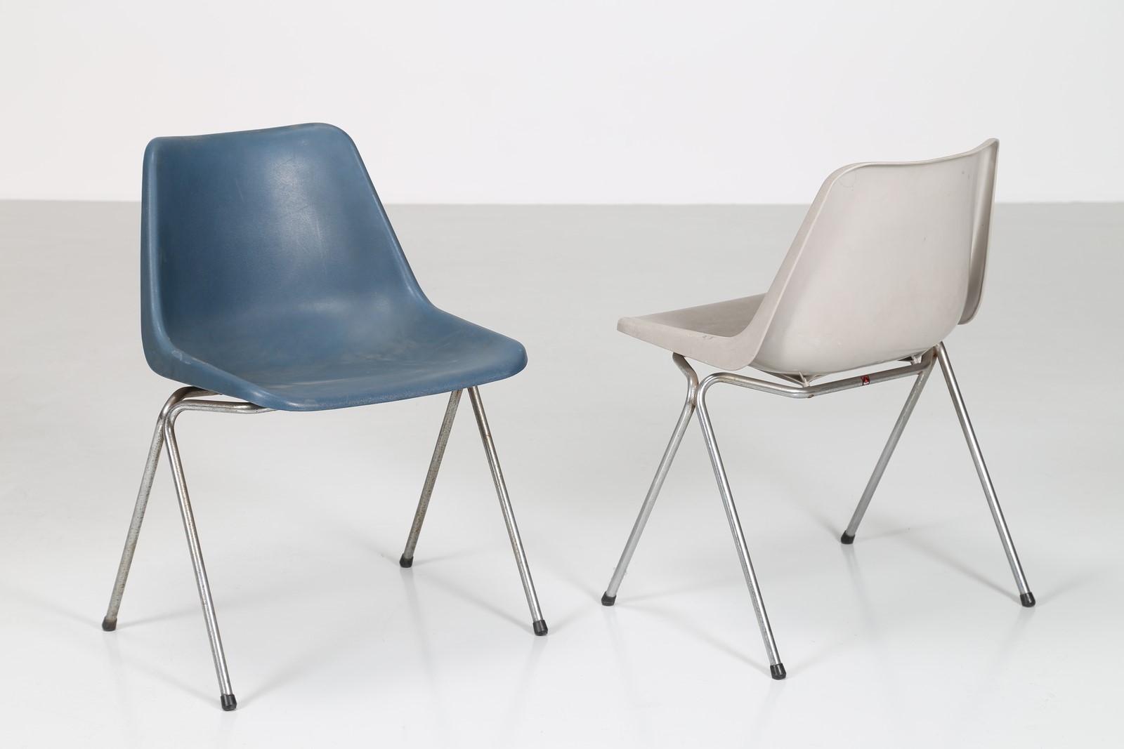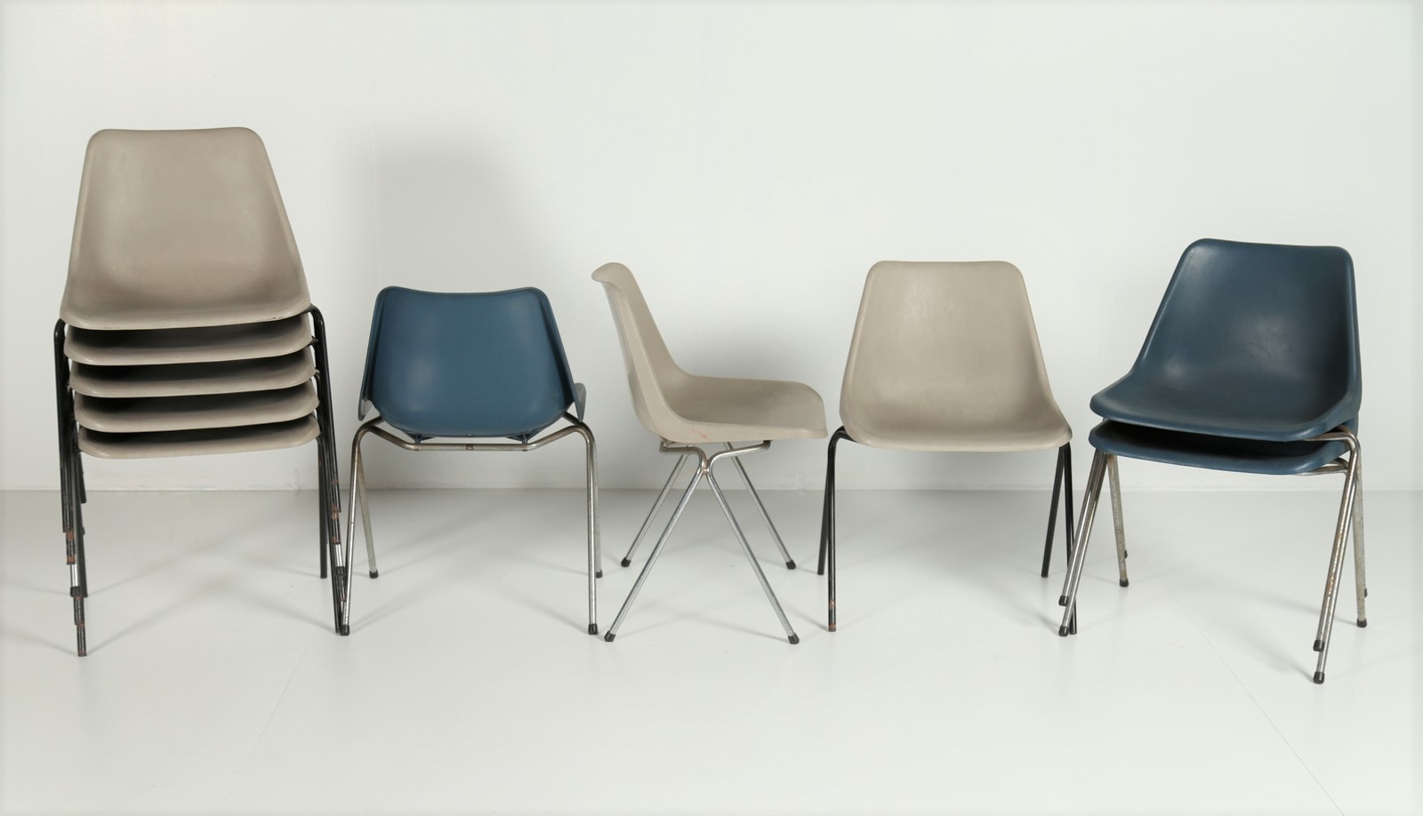 ROBIN DAY (1915 - 2010) Ten chairs. Chromed metal, ABS. Cm 50,00 x 73,00 x 45,00. Structure in chromed metal tube, shell in ABS in different colors. Per Tecno (Brand of the manufacturing company), 1970s.
