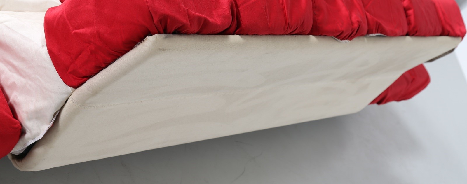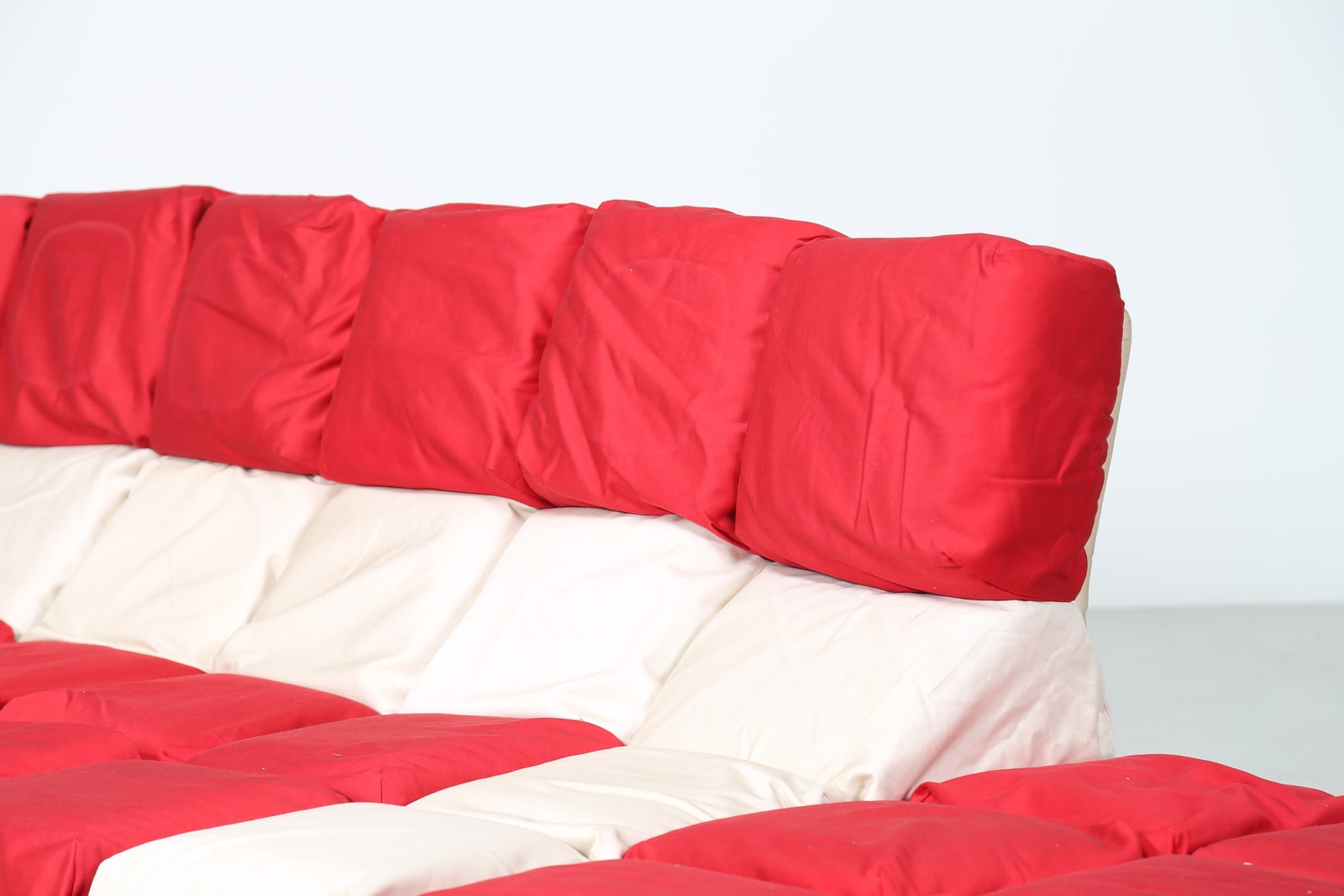 ROBERTO PAMIO e RENATO TOSO Sofa. Metal and fabric. Cm 270,00 x 74,00 x 82,00. Metal frame, padding and fabric covering. Scacco Matto model, for Artflex, 80s.