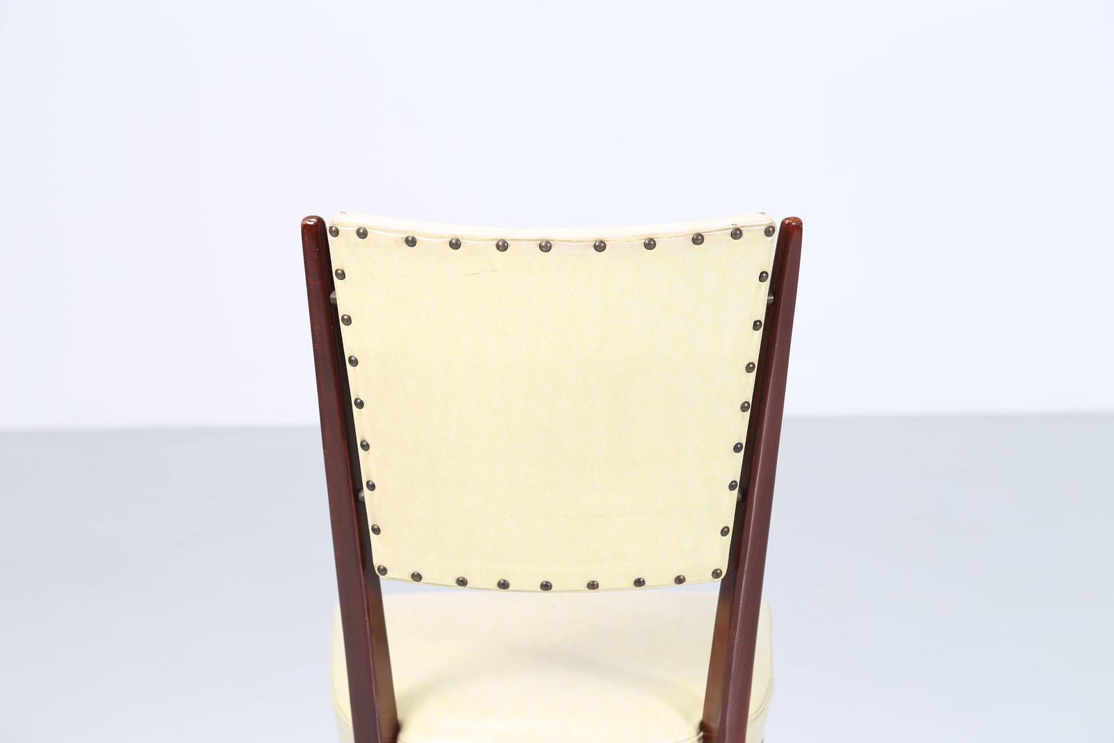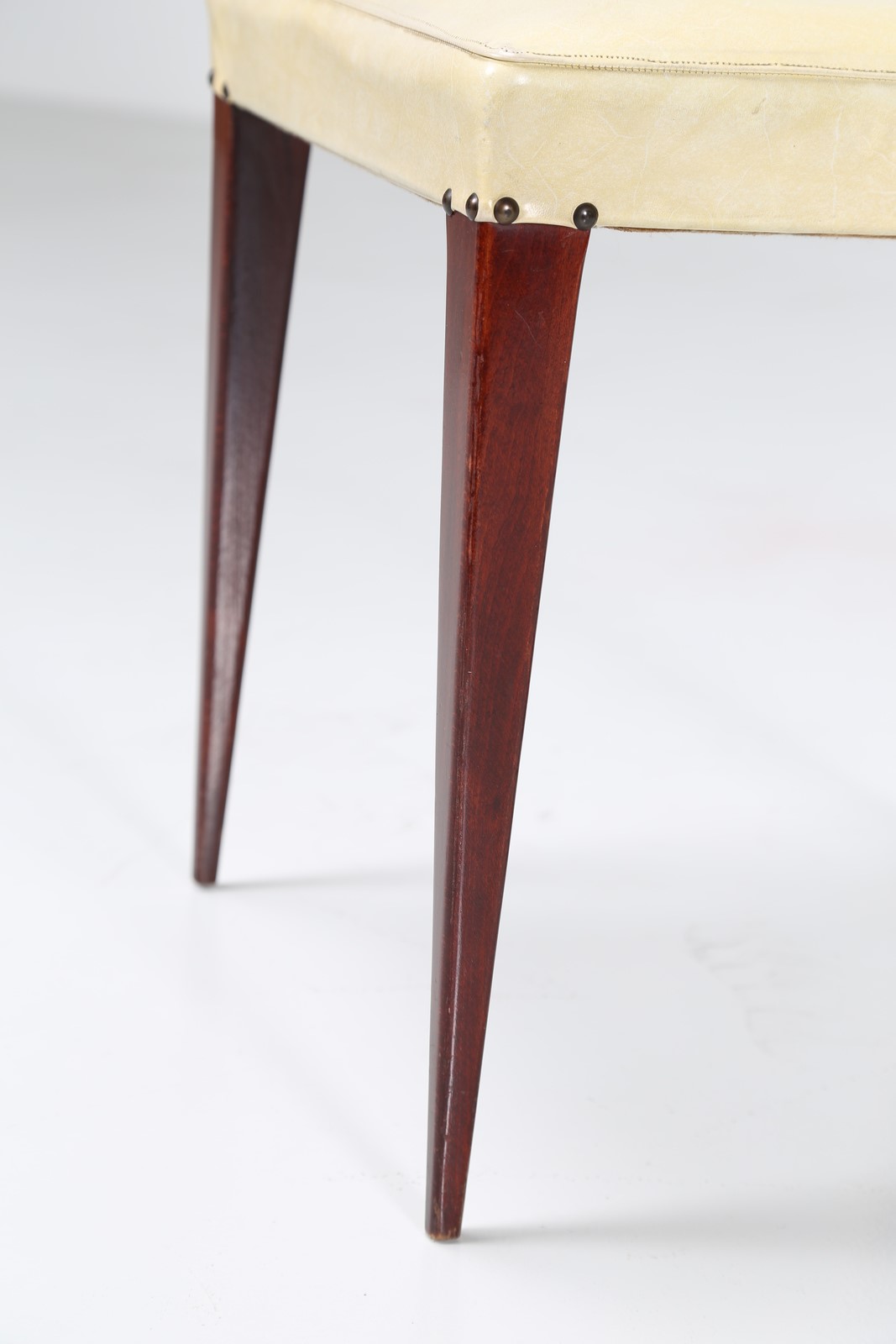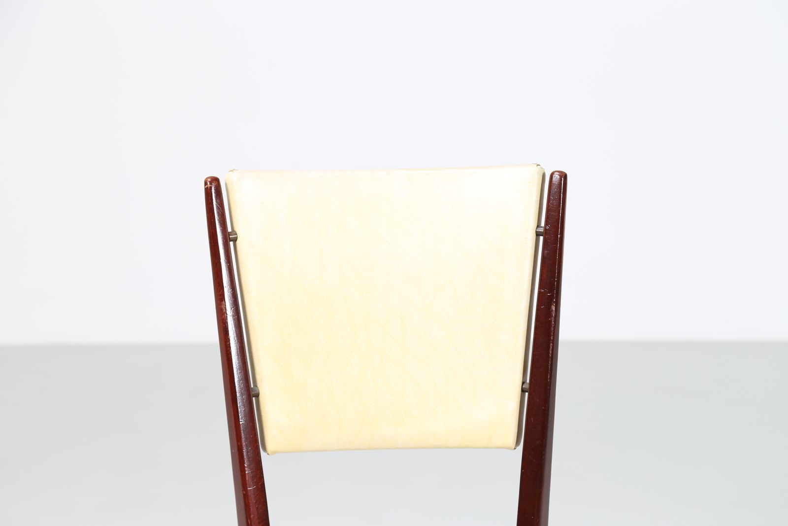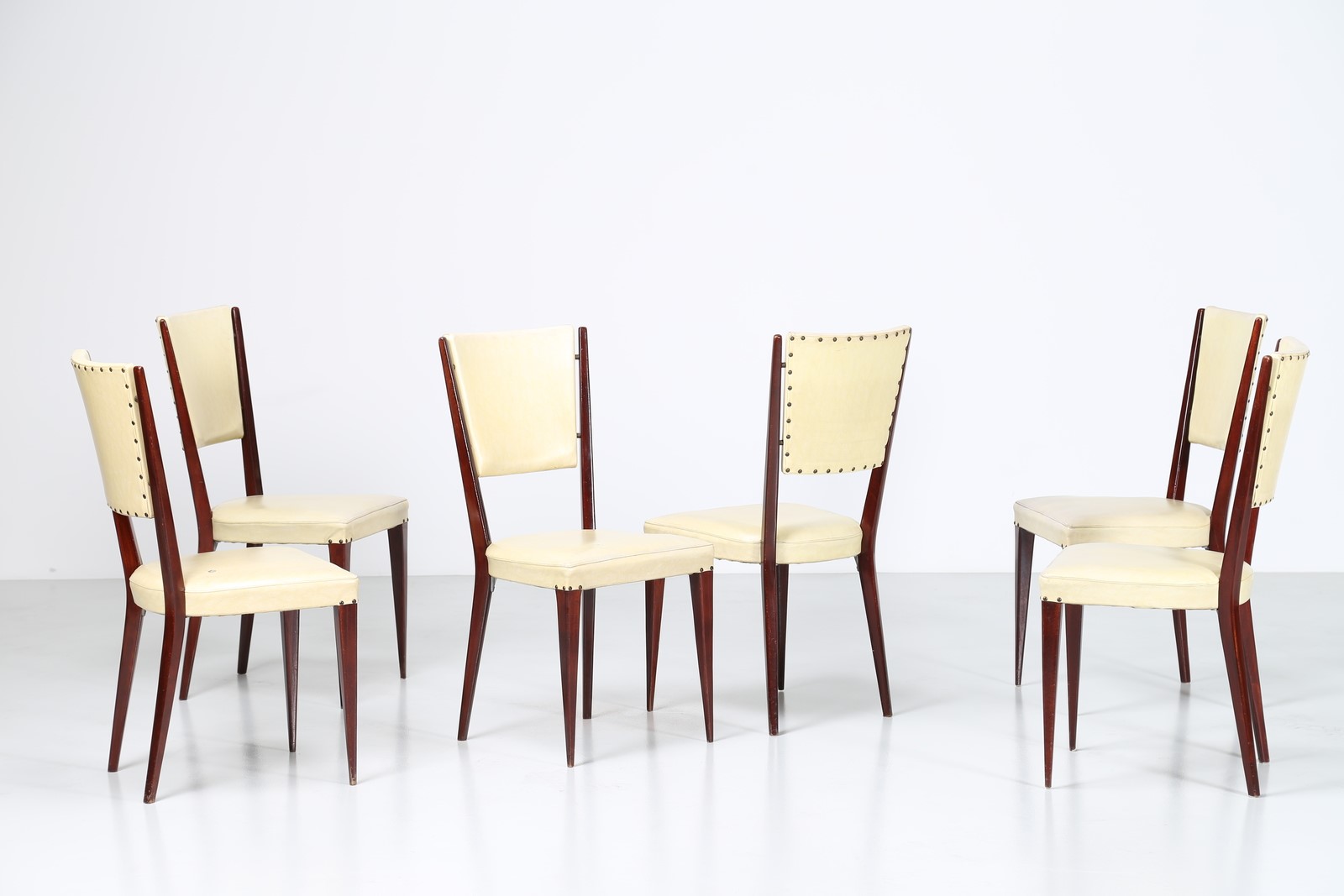 DASSI M.M. Six chairs. Wood and skai. Cm 44,00 x 92,50 x 52,00. Wooden frame, brass details, padding and skai covering. Modern Furniture Production, Lissone, 1960s.
