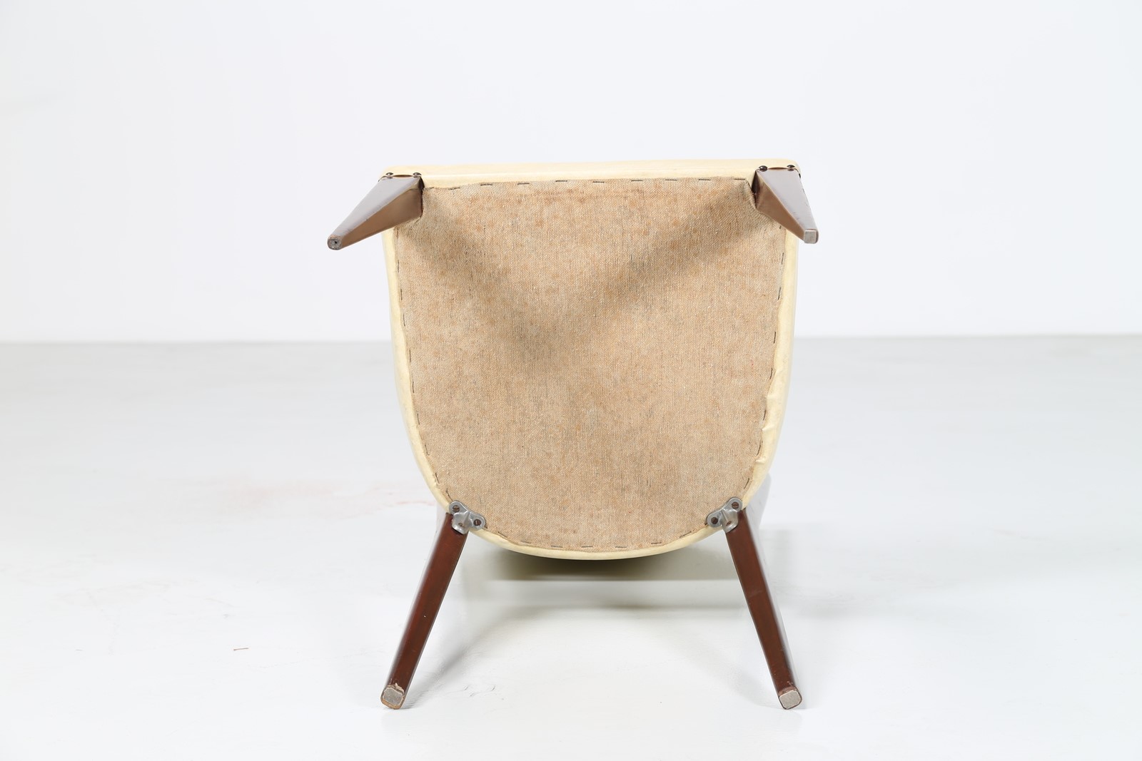 DASSI M.M. Sei sedie. Legno e skai. Cm 44,00 x 92,50 x 52,00. Struttura in legno, dettagli in ottone, imbottitura e rivestimento in skai. Produzione Dassi Mobili Moderni, Lissone, anni 60.