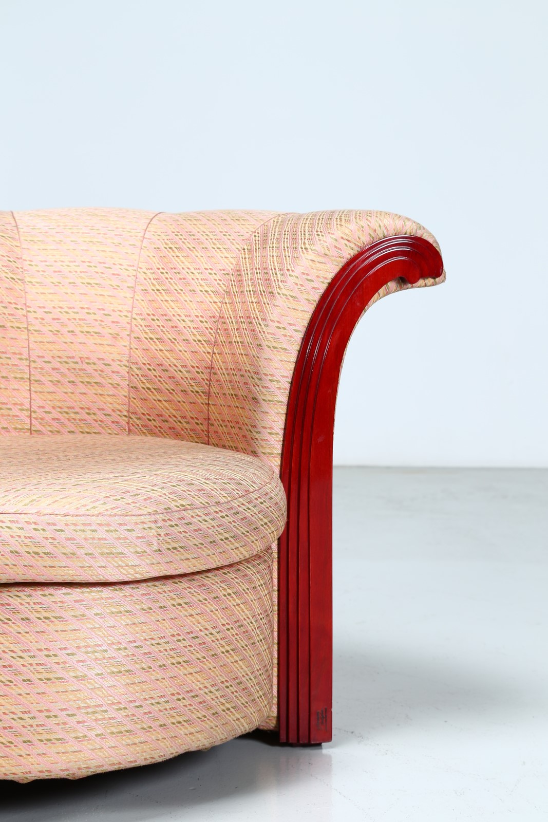 PORTOGHESI PAOLO (n. 1931) Liuto armchair. Wood and fabric. Cm 110,00 x 75,00 x 90,00. Wooden structure, padding and fabric covering. For Poltronova, company brand and signature of the author present, 70s.