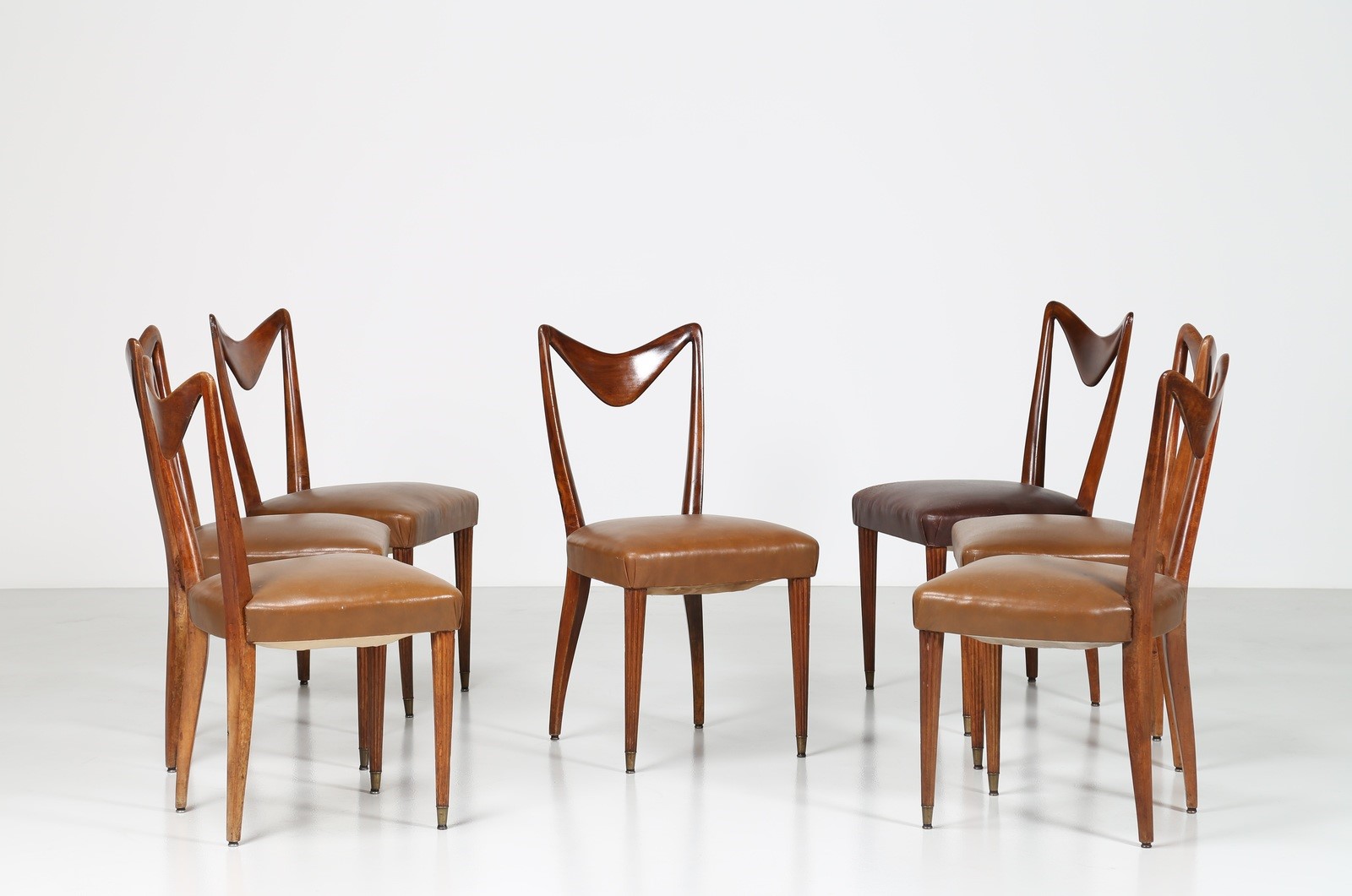 SCREMIN LUIGI (1896 - 1983) Sette sedie. Legno di noce e skai. Cm 47,00 x...