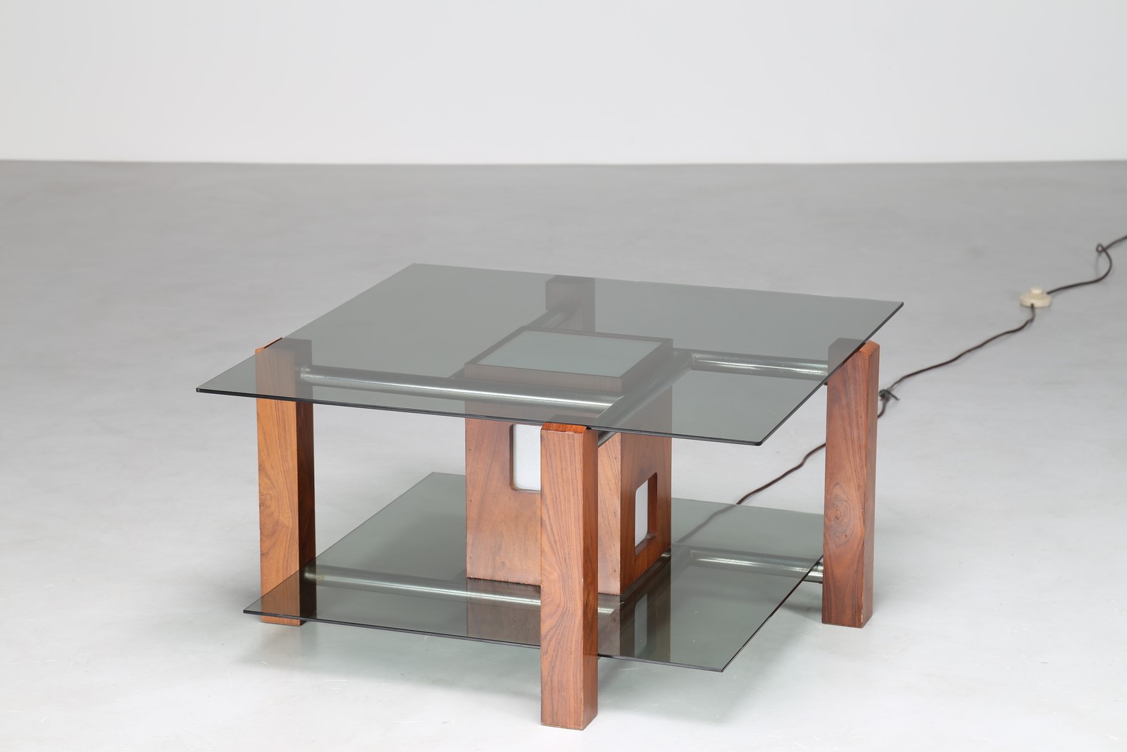 ITALIAN MANUFACTURE Coffee table. Walnut wood, metal and glass. Cm 81,50 x 41,00 x 80,50. Base in walnut wood, supports in chromed metal, double glass top with lamp. 70's.