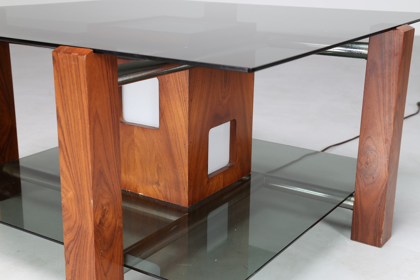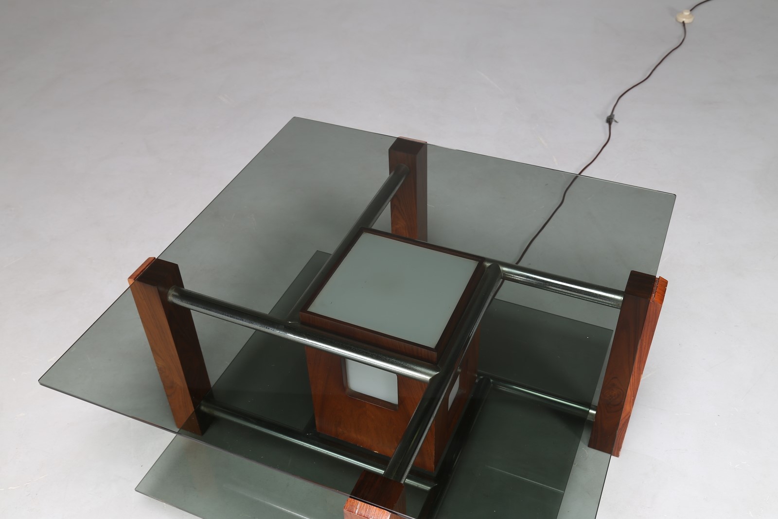 MANIFATTURA ITALIANA Tavolino da caffè. Legno di noce, metallo e vetro. Cm 81,50 x 41,00 x 80,50. Base in legno di noce, sostegni in metallo cromato, doppio piano in vetro con lampada. Anni 70.