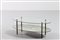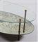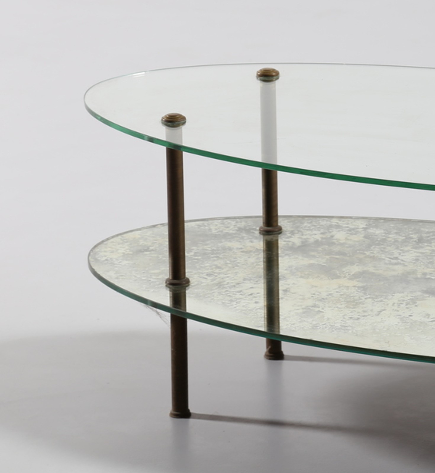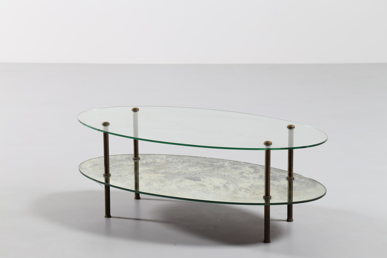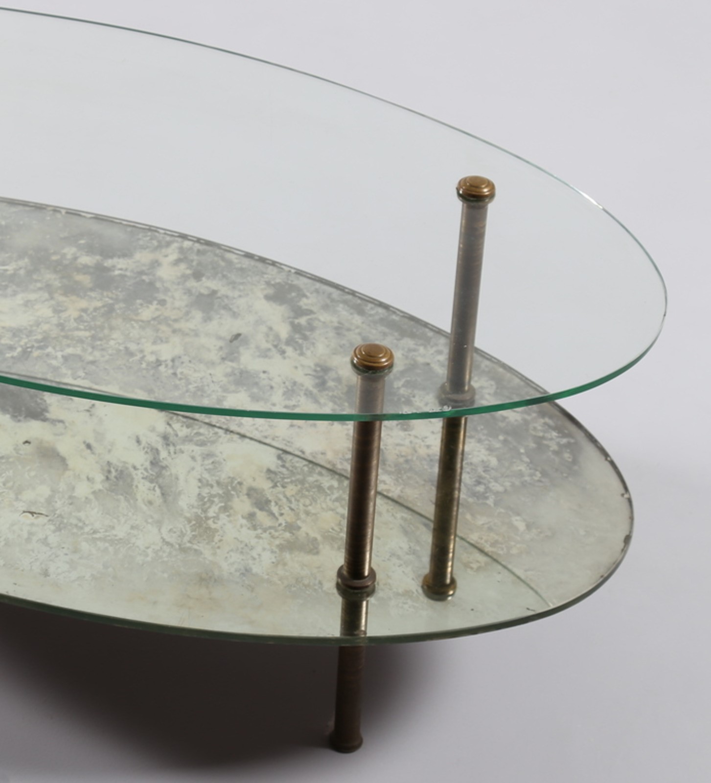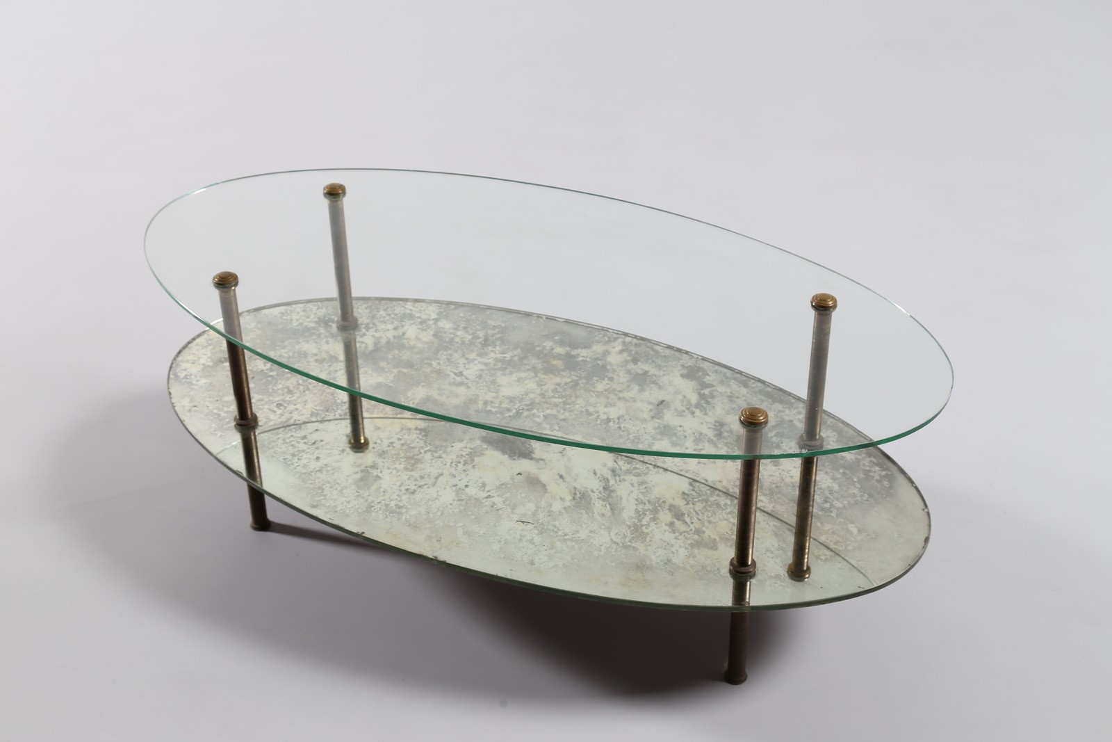 MANIFATTURA ITALIANA Tavolino ovale. Ottone e vetro. Cm 110,00 x 56,50 x 42,00. Gambe in ottone, piano inferiorie in vetro, piano superiore in specchio,anni 40.