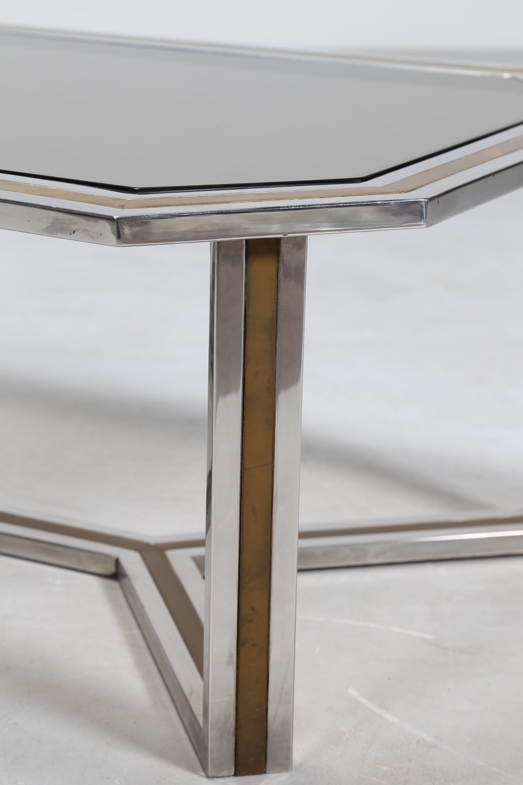. Chromed metal and glass. Cm 110,00 x 40,00 x 69,00. Chromed metal and brass base, glass top. 70's.
