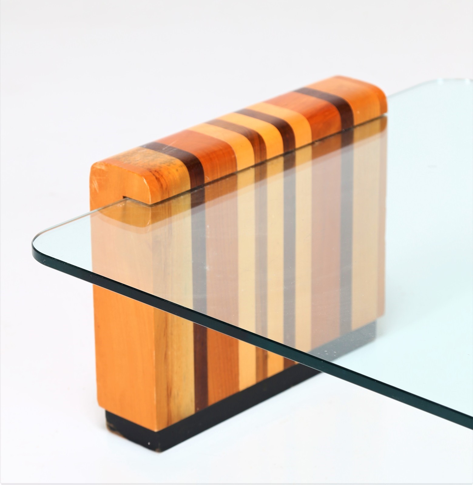 VIGNELLI MASSIMO (n. 1931) Attributed. Coffee table. Glass and wood.. Cm 125,00 x 31,00 x 68,00. Base in wood of various essences, glass top.