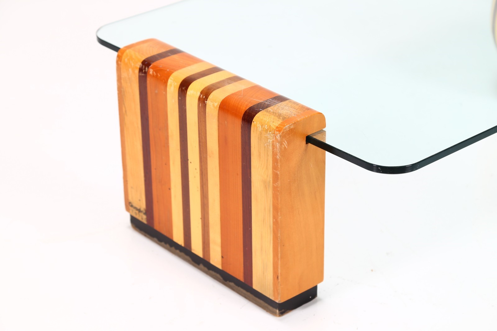 VIGNELLI MASSIMO (n. 1931) Attrib. Tavolino . Vetro e legno.. Cm 125,00 x 31,00 x 68,00. Base in legni di varie essenze, piano in cristallo.