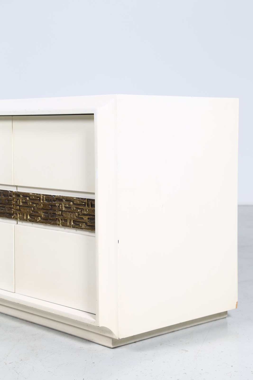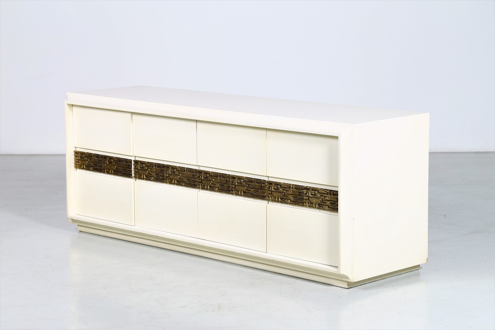 FRIGERIO LUCIANO Comò. Legno e bronzo. Cm 185,00 x 70,00 x 55,00. Struttura in legno laccato bianco e dettaglio centrale scultoreo in bronzo. Anni 60.