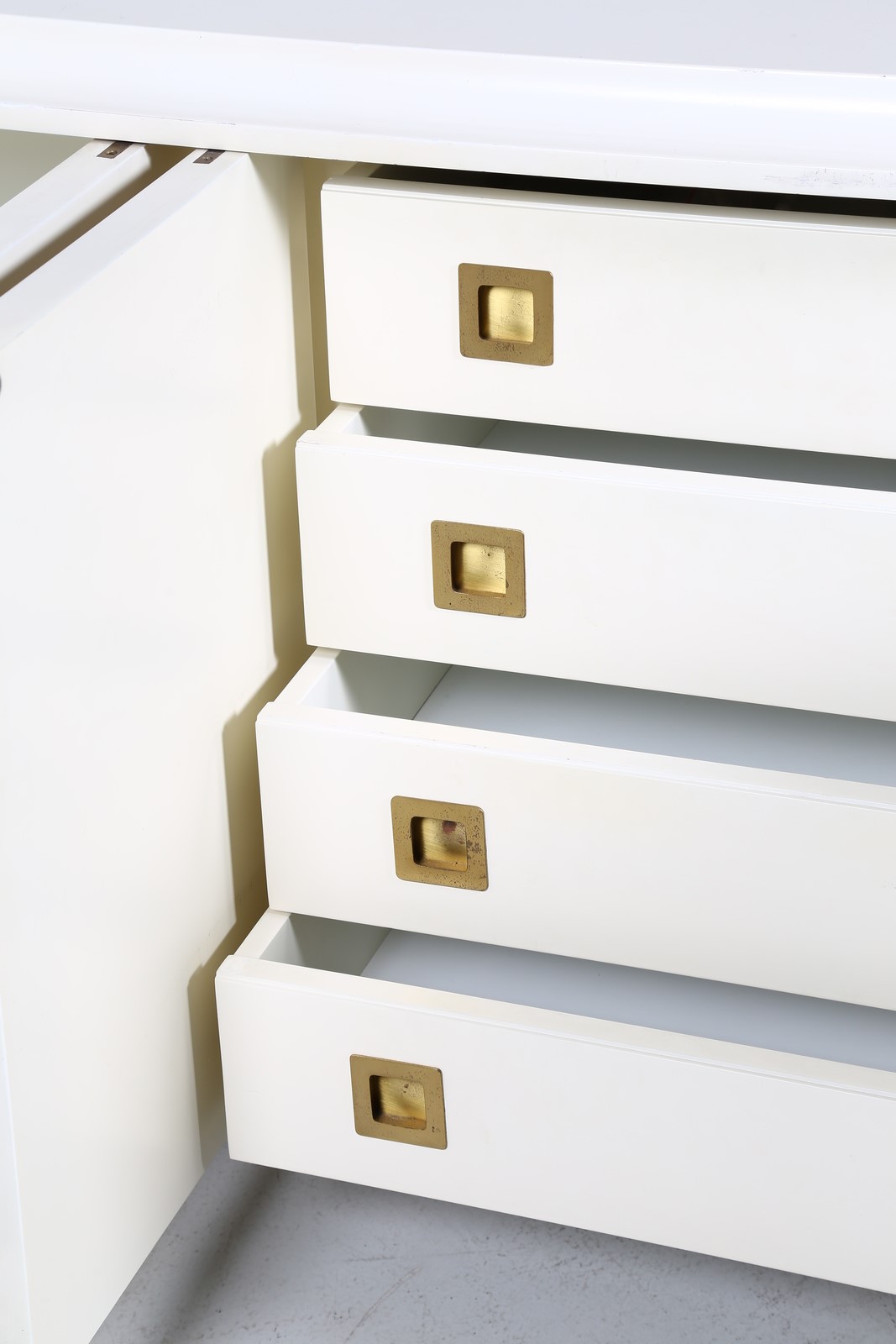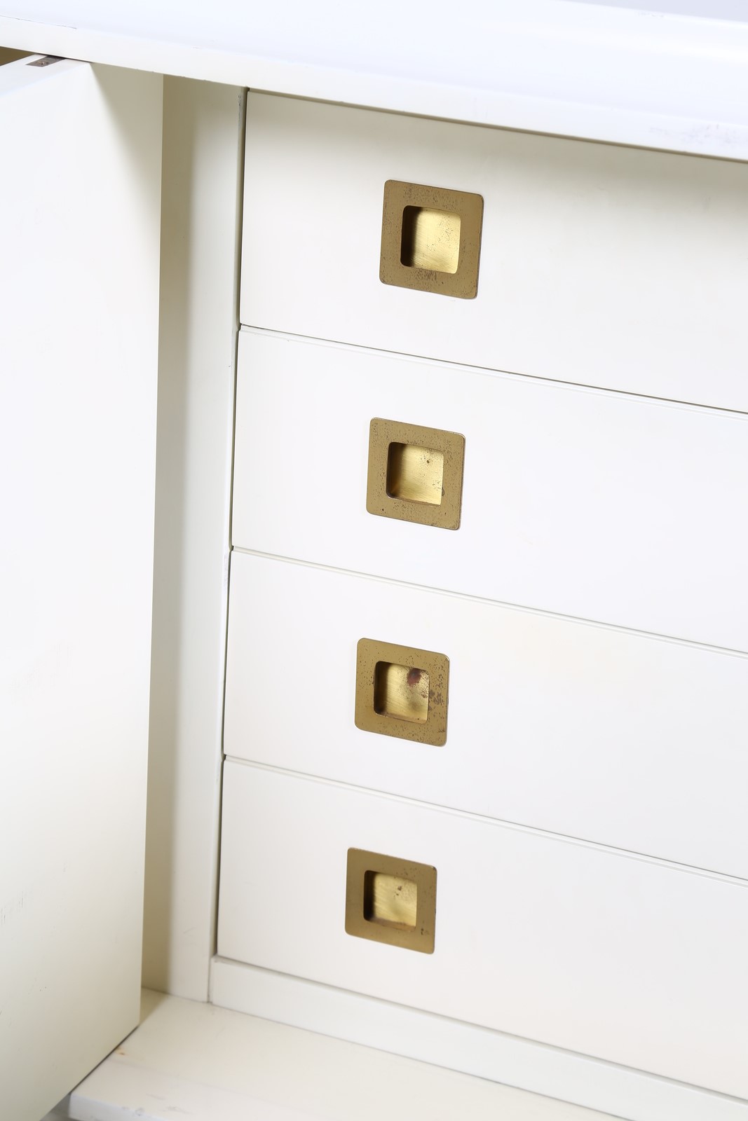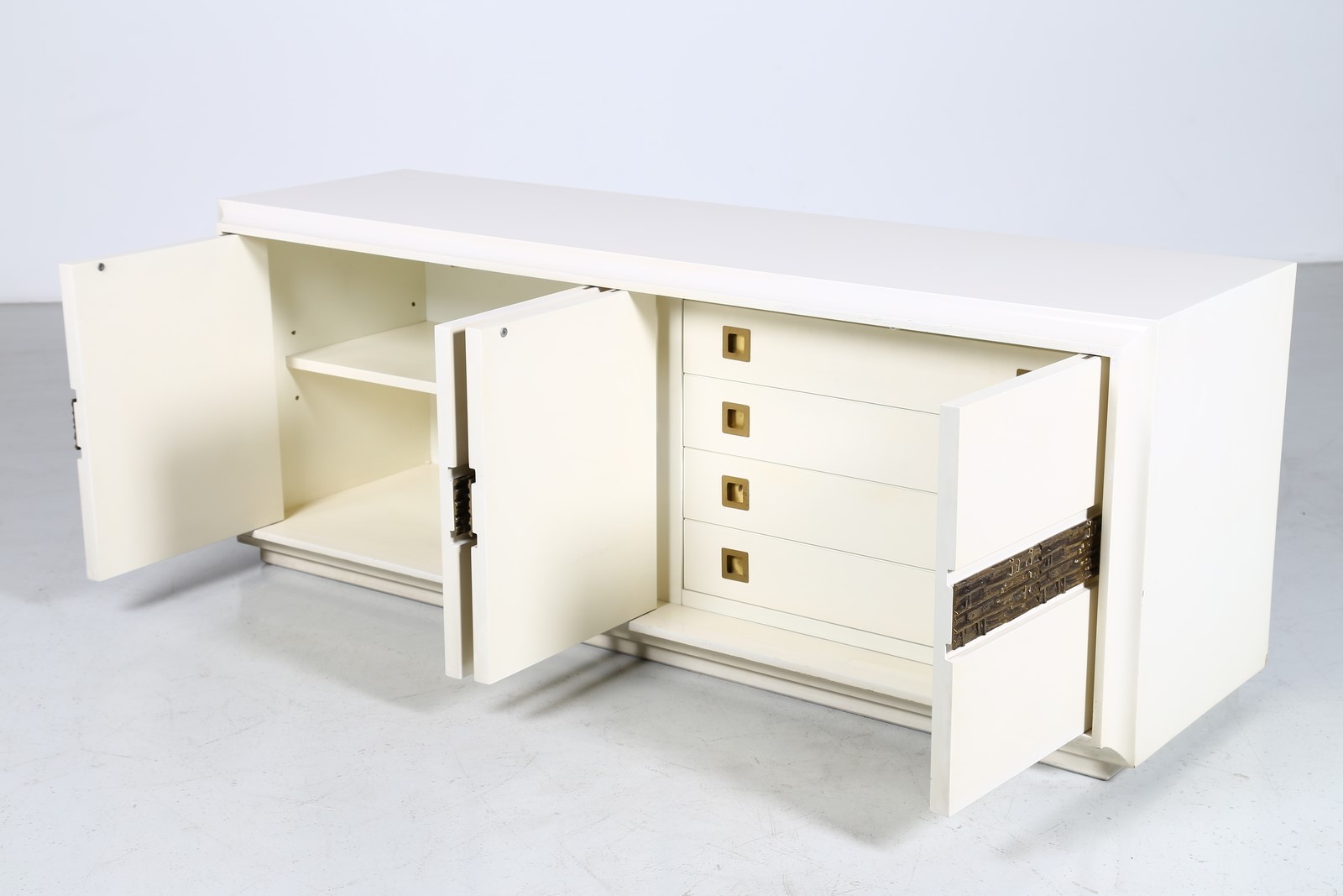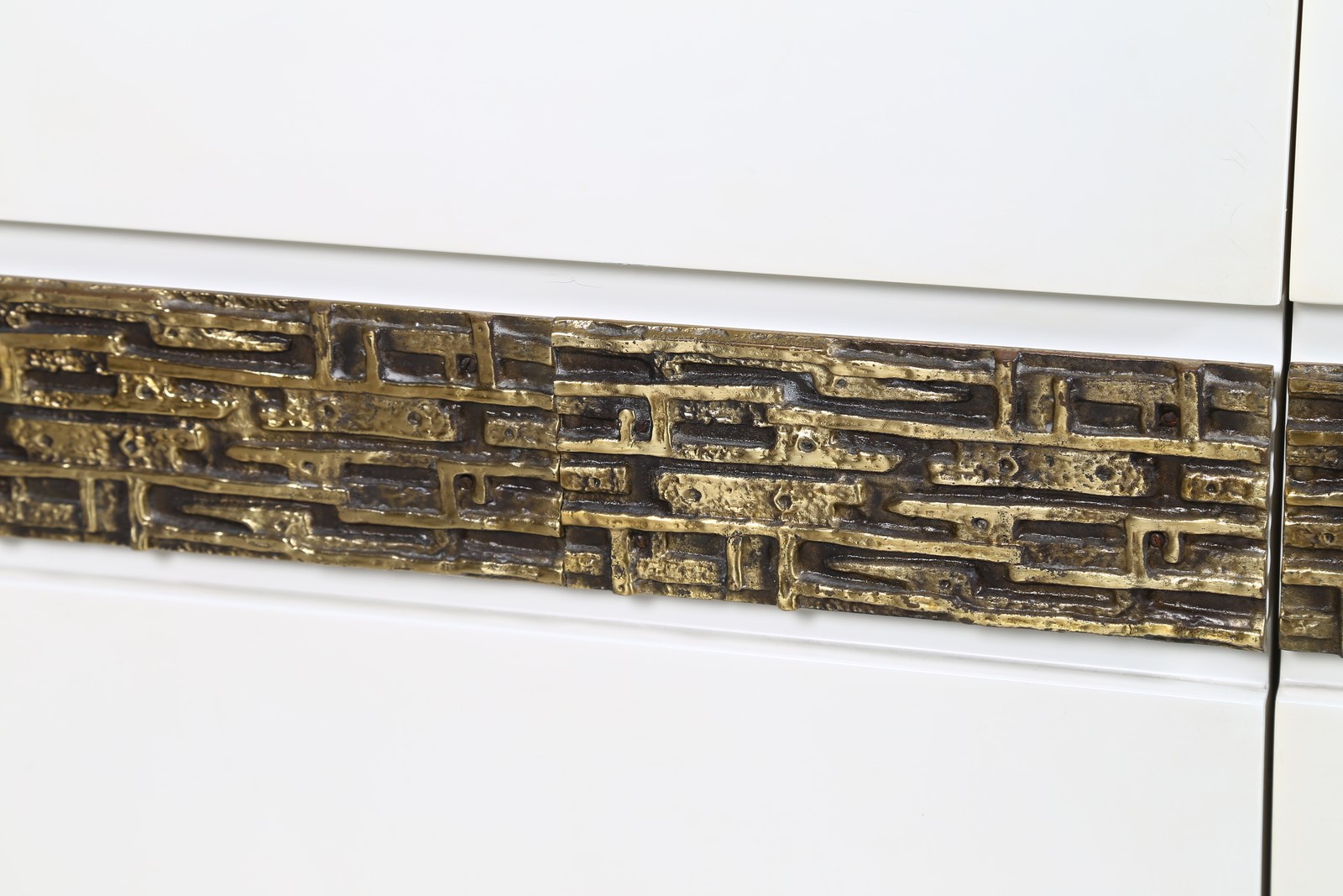 FRIGERIO LUCIANO Sideboard. Wood and bronze. Cm 185,00 x 70,00 x 55,00. Structure in white lacquered wood and bronze sculptural central detail. 60's.