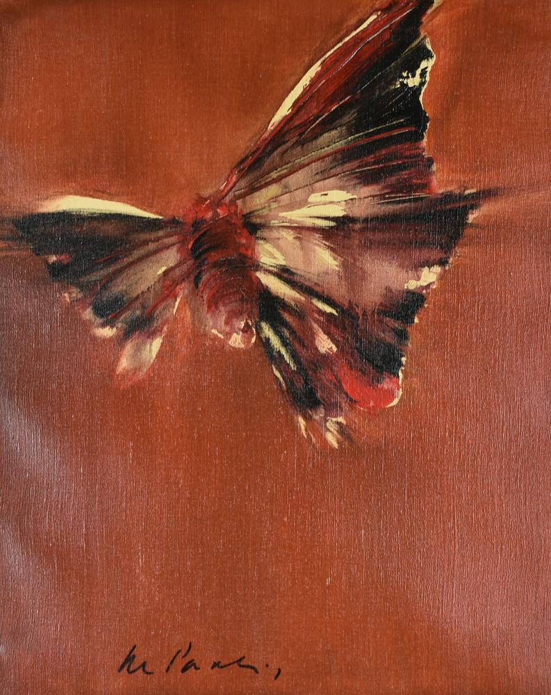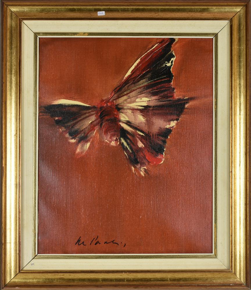 Lot 141 | Pietro De Paolis FARFALLA SU FONDO ARANCIONE olio su tela, cm 50x40 sul...
