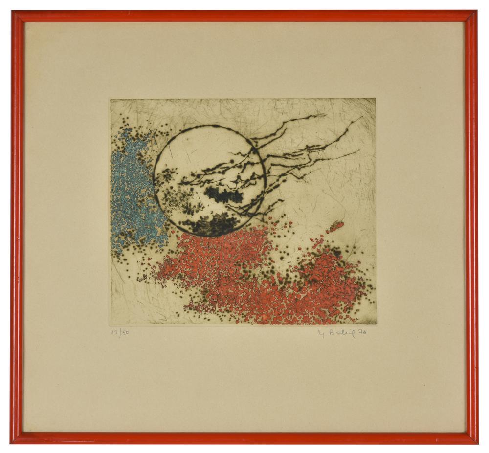 Yannick Balif SOLE SU FONDO ROSSO acquatinta a rilievo su carta, cm 38x40 (lastra cm 21x24) esemplare 27 su 50 sul fronte: firma e data eseguita nel 1976